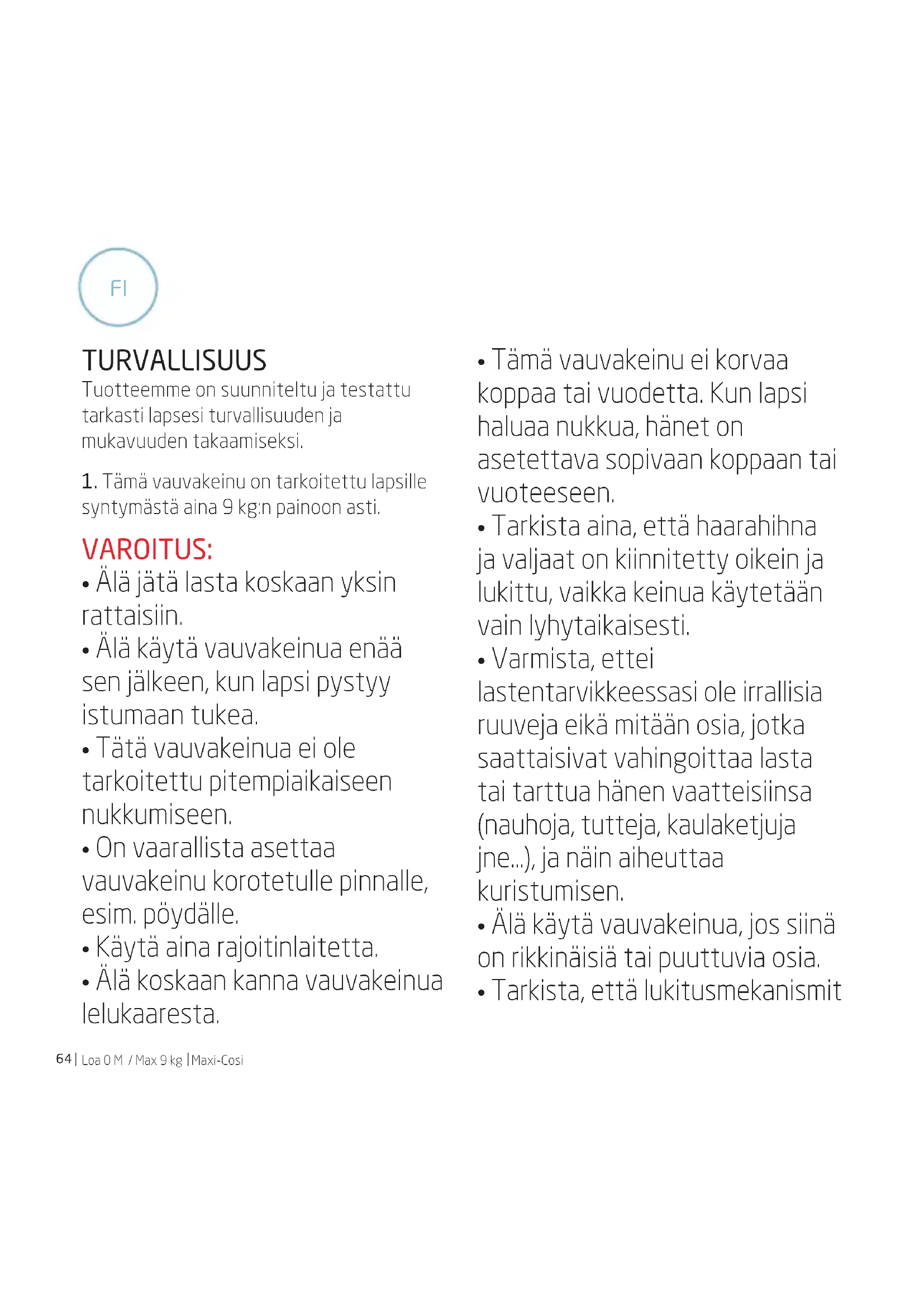 tarkoin, miten eri osat on sovitettu toisiinsa, jotta tuote olisi helpompi koota uudelleen. Ei saa silittää. Muista, että kaikki mekaaniset tuotteet ovat riippuvaisia säännöllisestä huollosta ja järkevästä käytöstä, jotta ne vastaisivat optimaalisesti odotuksia ja niillä olisi pitkä käyttöikä. Ympäristö Ympäristönsuojelun kannalta on tärkeää, että kun et enää käytä tätä tuotetta, hävität sen asianmukaisesti paikallisten määräysten mukaisesti. Kysyttävää Ota yhteys paikalliseen valtuutettuun jälleenmyyjään tai vieraile kotisivuillamme. Kun teet niin, pidä seuraavat tiedot saatavilla: - Sarjanumero - Lapsen ikä, pituus ja paino. Takuu 24 kuukauden takuumme on osoitus luottamuksestamme suunnittelumme ensiluokkaiseen laatuun, valmistukseen, tuotantoon ja tuotteen toimivuuteen. Takaamme, että tämä tuote on valmistettu voimassa olevien, tätä tuotetta koskevien eurooppalaisten turvallisuusvaatimusten ja laatustandardien mukaisesti, ja että tuotteessa ei ole ostohetkellä materiaali- tai valmistusvirheitä. Tässä mainittujen ehtojen mukaisesti kuluttajat voivat vedota takuuseen maissa, joissa tätä tuotetta on myyty Dorel-yritysryhmän tytäryhtiön, valtuutetun myyjän tai jälleenmyyjän toimesta. Myöntämämme 24 kuukauden takuu kattaa kaikki materiaali ja valmistusvirheet, olettaen että tuotetta on käytetty normaaliolosuhteissa ja toimittamamme käyttöohjeen mukaisesti.Takuu on voimassa 24 kuukauden ajan ostopäivämäärästä lukien. Jotta voit saada takuun alaisia korjaus- tai varaosapalveluita tuotteen mahdollisten materiaali- tai valmistusvirheiden vuoksi, sinun on esitettävä ostotosite, joka on päivätty huoltopyyntöä edeltävien 24 kuukauden aikana. FIMaxi-Cosi