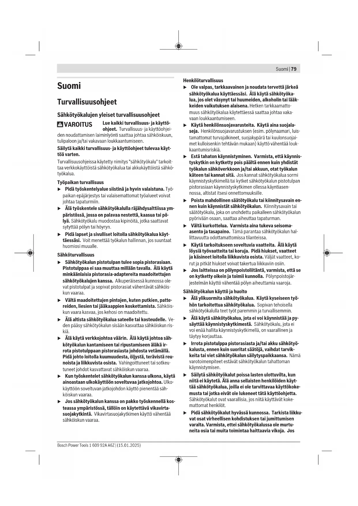 Tilbakeslagsutkobling Ved plutselig tilbakeslag på elektroverktøyet, for eksempel blokkering under fresing, avbrytes strømforsyningen til motoren elektronisk. For å slå på igjen setter du på-/av-bryteren (5) / (11) i utkoblet stilling og slår på elektroverktøyet på nytt. Beskyttelse mot ny innkobling Beskyttelsen mot ny innkobling forhindrer en kontrollert starting av elektroverktøyet etter avbrudd på strømtilførselen. For å slå på igjen setter du på-/av-bryteren (5) / (11) i utkoblet stilling og slår på elektroverktøyet på nytt. Merknad: Hvis det slås svært raskt og på igjen, kan det hende at gjenstartbeskyttelsen utløses og elektroverktøyet ikke starter selv om på-/av-bryteren (5)/(11) trykkes. Sett på-/av-bryteren (5)/(11) i utkoblet stilling, og slå på elektroverktøyet igjen. Mykstart Den elektroniske mykstarten begrenser dreiemomentet når verktøyet slås på og forlenger motorens levetid. Arbeidshenvisninger u Før alle arbeider på elektroverktøyet utføres må støpselet trekkes ut av stikkontakten. u Oppbevar slipeverktøyet slik at det er beskyttet mot støt. u Belast ikke elektroverktøyet så mye at det stopper. u La elektroverktøyet gå noen minutter på tomgang etter sterk belastning, slik at innsatsverktøyet avkjøles. u Slipeverktøyene blir svært varme under arbeidet. Ikke berør dem før de er avkjølt. Beveg slipeverktøyet med jevnt frem og tilbake med lett trykk for å oppnå et optimalt resultat. For stort trykk reduserer elektroverktøyets yteevne og fører til raskere slitasje på slipeskiven. Service og vedlikehold Vedlikehold og rengjøring u Før alle arbeider på elektroverktøyet utføres må støpselet trekkes ut av stikkontakten. u Hold selve elektroverktøyet og ventilasjonsspaltene alltid rene, for å kunne arbeide bra og sikkert. u Bruk om mulig et avsugsanlegg ved ekstreme forhold på arbeidsplassen. Blås ventilasjonsslissene rene ofte, og koble til en feilstrømvernebryter (PRCD). Ved bearbeidelse av metall kan det sette seg lededyktig støv inne i elektroverktøyet. Beskyttelsesisolasjonen til elektroverktøyet kan innskrenkes. Tilbehøret må lagres og behandles med omhu. Hvis det er nødvendig å skifte ut tilkoblingsledningen, må dette gjøres av Bosch eller godkjente Bosch- serviceverksteder, slik at det ikke oppstår fare for sikkerheten. Kundeservice og kundeveiledning Kundeservice hjelper deg ved spørsmål om reparasjon og vedlikehold av produktet ditt og reservedelene. Sprengskisser og informasjoner om reservedeler finner du også på: www.bosch‑pt.com Bosch rådgivningsteam står til tjeneste ved spørsmål om våre produkter og tilbehør til disse. Ved alle forespørsler og reservedelsbestillinger må du oppgi det 10‑sifrede produktnummeret som er angitt på produktets typeskilt. Norsk Robert Bosch AS Postboks 350 1402 Ski Tel.: 64 87 89 50 Faks: 64 87 89 55 Flere serviceadresser finner du på: www.bosch-pt.com/serviceaddresses Deponering Elektroverktøy, tilbehør og emballasje må leveres inn til miljøvennlig gjenvinning. Elektroverktøy må ikke kastes i vanlig søppel! Bare for land i EU: Elektroverktøy som ikke lenger er i brukbar stand, skal leveres til kildesortering. Bruk innsamlingssystemene som er beregnet for dette formålet. Ved usakkyndig kassering kan brukte elektriske og elektroniske apparater, hvis de inneholder farlige stoffer, ha skadelige utvirkninger på miljøet og den menneskelige helsen. 1 609 92A A6Z | (15.01.2025) Bosch Power ToolsSuomi | 79 Suomi Turvallisuusohjeet Sähkötyökalujen yleiset turvallisuusohjeet VAROITUS Lue kaikki turvallisuus- ja käyttö- ohjeet. Turvallisuus- ja käyttöohjei- den noudattamisen laiminlyönti saattaa johtaa sähköiskuun, tulipaloon ja/tai vakavaan loukkaantumiseen. Säilytä kaikki turvallisuus- ja käyttöohjeet tulevaa käyt- töä varten. Turvallisuusohjeissa käytetty nimitys "sähkötyökalu" tarkoit- taa verkkokäyttöistä sähkötyökalua tai akkukäyttöistä sähkö- työkalua. Työpaikan turvallisuus u Pidä työskentelyalue siistinä ja hyvin valaistuna. Työ- paikan epäjärjestys tai valaisemattomat työalueet voivat johtaa tapaturmiin. u Älä työskentele sähkötyökalulla räjähdysalttiissa ym- päristössä, jossa on palavaa nestettä, kaasua tai pö- lyä. Sähkötyökalu muodostaa kipinöitä, jotka saattavat sytyttää pölyn tai höyryn. u Pidä lapset ja sivulliset loitolla sähkötyökalua käyt- täessäsi. Voit menettää työkalun hallinnan, jos suuntaat huomiosi muualle. Sähköturvallisuus u Sähkötyökalun pistotulpan tulee sopia pistorasiaan. Pistotulppaa ei saa muuttaa millään tavalla. Älä käytä minkäänlaisia pistorasia-adaptereita maadoitettujen sähkötyökalujen kanssa. Alkuperäisessä kunnossa ole- vat pistotulpat ja sopivat pistorasiat vähentävät sähköis- kun vaaraa. u Vältä maadoitettujen pintojen, kuten putkien, patte- reiden, liesien tai jääkaappien koskettamista. Sähköis- kun vaara kasvaa, jos kehosi on maadoitettu. u Älä altista sähkötyökalua sateelle tai kosteudelle. Ve- den pääsy sähkötyökalun sisään kasvattaa sähköiskun ris- kiä. u Älä käytä verkkojohtoa väärin. Älä käytä johtoa säh- kötyökalun kantamiseen tai ripustamiseen äläkä ir- rota pistotulppaan pistorasiasta johdosta vetämällä. Pidä johto loitolla kuumuudesta, öljystä, terävistä reu- noista ja liikkuvista osista. Vahingoittuneet tai sotkeu- tuneet johdot kasvattavat sähköiskun vaaraa. u Kun työskentelet sähkötyökalun kanssa ulkona, käytä ainoastaan ulkokäyttöön soveltuvaa jatkojohtoa. Ulko- käyttöön soveltuvan jatkojohdon käyttö pienentää säh- köiskun vaaraa. u Jos sähkötyökalun kanssa on pakko työskennellä kos- teassa ympäristössä, tällöin on käytettävä vikavirta- suojakytkintä. Vikavirtasuojakytkimen käyttö vähentää sähköiskun vaaraa. Henkilöturvallisuus u Ole valpas, tarkkaavainen ja noudata tervettä järkeä sähkötyökalua 