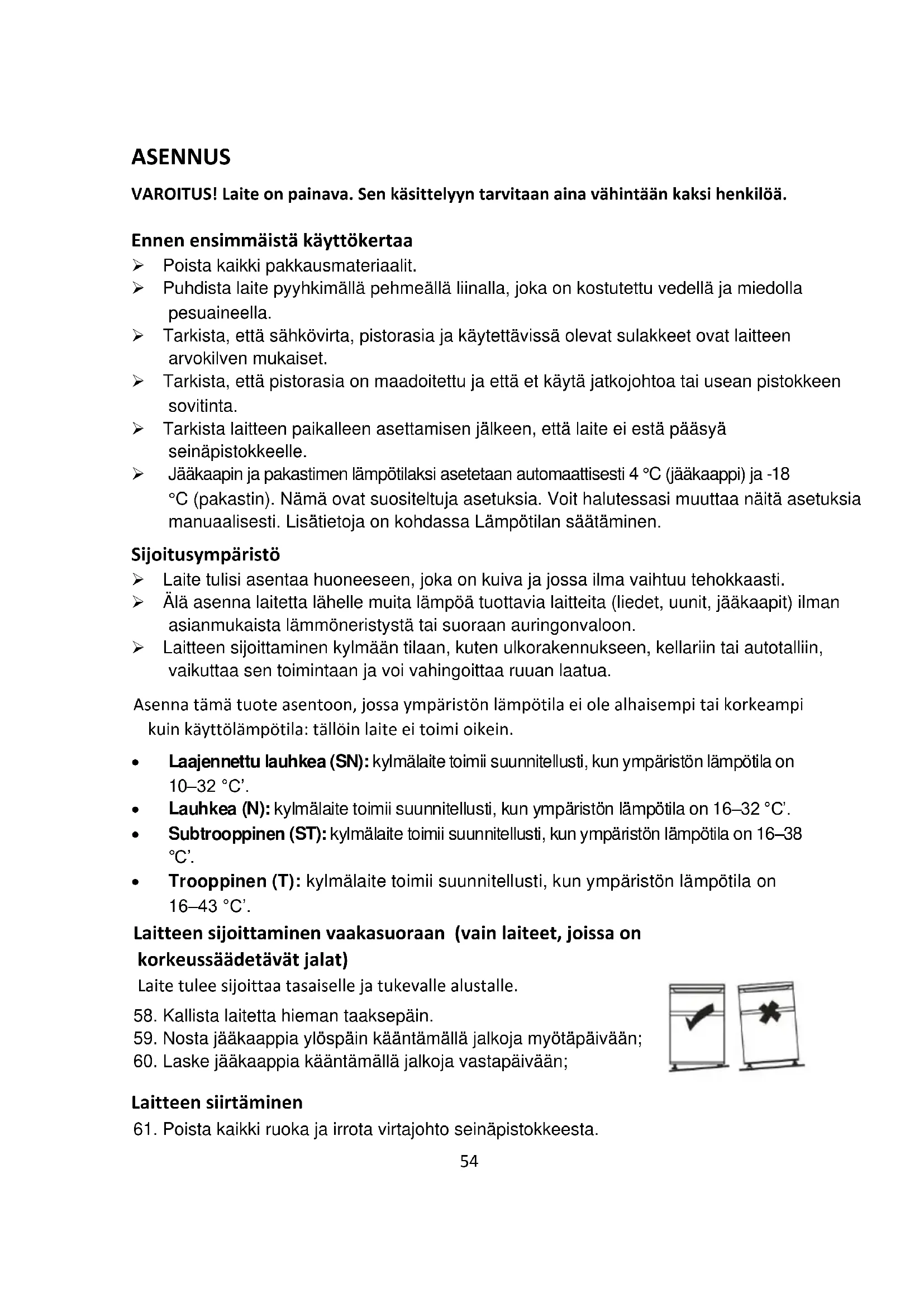 - Lauhkea (N): kylmälaite toimii suunnitellusti, kun ympäristön lämpötila on 16–32 °C’.