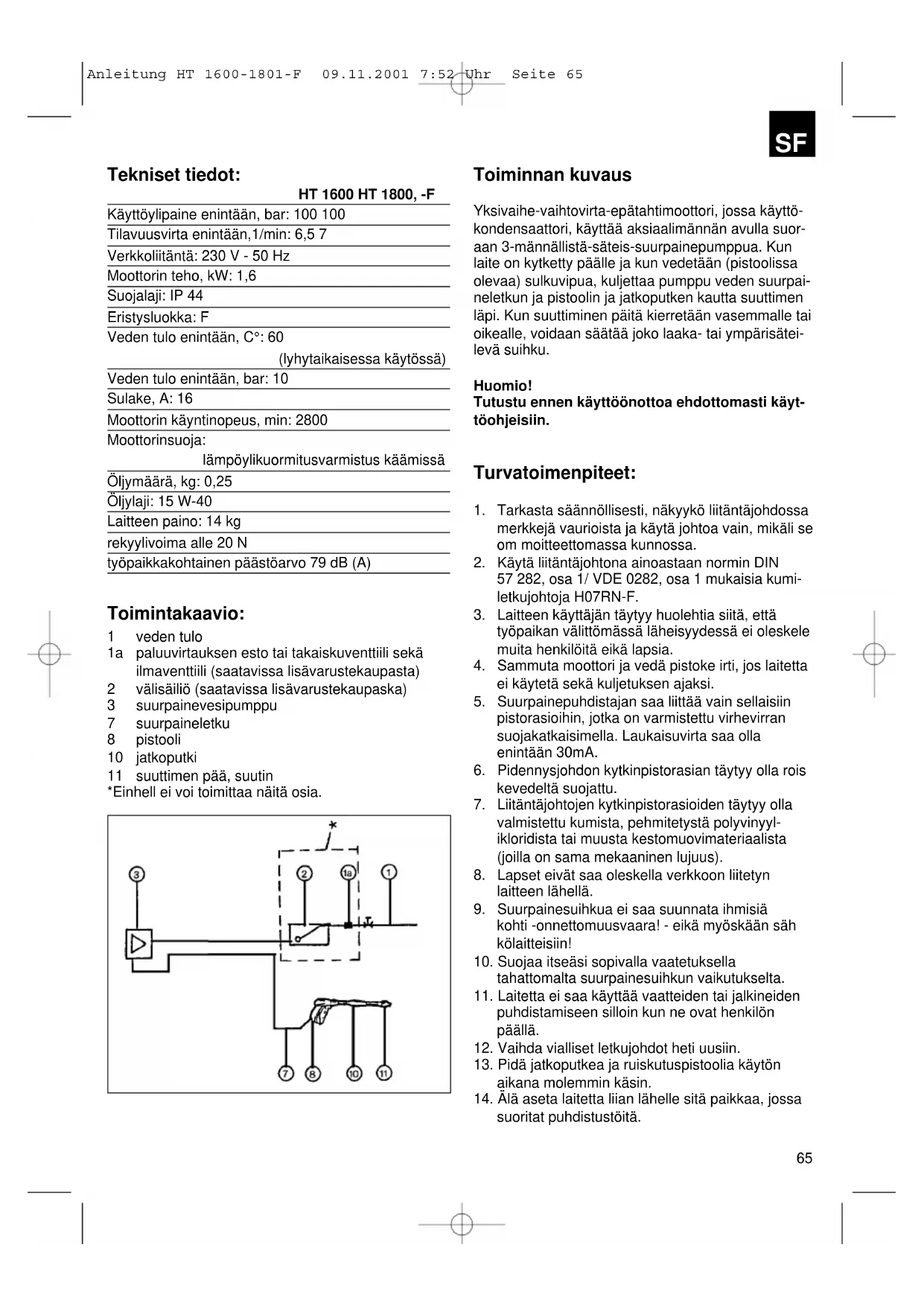 Tekniset tiedot: HT 1600 HT 1800, -F Käyttöylipaine enintään, bar: 100 100 Tilavuusvirta enintään,1/min: 6,5 7 Verkkoliitäntä: 230 V - 50 Hz Moottorin teho, kW: 1,6 Suojalaji: IP 44 Eristysluokka: F Veden tulo enintään, C°: 60 (lyhytaikaisessa käytössä) Veden tulo enintään, bar: 10 Sulake, A: 16 Moottorin käyntinopeus, min: 2800 Moottorinsuoja: lämpöylikuormitusvarmistus käämissä Öljymäärä, kg: 0,25 Öljylaji: 15 W-40 Laitteen paino: 14 kg rekyylivoima alle 20 N työpaikkakohtainen päästöarvo 79 dB (A) Toimintakaavio: 1 veden tulo 1a paluuvirtauksen esto tai takaiskuventtiili sekä ilmaventtiili (saatavissa lisävarustekaupasta) 2 välisäiliö (saatavissa lisävarustekaupaska) 3 suurpainevesipumppu 7 suurpaineletku 8 pistooli 10 jatkoputki 11 suuttimen pää, suutin *Einhell ei voi toimittaa näitä osia. Toiminnan kuvaus Yksivaihe-vaihtovirta-epätahtimoottori, jossa käyttö- kondensaattori, käyttää aksiaalimännän avulla suor- aan 3-männällistä-säteis-suurpainepumppua. Kun laite on kytketty päälle ja kun vedetään (pistoolissa olevaa) sulkuvipua, kuljettaa pumppu veden suurpai- neletkun ja pistoolin ja jatkoputken kautta suuttimen läpi. Kun suuttiminen päitä kierretään vasemmalle tai oikealle, voidaan säätää joko laaka- tai ympärisätei- levä suihku. Huomio! Tutustu ennen käyttöönottoa ehdottomasti käyt- töohjeisiin. Turvatoimenpiteet: