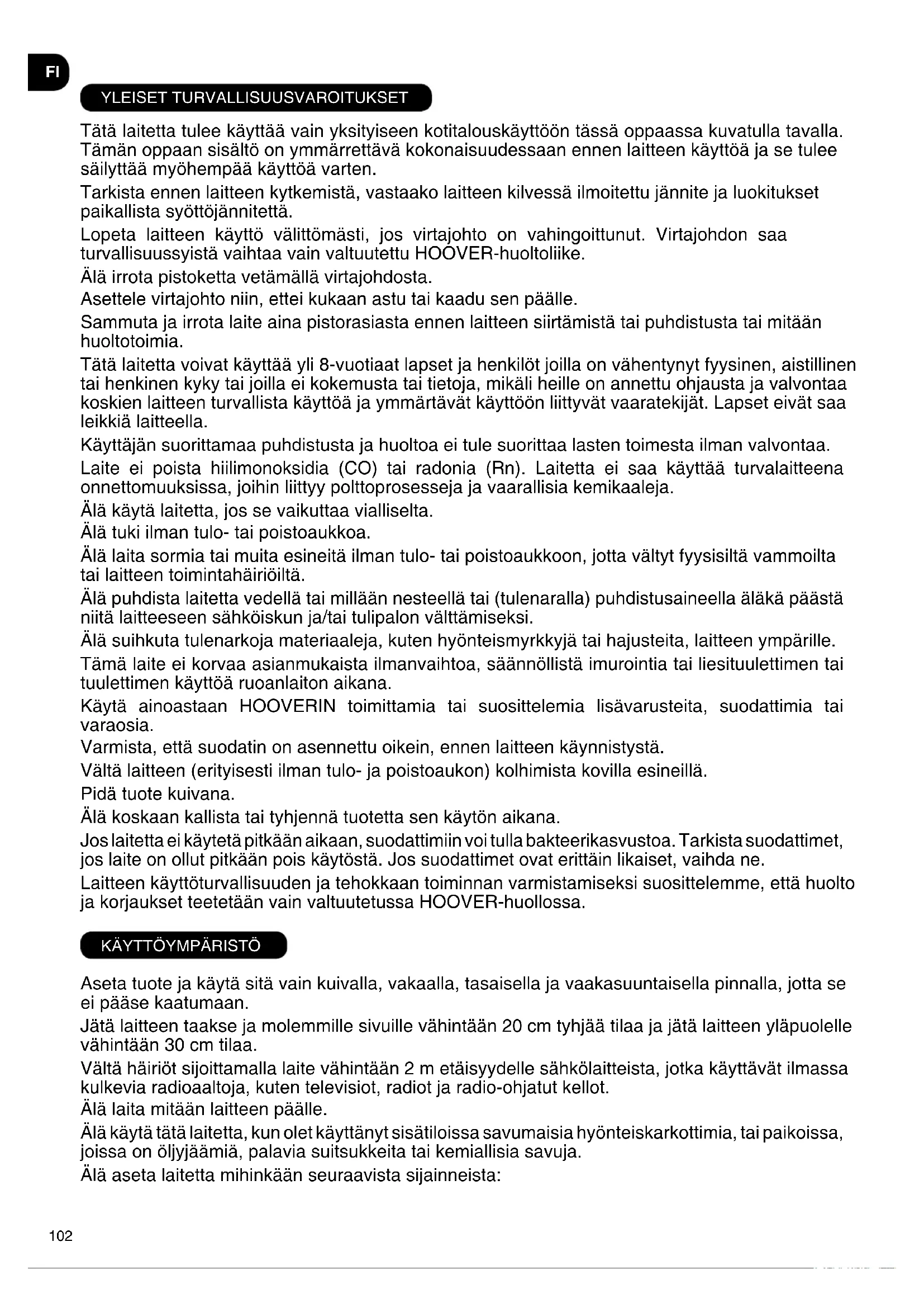 YLEISET TURVALLISUUSVAROITUKSET Tätä laitetta tulee käyttää vain yksityiseen kotitalouskäyttöön tässä oppaassa kuvatulla tavalla. Tämän oppaan sisältö on ymmärrettävä kokonaisuudessaan ennen laitteen käyttöä ja se tulee säilyttää myöhempää käyttöä varten. Tarkista ennen laitteen kytkemistä, vastaako laitteen kilvessä ilmoitettu jännite ja luokitukset paikallista syöttöjännitettä. Lopeta laitteen käyttö välittömästi, jos virtajohto on vahingoittunut. Virtajohdon saa turvallisuussyistä vaihtaa vain valtuutettu HOOVER-huoltoliike. Älä irrota pistoketta vetämällä virtajohdosta. Asettele virtajohto niin, ettei kukaan astu tai kaadu sen päälle. Sammuta ja irrota laite aina pistorasiasta ennen laitteen siirtämistä tai puhdistusta tai mitään huoltotoimia. Tätä laitetta voivat käyttää yli 8-vuotiaat lapset ja henkilöt joilla on vähentynyt fyysinen, aistillinen tai henkinen kyky tai joilla ei kokemusta tai tietoja, mikäli heille on annettu ohjausta ja valvontaa koskien laitteen turvallista käyttöä ja ymmärtävät käyttöön liittyvät vaaratekijät. Lapset eivät saa leikkiä laitteella. Käyttäjän suorittamaa puhdistusta ja huoltoa ei tule suorittaa lasten toimesta ilman valvontaa. Laite ei poista hiilimonoksidia (CO) tai radonia (Rn). Laitetta ei saa käyttää turvalaitteena onnettomuuksissa, joihin liittyy polttoprosesseja ja vaarallisia kemikaaleja. Älä käytä laitetta, jos se vaikuttaa vialliselta. Älä tuki ilman tulo- tai poistoaukkoa. Älä laita sormia tai muita esineitä ilman tulo- tai poistoaukkoon, jotta vältyt fyysisiltä vammoilta tai laitteen toimintahäiriöiltä. Älä puhdista laitetta vedellä tai millään nesteellä tai (tulenaralla) puhdistusaineella äläkä päästä niitä laitteeseen sähköiskun ja/tai tulipalon välttämiseksi. Älä suihkuta tulenarkoja materiaaleja, kuten hyönteismyrkkyjä tai hajusteita, laitteen ympärille. Tämä laite ei korvaa asianmukaista ilmanvaihtoa, säännöllistä imurointia tai liesituulettimen tai tuulettimen käyttöä ruoanlaiton aikana. Käytä ainoastaan HOOVERIN toimittamia tai suosittelemia lisävarusteita, suodattimia tai varaosia. Varmista, että suodatin on asennettu oikein, ennen laitteen käynnistystä. Vältä laitteen (erityisesti ilman tulo- ja poistoaukon) kolhimista kovilla esineillä. Pidä tuote kuivana. Älä koskaan kallista tai tyhjennä tuotetta sen käytön aikana. Jos laitetta ei käytetä pitkään aikaan, suodattimiin voi tulla bakteerikasvustoa. Tarkista suodattimet, jos laite on ollut pitkään pois käytöstä. Jos suodattimet ovat erittäin likaiset, vaihda ne. Laitteen käyttöturvallisuuden ja tehokkaan toiminnan varmistamiseksi suosittelemme, että huolto ja korjaukset teetetään vain valtuutetussa HOOVER-huollossa.