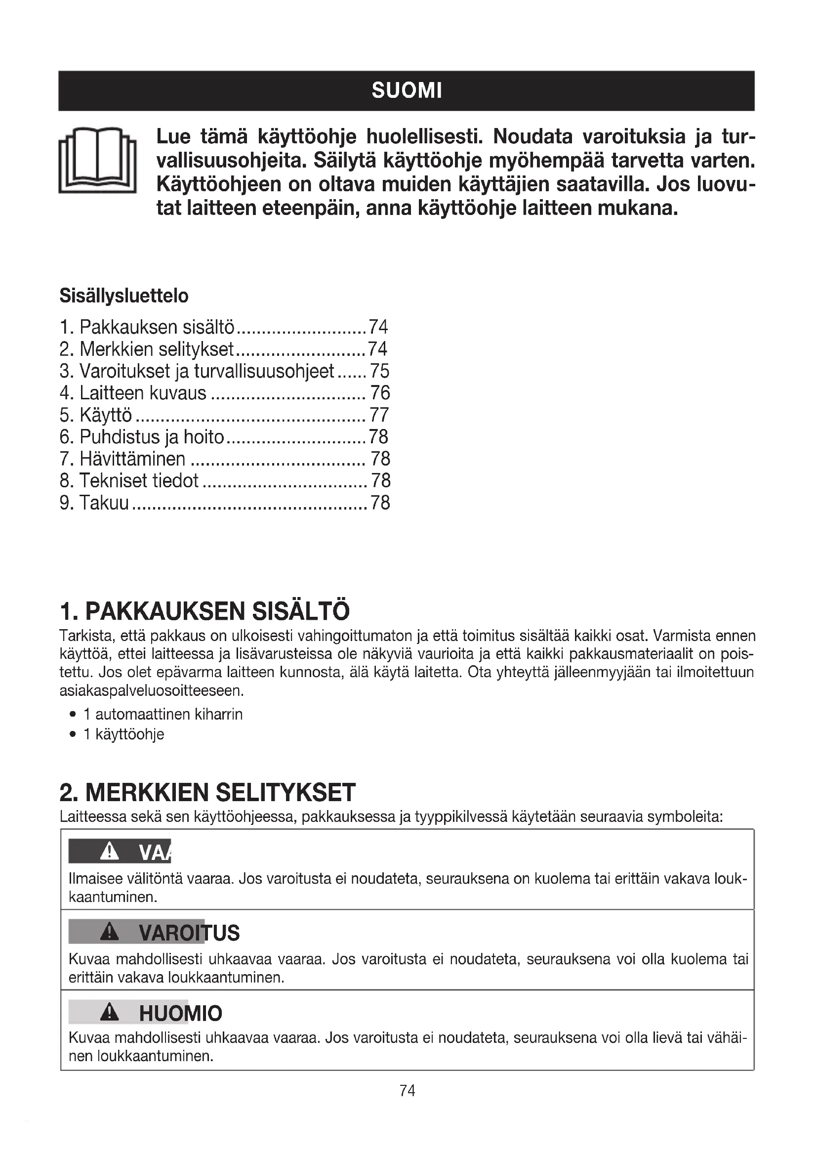 Laitteessa sekä sen käyttöohjeessa, pakkauksessa ja tyyppikilvessä käytetään seuraavia symboleita: VAARA Ilmaisee välitöntä vaaraa Jos varoitusta ei noudateta, seurauksena on kuolema tai erittäin vakava louk- kaantuminen VAROITUS Kuvaa mahdollisesti uhkaavaa vaaraa Jos varoitusta ei noudateta, seurauksena voi olla kuolema tai erittäin vakava loukkaantuminen HUOMIO Kuvaa mahdollisesti uhkaavaa vaaraa Jos varoitusta ei noudateta, seurauksena voi olla lievä tai vähäi- nen loukkaantuminen 1 Pakkauksen sisältö 74 2 Merkkien selitykset 74 3 Varoitukset ja turvallisuusohjeet 75 4 Laitteen kuvaus 76 5 Käyttö 77 6 Puhdistus ja hoito 78 7 Hävittäminen 78 8 Tekniset tiedot 78 9 Takuu 78 SUOMI Sisällysluettelo75 HUOMAUTUS Kuvaa mahdollisesti haitallista tilannetta Jos varoitusta ei noudateta, laite tai jokin sen ympäristössä oleva voi vaurioitua Vaara Laitetta ei saa käyttää vedessä tai veden läheisyydessä (esim käsien