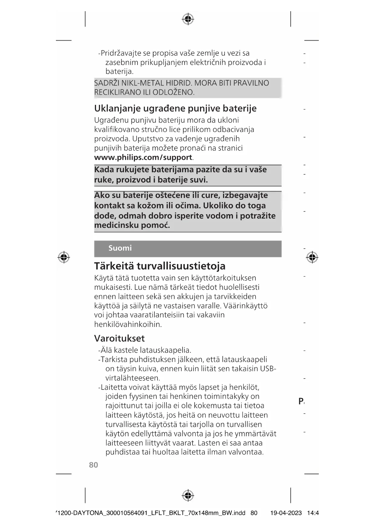 Käytä tätä tuotetta vain sen käyttötarkoituksen mukaisesti. Lue nämä tiedot huolellisesti ennen laitteen sekä sen akkujen ja tarvikkeiden käyttöä ja HY1200-DAYTONA_300010564091_LFLT_BKLT_70x148mm_BW.indd 80HY1200-DAYTONA_300010564091_LFLT_BKLT_70x148mm_BW.indd 80 19-04-2023 14:4919-04-2023 14:4981 - Pridržavajte se propisa vaše zemlje u vezi sa zasebnim prikupljanjem električnih proizvoda i baterija. SADRŽI NIKL-METAL HIDRID. MORA BITI PRAVILNO RECIKLIRANO ILI ODLOŽENO. Uklanjanje ugrađene punjive baterije Ugrađenu punjivu bateriju mora da ukloni kvalikovano stručno lice prilikom odbacivanja proizvoda. Uputstvo za vađenje ugrađenih punjivih baterija možete pronaći na stranici www.philips.com/support. Kadarukujetebaterijamapazitedasuivaše ruke,proizvodibaterijesuvi. Akosubaterijeoštećeneilicure,izbegavajte kontaktsakožomiliočima.Ukolikodotoga dođe,odmahdobroisperitevodomipotražite medicinskupomoć. Suomi Tärkeitäturvallisuustietoja Käytä tätä tuotetta vain sen käyttötarkoituksen mukaisesti. Lue nämä tärkeät tiedot huolellisesti ennen laitteen sekä sen akkujen ja tarvikkeiden käyttöä ja säilytä ne vastaisen varalle. Väärinkäyttö voi johtaa vaaratilanteisiin tai vakaviin henkilövahinkoihin. Varoitukset - Älä kastele latauskaapelia. - Tarkista puhdistuksen jälkeen, että latauskaapeli on täysin kuiva, ennen kuin liität sen takaisin USB- virtalähteeseen. - Laitetta voivat käyttää myös lapset ja henkilöt, joiden fyysinen tai henkinen toimintakyky on rajoittunut tai joilla ei ole kokemusta tai tietoa laitteen käytöstä, jos heitä on neuvottu laitteen turvallisesta käytöstä tai tarjolla on turvallisen käytön edellyttämä valvonta ja jos he ymmärtävät laitteeseen liittyvät vaarat. Lasten ei saa antaa puhdistaa tai huoltaa laitetta ilman valvontaa. - Lasten ei pidä leikkiä laitteella. - Käytä vain alkuperäisiä Philipsin tarvikkeita tai kulutustarvikkeita. Käytä tuotteen mukana toimitettua latauskaapelia vain 5 V:n syöttövirralla. Käytä vain alkuperäistä USB-virtalähdettä, jos se on toimitettu tuotteen mukana. - Laite on tarkoitettu henkilökohtaiseen käyttöön eikä sitä ole tarkoitettu potilaiden yleiseen käyttöön hammashoitoloissa tai sairaaloissa. - Laitteessa ei ole käyttäjän huollettavissa olevia osia. Jos laite on vahingoittunut, lopeta sen käyttö ota yhteyttä maasi kuluttajapalvelukeskukseen. - Älä käytä laturia lämmönlähteiden lähellä. - Älä puhdista mitään tuotteen osaa astianpesukoneessa. - Laite on suunniteltu ainoastaan hampaiden, ikenien ja kielen puhdistamiseen. - Lopeta harjaspään käyttö, jos ilmenee katkenneita tai taipuneita harjaksia. Vaihda harjaspää 3 kuukauden välein tai useammin, jos ilmenee merkkejä kulumisesta. - Vältä suoraa kosketusta tuotteisiin, jotka sisältävät eteerisiä öljyjä tai kookosöljyä. Niiden koskettaminen voi johtaa harjasten irtoamiseen. - Lopeta laitteen käyttö ja kysy neuvoa hammaslääkäriltä tai lääkäriltä, jos käytön jälkeen ilmenee voimakasta verenvuotoa, jos verenvuoto jatkuu viikon käytön jälkeen tai jos laitteen käyttö tuntuu epämukavalta tai aiheuttaa kipua. - Jos olet ollut hammas- tai ienleikkauksessa viimeisten kahden kuukauden aikana, kysy neuvoa hammaslääkäriltä ennen laitteen käyttöä. - Jos sinulla on sydämentahdistin tai muu kehonsisäinen laite, kysy neuvoa lääkäriltä tai kyseisen laitteen valmistajalta ennen käyttöä. - Jos epäröit käyttää laitetta terveydellisistä syistä, neuvottele laitteen käytöstä ensin lääkärin kanssa. Paristojen ja akkujen turvallisuusohjeet - Tässä laitteessa on akkuja, jotka voi poistaa vain ammattilainen. - Käytä tätä tuotetta vain sen käyttötarkoituksen mukaisesti. Lue nämä tiedot huolellisesti ennen laitteen sekä sen akkujen ja tarvikkeiden käyttöä ja HY1200-DAYTONA_300010564091_LFLT_BKLT_70x148mm_BW.indd 81HY1200-DAYTONA_300010564091_LFLT_BKLT_70x148mm_BW.indd 81 19-04-2023 14:4919-04-2023 14:4982 säilytä ne vastaisen varalle. Väärinkäyttö voi johtaa vaaratilanteisiin tai vakaviin henkilövahinkoihin. Toimitukseen sisältyvät tarvikkeet voivat vaihdella tuotekohtaisesti. - Suojaa tuote ja akut tulelta äläkä altista niitä suoralle auringonvalolle tai korkeille lämpötiloille. - Jos tuote kuumenee epätavallisen paljon, siitä tulee hajua, se muuttaa väriä tai jos lataaminen kestää tavallista pidempään, lopeta tuotteen käyttö ja lataaminen ja ota yhteyttä Philipsiin. - Älä laita tuotteita ja niiden paristoja tai akkuja mikroaaltouuneihin tai induktioliesille. - Älä avaa, muuta, puhkaise, vahingoita tai pura tuotetta tai akkuja, sillä tämä saattaa aiheuttaa niiden ylikuumenemisen tai myrkyllisiä tai vaarallisia vuotoja niistä. Älä aiheuta akkuihin oikosulkua, ylilataa niitä tai lataa niitä käänteisesti. - Tämän laitteen akkuja ei voi vaihtaa. Kun akku on kulunut loppuun, laite on hävitettävä asianmukaisesti. Perehdy kierrätystä käsittelevään osioon. Säilytys ja kuljetus Lämpötila -10–60 °C. Sähkömagneettiset kentät (EMF) Tämä Philips-laite vastaa kaikkia sähkömagneettisia kenttiä (EMF) koskevia standardeja ja säännöksiä. Merkkien selitykset Tuotteessa voi olla seuraavanlaisia merkkejä: - Lue Käyttäjän opas (kuva 1). - Irrotettava virtalähde Osa (kuva 2):”xxxxxx” osoittaa käytettävien hyväksyttyjen latureiden mallinumeron. Tuki Käy kaikissa tuotetukiasioissa ja lue usein kysytyt kysymykset osoitteessa www.philips.com/support. Kierrätys - Tämä merkki tarkoittaa sitä, että sähkölaitteita ja akkuja ei saa hävittää tavallisen kotitalousjätteen mukana (kuva 3).