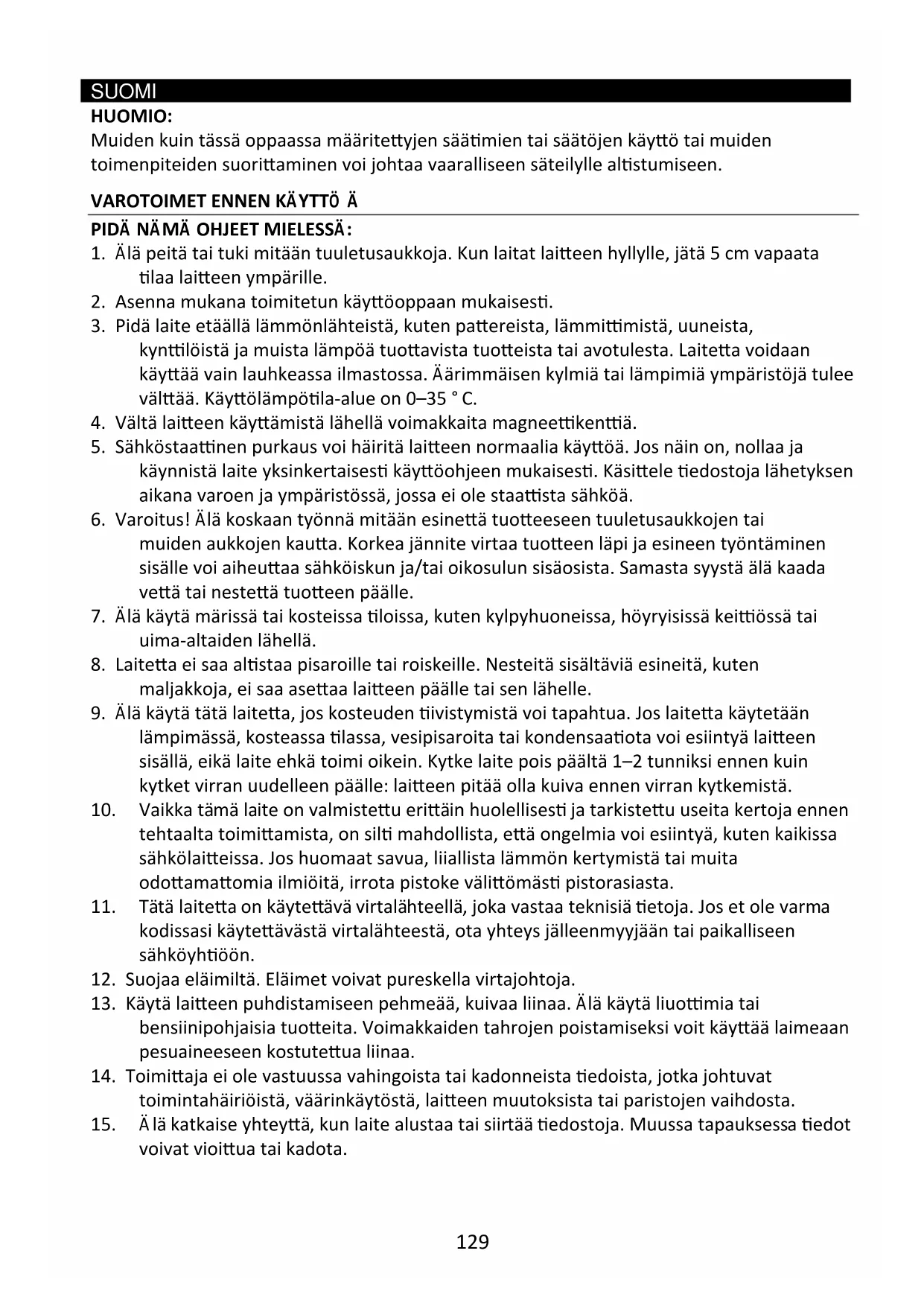 9. Älä käytä tätä laitetta, jos kosteuden tiivistymistä voi tapahtua. Jos laitetta käytetään