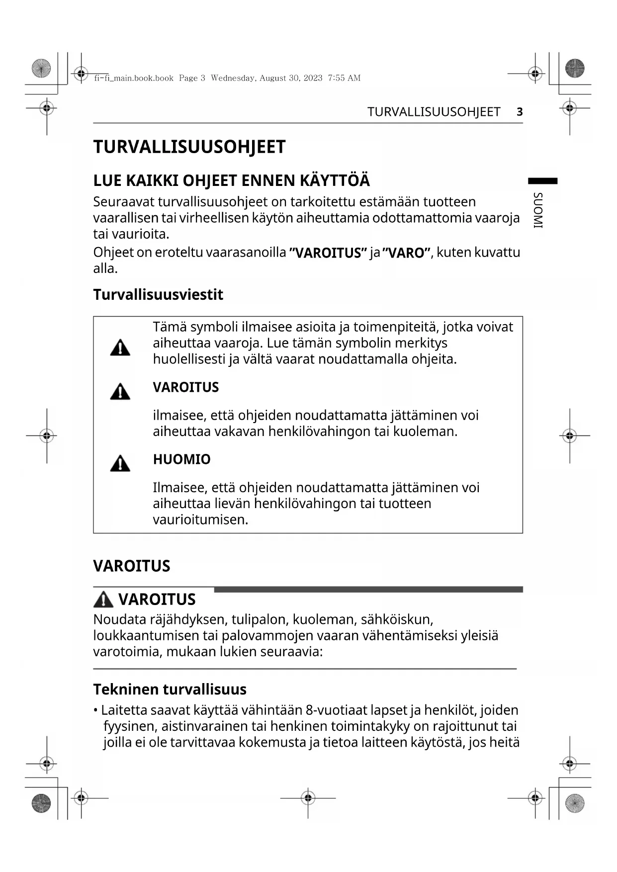 - Laitetta saavat käyttää vähintään 8-vuotiaat lapset ja henkilöt, joiden fyysinen, aistinvarainen tai henkinen toimintakyky on rajoittunut tai joilla ei ole tarvittavaa kokemusta ja tietoa laitteen käytöstä, jos heitä Tämä symboli ilmaisee asioita ja toimenpiteitä, jotka voivat aiheuttaa vaaroja. Lue tämän symbolin merkitys huolellisesti ja vältä vaarat noudattamalla ohjeita. VAROITUS ilmaisee, että ohjeiden noudattamatta jättäminen voi aiheuttaa vakavan henkilövahingon tai kuoleman. HUOMIO Ilmaisee, että ohjeiden noudattamatta jättäminen voi aiheuttaa lievän henkilövahingon tai tuotteen vaurioitumisen. fi-fi_main.book.book Page 3 Wednesday, August 30, 2023 7:55 AM4 TURVALLISUUSOHJEET valvotaan tai opastetaan laitteen turvalliseen käyttöön, ja he ymmärtävät käyttöön liittyvät vaarat. Lapset eivät saa leikkiä laitteella. Lapset eivät saa tehdä puhdistus- tai kunnossapitotoimenpiteitä ilman valvontaa.