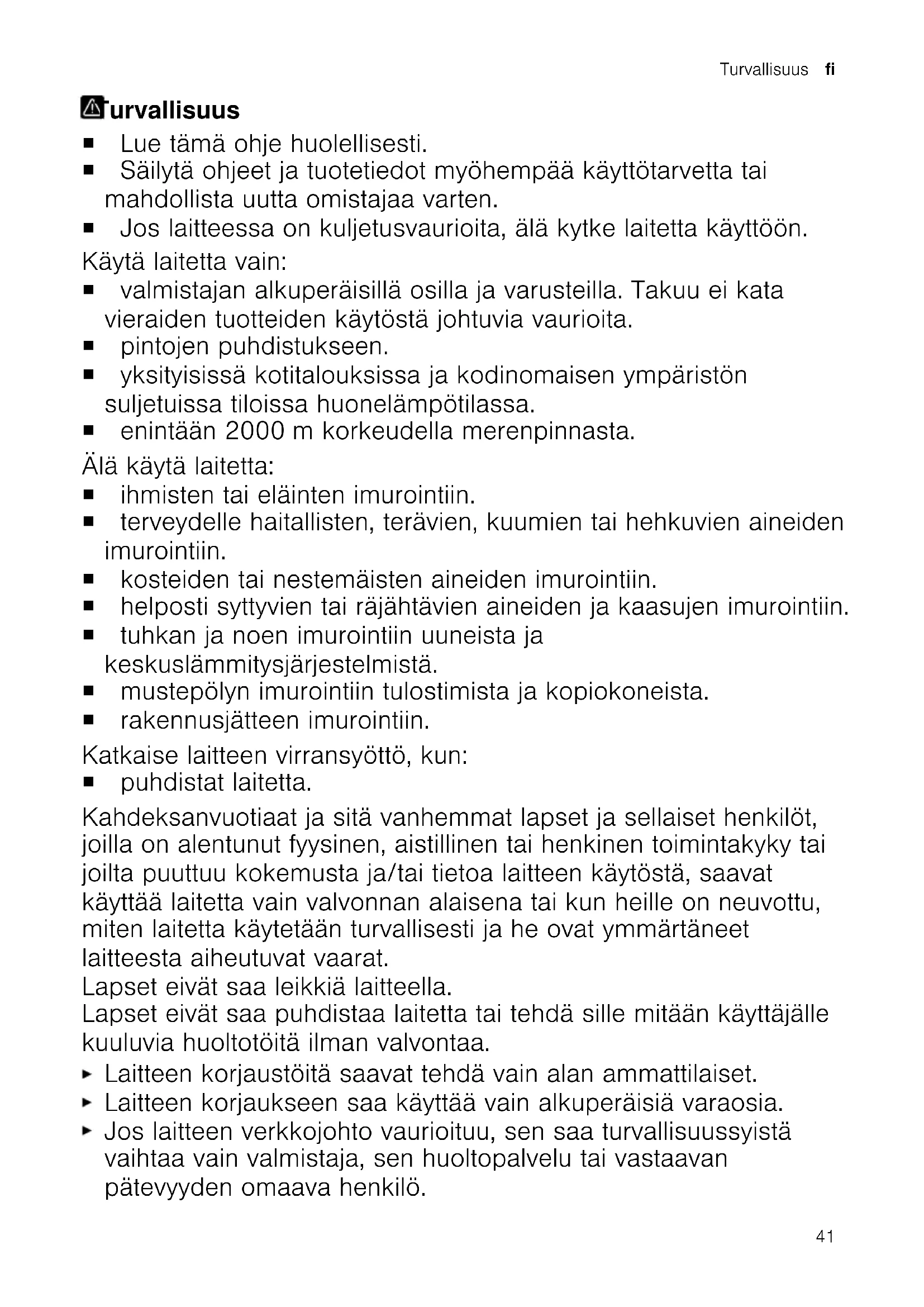 Allt efter apparatens utrustning 39sv Information om ekodesignförordningen Utförligare information om garantitid och -villkor i ditt land hittar du med QR-koden på medföljande dokument map. service- kontakter och garantivillkor, hos service, återförsäljare eller på vår webbsajt. Service kontaktinfo hittar du med QR-koden på medföljande dokument map. service- kontakter och garantivillkor eller på vår webbsajt. Information enligt förordning (EU) 2023/826 hittar du online under www.bosch-home.com på enhetens pro- dukt- och servicesida bland bruksanvis- ningar och övrig dokumentation. Information om ekodesignförordningenInformation om ekodesignför- ordningen Dammsugaren är hemdammsugare som klassas som universaldammsugare. Använd det ställbara universalmunstycket vid dammsugning av heltäckningsmattor. Använd ev. medföljande munstycke för hår- da golv vid dammsugning av hårda golv och testspringor. Enhetens uppgifter map. prestanda base- ras på mät- och beräkningsmetoder enligt förordning (EU) nr666/2013 och standar- der EN60312-1, EN60704-2-1, EN60335-2-2. 40Turvallisuus fi Turvallisuus Turvallisuus ¡ Lue tämä ohje huolellisesti. ¡ Säilytä ohjeet ja tuotetiedot myöhempää käyttötarvetta tai mahdollista uutta omistajaa varten. ¡ Jos laitteessa on kuljetusvaurioita, älä kytke laitetta käyttöön. Käytä laitetta vain: ¡ valmistajan alkuperäisillä osilla ja varusteilla. Takuu ei kata vieraiden tuotteiden käytöstä johtuvia vaurioita. ¡ pintojen puhdistukseen. ¡ yksityisissä kotitalouksissa ja kodinomaisen ympäristön suljetuissa tiloissa huonelämpötilassa. ¡ enintään 2000m korkeudella merenpinnasta. Älä käytä laitetta: ¡ ihmisten tai eläinten imurointiin. ¡ terveydelle haitallisten, terävien, kuumien tai hehkuvien aineiden imurointiin. ¡ kosteiden tai nestemäisten aineiden imurointiin. ¡ helposti syttyvien tai räjähtävien aineiden ja kaasujen imurointiin. ¡ tuhkan ja noen imurointiin uuneista ja keskuslämmitysjärjestelmistä. ¡ mustepölyn imurointiin tulostimista ja kopiokoneista. ¡ rakennusjätteen imurointiin. Katkaise laitteen virransyöttö, kun: ¡ puhdistat laitetta. Kahdeksanvuotiaat ja sitä vanhemmat lapset ja sellaiset henkilöt, joilla on alentunut fyysinen, aistillinen tai henkinen toimintakyky tai joilta puuttuu kokemusta ja/tai tietoa laitteen käytöstä, saavat käyttää laitetta vain valvonnan alaisena tai kun heille on neuvottu, miten laitetta käytetään turvallisesti ja he ovat ymmärtäneet laitteesta aiheutuvat vaarat. Lapset eivät saa leikkiä laitteella. Lapset eivät saa puhdistaa laitetta tai tehdä sille mitään käyttäjälle kuuluvia huoltotöitä ilman valvontaa. Laitteen korjaustöitä saavat tehdä vain alan ammattilaiset. Laitteen korjaukseen saa käyttää vain alkuperäisiä varaosia. Jos laitteen verkkojohto vaurioituu, sen saa turvallisuussyistä vaihtaa vain valmistaja, sen huoltopalvelu tai vastaavan pätevyyden omaava henkilö. 41fi Turvallisuus Älä käytä viallista laitetta. Jos laitteen pinta on haljennut tai murtunut, sitä ei saa missään tapauksessa käyttää. Älä vedä verkkojohdosta, kun irrotat laitteen sähköverkosta. Vedä aina verkkojohdon pistokkeesta. Älä vedä tai kanna laitetta verkkojohdosta. Jos laite tai verkkojohto on rikki, irrota heti verkkojohdon pistoke tai kytke sulake sulakerasiassa pois päältä. Soita huoltopalveluun.