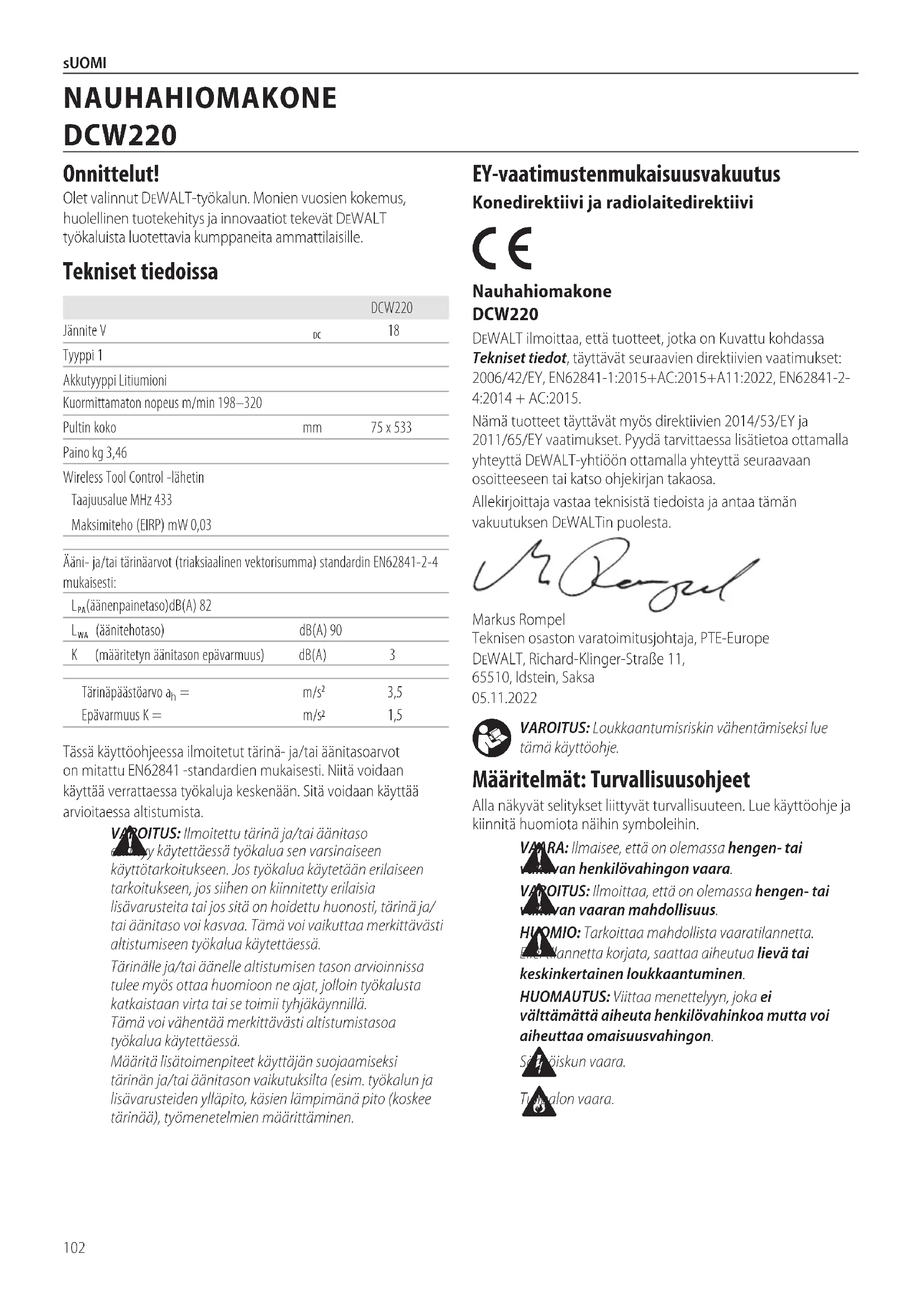 VAARA: Ilmaisee, että on olemassa hengen‑ tai vakavan henkilövahingonvaara. VAROITUS: Ilmoittaa, että on olemassa hengen‑ tai vakavan vaaranmahdollisuus. HUOMIO: Tarkoittaa mahdollista vaaratilannetta. Ellei tilannetta korjata, saattaa aiheutua lievä tai keskinkertainenloukkaantuminen.HUOMAUTUS: Viittaa menettelyyn, joka ei välttämättä aiheuta henkilövahinkoa mutta voi aiheuttaaomaisuusvahingon. Sähköiskunvaara. Tulipalonvaara. EY‑vaatimustenmukaisuusvakuutus Konedirektiivi ja radiolaitedirektiivi Nauhahiomakone DCW220DeWALT ilmoittaa, että tuotteet, jotka on Kuvattu kohdassa Tekniset tiedot, täyttävät seuraavien direktiivien vaatimukset: 2006/42/EY, EN62841‑1:2015+AC:2015+A11:2022, EN62841‑2‑4:2014 + AC:2015.Nämä tuotteet täyttävät myös direktiivien 2014/53/EY ja 2011/65/EY vaatimukset. Pyydä tarvittaessa lisätietoa ottamalla yhteyttä DeWALT‑yhtiöön ottamalla yhteyttä seuraavaan osoitteeseen tai katso ohjekirjantakaosa.Allekirjoittaja vastaa teknisistä tiedoista ja antaa tämän vakuutuksen DeWALTinpuolesta.Markus Rompel Teknisen osaston varatoimitusjohtaja, PTE‑Europe DeWALT, Richard‑Klinger‑Straße 11, 65510, Idstein, Saksa 05.11.2022Tässä käyttöohjeessa ilmoitetut tärinä‑ ja/tai äänitasoarvot on mitattu EN62841 ‑standardien mukaisesti. Niitä voidaan käyttää verrattaessa työkaluja keskenään. Sitä voidaan käyttää arvioitaessaaltistumista. VAROITUS: Ilmoitettu tärinä ja/tai äänitaso esiintyy käytettäessä työkalua sen varsinaiseen käyttötarkoitukseen. Jos työkalua käytetään erilaiseen tarkoitukseen, jos siihen on kiinnitetty erilaisia lisävarusteita tai jos sitä on hoidettu huonosti, tärinä ja/tai äänitaso voi kasvaa. Tämä voi vaikuttaa merkittävästi altistumiseen työkaluakäytettäessä.Tärinälle ja/tai äänelle altistumisen tason arvioinnissa tulee myös ottaa huomioon ne ajat, jolloin työkalusta katkaistaan virta tai se toimii tyhjäkäynnillä. Tämä voi vähentää merkittävästi altistumistasoa työkaluakäytettäessä.Määritä lisätoimenpiteet käyttäjän suojaamiseksi tärinän ja/tai äänitason vaikutuksilta (esim. työkalun ja lisävarusteiden ylläpito, käsien lämpimänä pito (koskee tärinää), työmenetelmienmäärittäminen.DCW220Jännite V