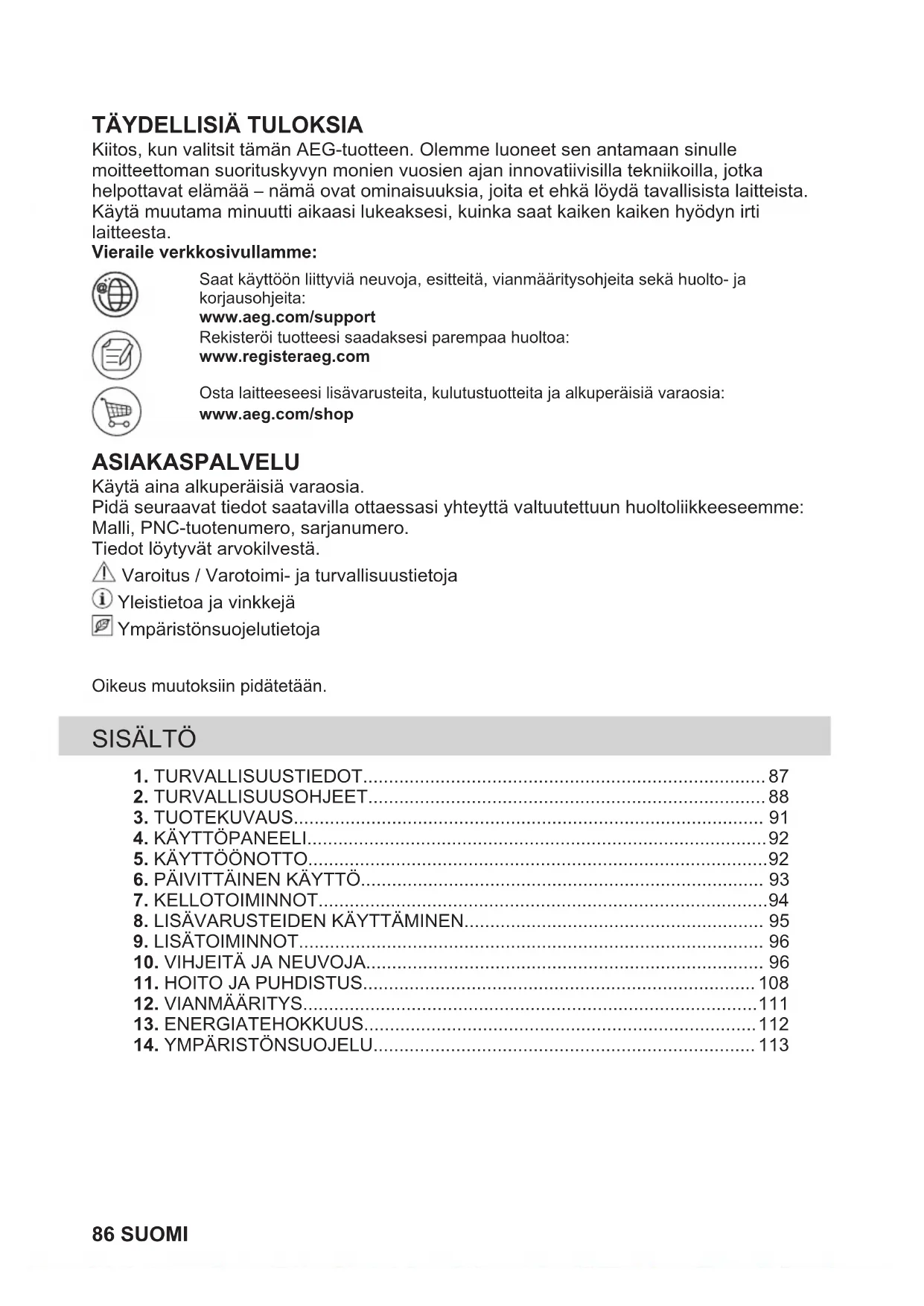 Kiitos, kun valitsit tämän AEG-tuotteen. Olemme luoneet sen antamaan sinulle moitteettoman suorituskyvyn monien vuosien ajan innovatiivisilla tekniikoilla, jotka helpottavat elämää – nämä ovat ominaisuuksia, joita et ehkä löydä tavallisista laitteista. Käytä muutama minuutti aikaasi lukeaksesi, kuinka saat kaiken kaiken hyödyn irti laitteesta. Vieraile verkkosivullamme: Saat käyttöön liittyviä neuvoja, esitteitä, vianmääritysohjeita sekä huolto- jakorjausohjeita:www.aeg.com/supportRekisteröi tuotteesi saadaksesi parempaa huoltoa:www.registeraeg.comOsta laitteeseesi lisävarusteita, kulutustuotteita ja alkuperäisiä varaosia:www.aeg.com/shop ASIAKASPALVELU Käytä aina alkuperäisiä varaosia. Pidä seuraavat tiedot saatavilla ottaessasi yhteyttä valtuutettuun huoltoliikkeeseemme: Malli, PNC-tuotenumero, sarjanumero. Tiedot löytyvät arvokilvestä. Varoitus / Varotoimi- ja turvallisuustietoja Yleistietoa ja vinkkejä Ympäristönsuojelutietoja Oikeus muutoksiin pidätetään. SISÄLTÖ