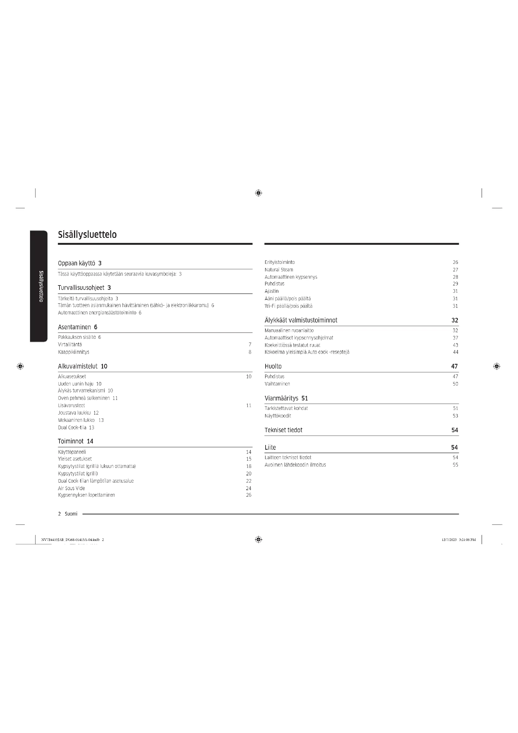 Chamada para a rede xa nacional Dias úteis das 9h às 20h www.samsung.com/pt/support SPAIN 91 175 00 15 www.samsung.com/es/support SWEDEN 0771-400 300 www.samsung.com/se/support SWITZERLAND 0800 726 786 www.samsung.com/ch/support (German) www.samsung.com/ch_fr/support (French) UK 0333 000 0333 www.samsung.com/uk/support IRELAND (EIRE) 0818 717100 www.samsung.com/ie/support DG68-01413A-04 NV7B4455JAB_DG68-01413A-04.indb 56NV7B4455JAB_DG68-01413A-04.indb 56 12/7/2023 3:21:04 PM12/7/2023 3:21:04 PMKalusteuuni Käyttö- ja asennusohje NV7B441****/ NV7B442****/ NV7B443****/ NV7B444****/ NV7B445****/ NV7B441**C*/ NV7B442**C*/ NV7B444**C*/ NV7B451****/ NV7B452****/ NV7B453****/ NV7B454****/ NV7B455**** NV7B4455JAB_DG68-01413A-04.indb 1NV7B4455JAB_DG68-01413A-04.indb 1 12/7/2023 3:21:06 PM12/7/2023 3:21:06 PM2 Suomi Sisällysluettelo Sisällysluettelo Oppaan käyttö 3 Tässä käyttöoppaassa käytetään seuraavia kuvasymboleja: 3 Turvallisuusohjeet 3 Tärkeitä turvallisuusohjeita 3 Tämän tuotteen asianmukainen hävittäminen (sähkö- ja elektroniikkaromu) 6 Automaattinen energiansäästötoiminto 6 Asentaminen 6 Pakkauksen sisältö 6 Virtaliitäntä 7 Kaappikiinnitys 8 Alkuvalmistelut 10 Alkuasetukset 10 Uuden uunin haju 10 Älykäs turvamekanismi 10 Oven pehmeä sulkeminen 11 Lisävarusteet 11 Joustava luukku 12 Mekaaninen lukko 13 Dual Cook-tila 13 Toiminnot 14 Käyttöpaneeli 14 Yleiset asetukset 15 Kypsytystilat (grilliä lukuun ottamatta) 18 Kypsytystilat (grilli) 20 Dual Cook-tilan lämpötilan asetusalue 22 Air Sous Vide 24 Kypsennyksen lopettaminen 26 Erityistoiminto 26 Natural Steam 27 Automaattinen kypsennys 28 Puhdistus 29 Ajastin 31 Ääni päällä/pois päältä 31 Wi-Fi päällä/pois päältä 31 Älykkäät valmistustoiminnot 32 Manuaalinen ruoanlaitto 32 Automaattiset kypsennysohjelmat 37 Koekeittiössä testatut ruuat 43 Kokoelma yleisimpiä Auto cook -reseptejä 44 Huolto 47 Puhdistus 47 Vaihtaminen 50 Vianmääritys 51 Tarkistettavat kohdat 51 Näyttökoodit 53 Tekniset tiedot 54 Liite 54 Laitteen tekniset tiedot 54 Avoimen lähdekoodin ilmoitus 55 NV7B4455JAB_DG68-01413A-04.indb 2NV7B4455JAB_DG68-01413A-04.indb 2 12/7/2023 3:21:06 PM12/7/2023 3:21:06 PMSuomi 3 Oppaan käyttö Turvallisuusohjeet Tämän uunin saa asentaa vain valtuutettu sähköasentaja. Asentaja on vastuussa laitteen kytkemisestä verkkovirtaan noudattaen asianmukaisia turvallisuussuosituksia. Tärkeitä turvallisuusohjeita VAROITUS Tätä laitetta ei ole tarkoitettu sellaisten henkilöiden (mukaan lukien lapset) käyttöön, joilla on heikentyneet aistit, fyysiset, tai psyykkiset kyvyt tai joilla ei ole kokemusta tai tietoa, ellei heidän turvallisuudestaan vastaava henkilö ole valvonut tai opastanut heitä laitteen käytössä. Lapsia on valvottava, jotta he eivät leiki laitteella. Irrotuslaitteet on sisällytettävä kiinteään johdotukseen johdotussääntöjen mukaisesti. Tämä laite on kytkettävä irti verkosta asennuksen jälkeen. Kytkentä voidaan toteuttaa siten, että pistotulppa on saatavilla tai että kiinteään johdotukseen liitetään kytkin johdotussääntöjen mukaisesti. Jos verkkojohto on vaurioitunut, valmistajan, sen huoltoedustajan tai vastaavan pätevyyden omaavan henkilön on vaihdettava se vaaran välttämiseksi. Oppaan käyttö Kiitos, että valitsit Samsungin kalusteuunin. Tämä käyttöopas sisältää tärkeitä turvallisuustietoja ja ohjeita, joiden tarkoituksena on auttaa sinua laitteen käytössä ja huollossa. Lue tämä käyttöopas ennen uunin käyttöä ja säilytä tämä ohjekirja myöhempää käyttöä varten. Tässä käyttöoppaassa käytetään seuraavia kuvasymboleja: VAROITUS Vaarat tai vaaralliset käytännöt, jotka voivat aiheuttaa vakavia henkilövahinkoja, kuoleman ja/tai omaisuusvahinkoja. HUOMIO Vaarat tai vaaralliset käytännöt, jotka voivat aiheuttaa henkilövahinkoja ja/tai omaisuusvahinkoja. HUOM Hyödyllisiä vinkkejä, suosituksia tai tietoja, jotka auttavat käyttäjiä tuotteen käsittelyssä. NV7B4455JAB_DG68-01413A-04.indb 3NV7B4455JAB_DG68-01413A-04.indb 3 12/7/2023 3:21:06 PM12/7/2023 3:21:06 PM4 Suomi Turvallisuusohjeet Turvallisuusohjeet Ilmoitettu kiinnitysmenetelmä ei saa perustua liimojen käyttöön, koska niitä ei pidetä luotettavana kiinnitysmenetelmänä. Tätä laitetta voivat käyttää vähintään 8-vuotiaat lapset ja henkilöt, joiden aistit, fyysiset, tai henkiset kyvyt ovat heikentyneet tai joilla ei ole riittävästi kokemusta tai tietoa, jos heitä on valvottu tai opastettu laitteen turvallisessa käytössä ja jos he ymmärtävät siihen liittyvät vaarat. Lapset eivät saa leikkiä laitteella. Lapset eivät saa suorittaa puhdistusta ja huoltoa ilman valvontaa. Pidä laite ja sen johto alle 8-vuotiaiden lasten ulottumattomissa. Laite kuumenee käytön aikana. On varottava koskettamasta uunin sisällä olevia lämmityselementtejä. VAROITUS: Käsiksi päästävät osat kuumenevat käytössä. Pienet lapset on pidettävä poissa. Älä käytä kovia hankaavia puhdistusaineita tai teräviä metallikaapimia uunin luukun lasin puhdistamiseen, koska ne voivat naarmuttaa pintaa, mikä voi johtaa lasin rikkoutumiseen. Jos tässä laitteessa on puhdistustoiminto, ylimääräiset roiskeet on poistettava ennen puhdistusta, eikä kaikkia astioita saa jättää uuniin höyrypuhdistuksen tai itsepuhdistuksen aikana. Puhdistustoiminto riippuu mallista. Jos tässä laitteessa on puhdistustoiminto, puhdistusolosuhteiden aikana pinnat voivat kuumentua tavallista kuumemmiksi, ja lapset on pidettävä poissa. Jotkin eläimet, erityisesti linnut, voivat olla herkkiä pyrolyyttisen puhdistusprosessin aikana syntyville höyryille ja paikallisille lämpötilan vaihteluille, ja ne olisi siirrettävä prosessin ajaksi sopivaan, hyvin tuuletettuun tilaan. Tuuleta huone pyropuhdistuksen aikana ja sen jälkeen. Puhdistustoiminto riippuu mallista. Käytä vain tähän uuniin suositeltua paistomittaria. (Vain paistomittari-malli) Höyryp