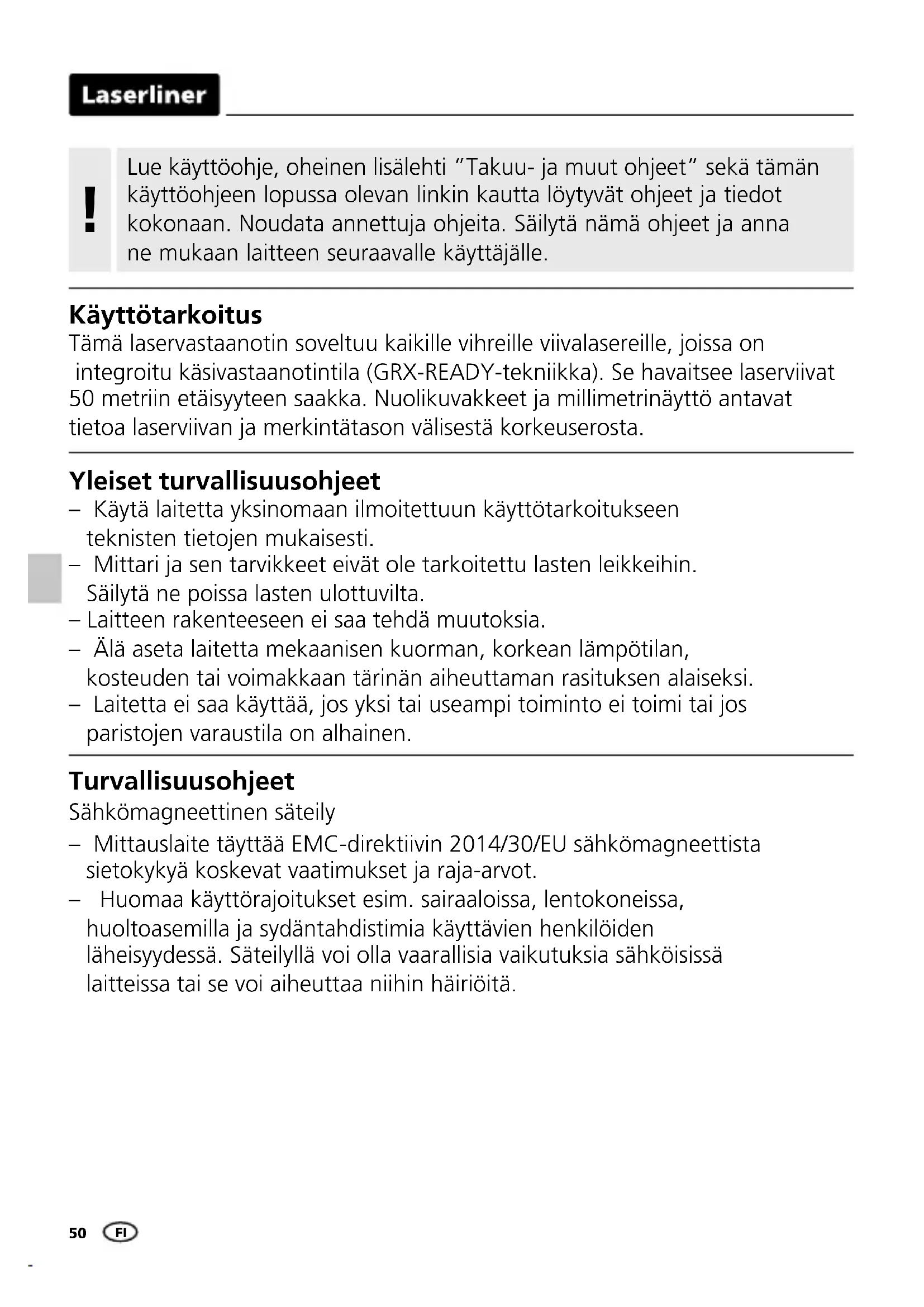 Käyttötarkoitus Tämä laservastaanotin soveltuu kaikille vihreille viivalasereille, joissa on integroitu käsivastaanotintila (GRX-READY-tekniikka). Se havaitsee laserviivat 50 metriin etäisyyteen saakka. Nuolikuvakkeet ja millimetrinäyttö antavat tietoa laserviivan ja merkintätason välisestä korkeuserosta. Turvallisuusohjeet Sähkömagneettinen säteily – Mittauslaite täyttää EMC-direktiivin 2014/30/EU sähkömagneettista sietokykyä koskevat vaatimukset ja raja-arvot. – Huomaa käyttörajoitukset esim. sairaaloissa, lentokoneissa, huoltoasemilla ja sydäntahdistimia käyttävien henkilöiden läheisyydessä. Säteilyllä voi olla vaarallisia vaikutuksia sähköisissä laitteissa tai se voi aiheuttaa niihin häiriöitä. Yleiset turvallisuusohjeet – Käytä laitetta yksinomaan ilmoitettuun käyttötarkoitukseen teknisten tietojen mukaisesti. – Mittari ja sen tarvikkeet eivät ole tarkoitettu lasten leikkeihin. Säilytä ne poissa lasten ulottuvilta. – Laitteen rakenteeseen ei saa tehdä muutoksia. – Älä aseta laitetta mekaanisen kuorman, korkean lämpötilan, kosteuden tai voimakkaan tärinän aiheuttaman rasituksen alaiseksi. – Laitetta ei saa käyttää, jos yksi tai useampi toiminto ei toimi tai jos paristojen varaustila on alhainen. FIRangeXtender M 50