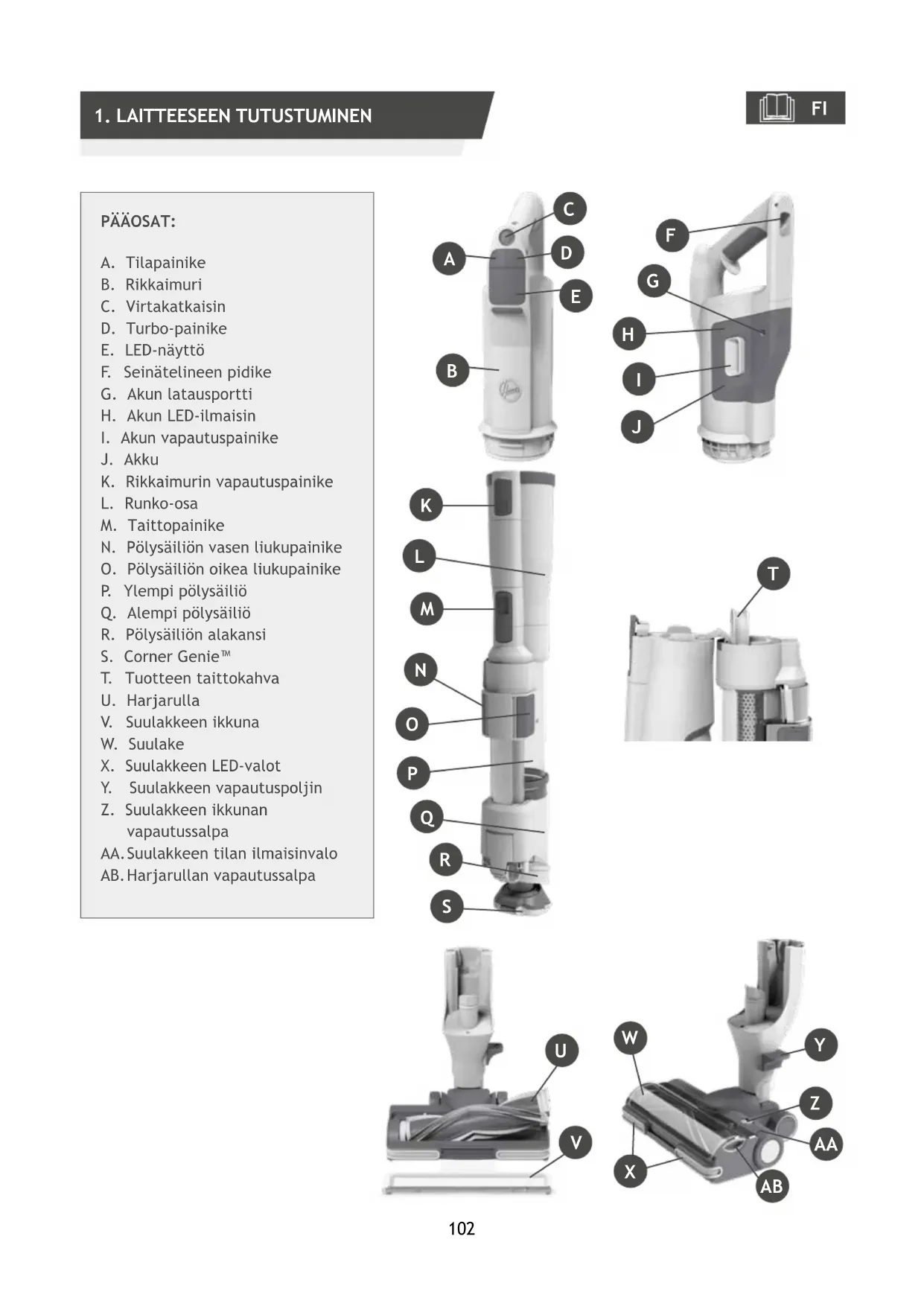 J. Akku K. Rikkaimurin vapautuspainike L. Runko-osa M. Taittopainike N. Pölysäiliön vasen liukupainike O. Pölysäiliön oikea liukupainike P. Ylempi pölysäiliö Q. Alempi pölysäiliö R. Pölysäiliön alakansi S. Corner Genie™ T. Tuotteen taittokahva U. Harjarulla