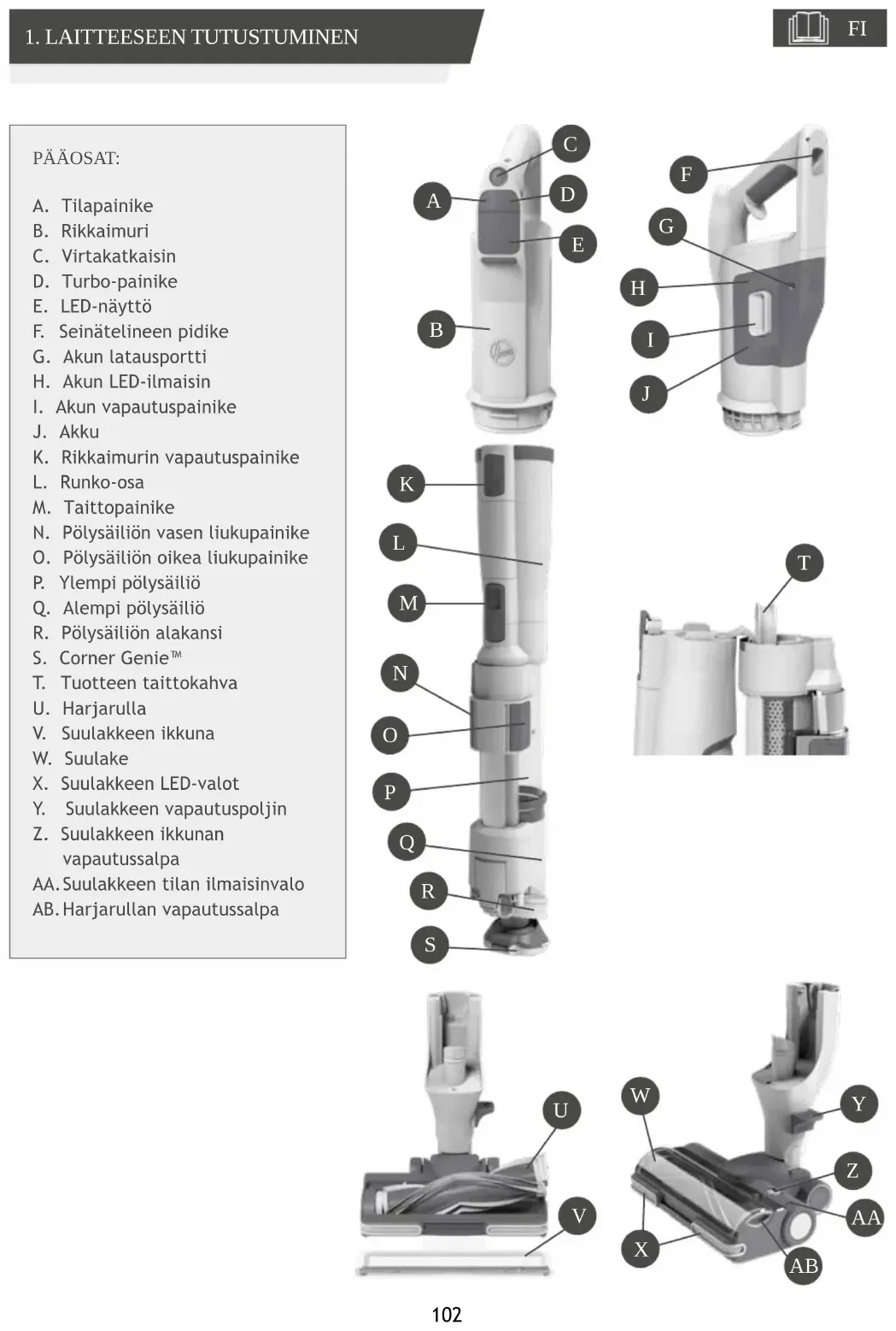 J. Akku K. Rikkaimurin vapautuspainike L. Runko-osa M. Taittopainike N. Pölysäiliön vasen liukupainike O. Pölysäiliön oikea liukupainike P. Ylempi pölysäiliö Q. Alempi pölysäiliö R. Pölysäiliön alakansi S. Corner Genie™ T. Tuotteen taittokahva U. Harjarulla