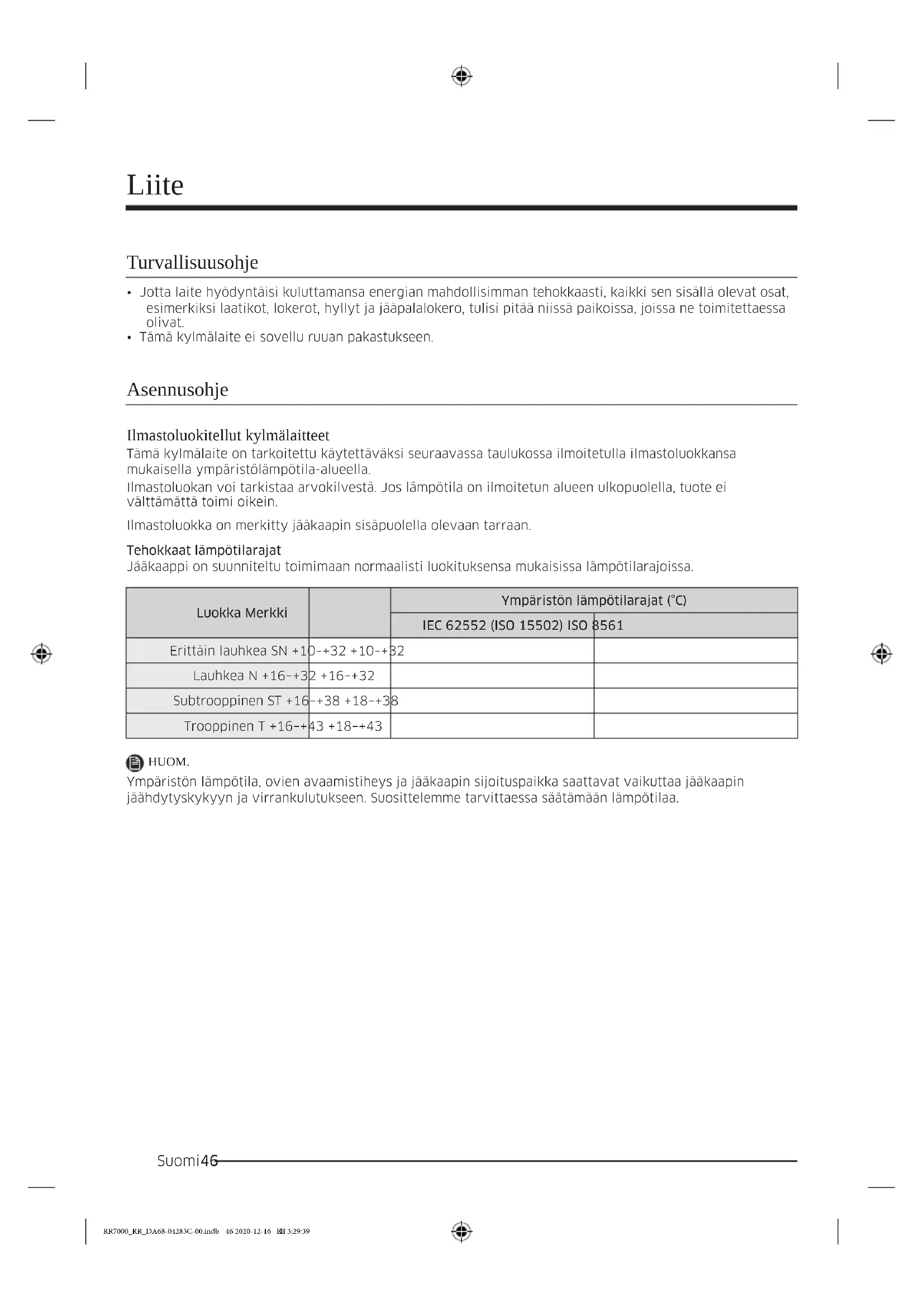 Erittäin lauhkea SN +10–+32 +10–+32 Lauhkea N +16–+32 +16–+32 Subtrooppinen ST +16–+38 +18–+38 Trooppinen T +16–+43 +18–+43 HUOM. Ympäristön lämpötila, ovien avaamistiheys ja jääkaapin sijoituspaikka saattavat vaikuttaa jääkaapin jäähdytyskykyyn ja virrankulutukseen. Suosittelemme tarvittaessa säätämään lämpötilaa. RR7000_RR_DA68-04283C-00.indb 46 2020-12-16 3:29:39Suomi 47 Lämpötilaohje Suositeltu lämpötila Ihanteellinen säilytyslämpötila-asetus: