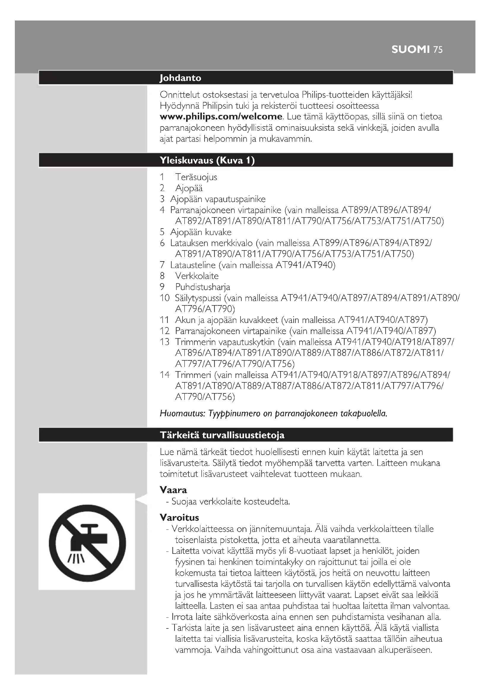 Johdanto Onnittelut ostoksestasi ja tervetuloa Philips-tuotteiden käyttäjäksi! Hyödynnä Philipsin tuki ja rekisteröi tuotteesi osoitteessa www.philips.com/welcome. Lue tämä käyttöopas, sillä siinä on tietoa parranajokoneen hyödyllisistä ominaisuuksista sekä vinkkejä, joiden avulla ajat partasi helpommin ja mukavammin. Yleiskuvaus (Kuva 1) 1 Teräsuojus 2 Ajopää 3 Ajopään vapautuspainike 4 Parranajokoneen virtapainike (vain malleissa AT899/AT896/AT894/ AT892/AT891/AT890/AT811/AT790/AT756/AT753/AT751/AT750) 5 Ajopään kuvake 6 Latauksen merkkivalo (vain malleissa AT899/AT896/AT894/AT892/ AT891/AT890/AT811/AT790/AT756/AT753/AT751/AT750) 7 Latausteline (vain malleissa AT941/AT940) 8 Verkkolaite 9 Puhdistusharja 10 Säilytyspussi (vain malleissa AT941/AT940/AT897/AT894/AT891/AT890/ AT796/AT790) 11 Akun ja ajopään kuvakkeet (vain malleissa AT941/AT940/AT897) 12 Parranajokoneen virtapainike (vain malleissa AT941/AT940/AT897) 13 Trimmerin vapautuskytkin (vain malleissa AT941/AT940/AT918/AT897/ AT896/AT894/AT891/AT890/AT889/AT887/AT886/AT872/AT811/ AT797/AT796/AT790/AT756) 14 Trimmeri (vain malleissa AT941/AT940/AT918/AT897/AT896/AT894/ AT891/AT890/AT889/AT887/AT886/AT872/AT811/AT797/AT796/ AT790/AT756) Huomautus: Tyyppinumero on parranajokoneen takapuolella. Tärkeitä turvallisuustietoja Lue nämä tärkeät tiedot huolellisesti ennen kuin käytät laitetta ja sen lisävarusteita. Säilytä tiedot myöhempää tarvetta varten. Laitteen mukana toimitetut lisävarusteet vaihtelevat tuotteen mukaan. Vaara - Suojaa verkkolaite kosteudelta. Varoitus - Verkkolaitteessa on jännitemuuntaja. Älä vaihda verkkolaitteen tilalle toisenlaista pistoketta, jotta et aiheuta vaaratilannetta. - Laitetta voivat käyttää myös yli 8-vuotiaat lapset ja henkilöt, joiden fyysinen tai henkinen toimintakyky on rajoittunut tai joilla ei ole kokemusta tai tietoa laitteen käytöstä, jos heitä on neuvottu laitteen turvallisesta käytöstä tai tarjolla on turvallisen käytön edellyttämä valvonta ja jos he ymmärtävät laitteeseen liittyvät vaarat. Lapset eivät saa leikkiä laitteella. Lasten ei saa antaa puhdistaa tai huoltaa laitetta ilman valvontaa. - Irrota laite sähköverkosta aina ennen sen puhdistamista vesihanan alla. - Tarkista laite ja sen lisävarusteet aina ennen käyttöä. Älä käytä viallista laitetta tai viallisia lisävarusteita, koska käytöstä saattaa tällöin aiheutua vammoja. Vaihda vahingoittunut osa aina vastaavaan alkuperäiseen.76 Varoitus - Älä upota lataustelinettä veteen, äläkä huuhtele sitä vesihanan alla. - Käytä tätä laitetta vain tarkoituksenmukaisesti käyttöoppaassa esitetyllä tavalla. - Hygieniasyistä laitetta suositellaan vain yhden henkilön käyttöön. - Älä kytke verkkolaitetta pistorasiaan, jossa on tai on ollut sähköinen ilmanraikastin, jotta verkkolaite ei vaurioidu. Älä käytä verkkolaitetta kyseisten ilmanraikastimien läheisyydessä. - Älä käytä paineilmaa, naarmuttavia tai syövyttäviä puhdistusaineita tai -välineitä laitteen puhdistamiseen (kuten bensiiniä tai asetonia). - Parranajokoneen alaosassa olevasta liittimestä saattaa vuotaa vettä huuhtelun yhteydessä. Tämä on normaalia eikä siitä aiheudu vaaraa, koska kaikki elektroniset osat ovat tiiviissä virtayksikössä parranajokoneen sisällä. Sähkömagneettiset kentät (EMF) - Tämä Philips-laite vastaa kaikkia sähkömagneettisia kenttiä (EMF) koskevia standardeja ja säännöksiä. Yleistä - Tämä parranajokone on vesitiivis. Laite sopii käytettäväksi kylvyssä tai suihkussa, ja se voidaan puhdistaa juoksevalla vedellä. Turvallisuussyistä laitetta voi käyttää vain ilman johtoa. - Laite soveltuu 100–240 voltin verkkojännitteelle. - Verkkolaite muuttaa 100–240 voltin jännitteen turvalliseksi alle 24 voltin jännitteeksi. - Käyttöääni enintään: Lc = 69 dB (A) Lataaminen Huomautus: Laitetta ei voi käyttää suoraan verkkojännitteellä. Kun lataat parranajokoneen ensimmäisen kerran tai pitkän tauon jälkeen, anna sen latautua, kunnes latauksen merkkivalo palaa jatkuvasti. Katso parranajokoneen latausaika alla olevasta taulukosta. Latausaika 1 tunti 8 tuntia AT941, AT940, AT918 AT899, AT896, AT872 AT897, AT896, AT894 AT797, AT796, AT790 AT892, AT891, AT890 AT770, AT756, AT753 AT889, AT887, AT886 AT751, AT750 AT811 Ajoaika saattaa olla taulukossa mainittua lyhyempi käyttömäärästä, puhdistustavoista ja partatyypistä riippuen. Käyttöaika 60 min 50 min 45 min 40 min. AT941 AT897, AT894, AT892 AT899 AT790, AT756, AT753 AT940 AT891, AT890, AT811 AT896 AT751, AT750 SUOMILatausilmaisimet Lataus vähissä - Mallit AT941/AT940/AT897: Kun akku on melkein tyhjä (kun käyttöaikaa on jäljellä 5 minuuttia tai vähemmän), oranssi akkukuvake alkaa vilkkua. Kun sammutat parranajokoneen, oranssi akkukuvake jatkaa vilkkumistaan muutaman sekunnin. - AT899, AT896, AT918, AT896, AT894, AT891, AT890, AT889, AT887, AT886, AT872, AT811, AT797, AT796, AT790, AT770, AT756,AT753, AT751, AT750: Kun akku on lähes tyhjä (jäljellä on enintään 5 minuuttia käyttöaikaa), latauksen merkkivalo alkaa vilkkua oranssina. Kun katkaiset parranajokoneesta virran, latauksen merkkivalo vilkkuu oranssina muutaman sekunnin. Pikalataus (vain mallit AT941, AT940, AT918, AT897, AT896, AT894, AT891, AT890, AT889, AT887, AT886, AT811) - Mallit AT941/AT940/AT897: Kun aloitat tyhjän akun lataamisen, akkukuvake vilkkuu oranssina ja valkoisena. Huomautus: Kun oranssina ja valkoisena vilkkuva akkukuvake vilkkuu ainoastaan valkoisena, voit käyttää laitetta kolmen minuutin ajan. - Mallit AT918, AT896, AT894, AT891, AT890, AT889, AT887, AT886, AT811: Kun aloitat tyhjän akun lataamisen, latauksen merkkivalo vilkkuu vuorotellen oranssina ja vihreänä. Huomautus: Kun oranssina ja vihreänä vilkkuva latauksen merkkivalo vilkkuu ainoastaan vihreänä, voit käyttää laitetta kolmen minuutin ajan. Lataaminen - Mallit AT941/AT940/AT897: Kun parranajokone lat