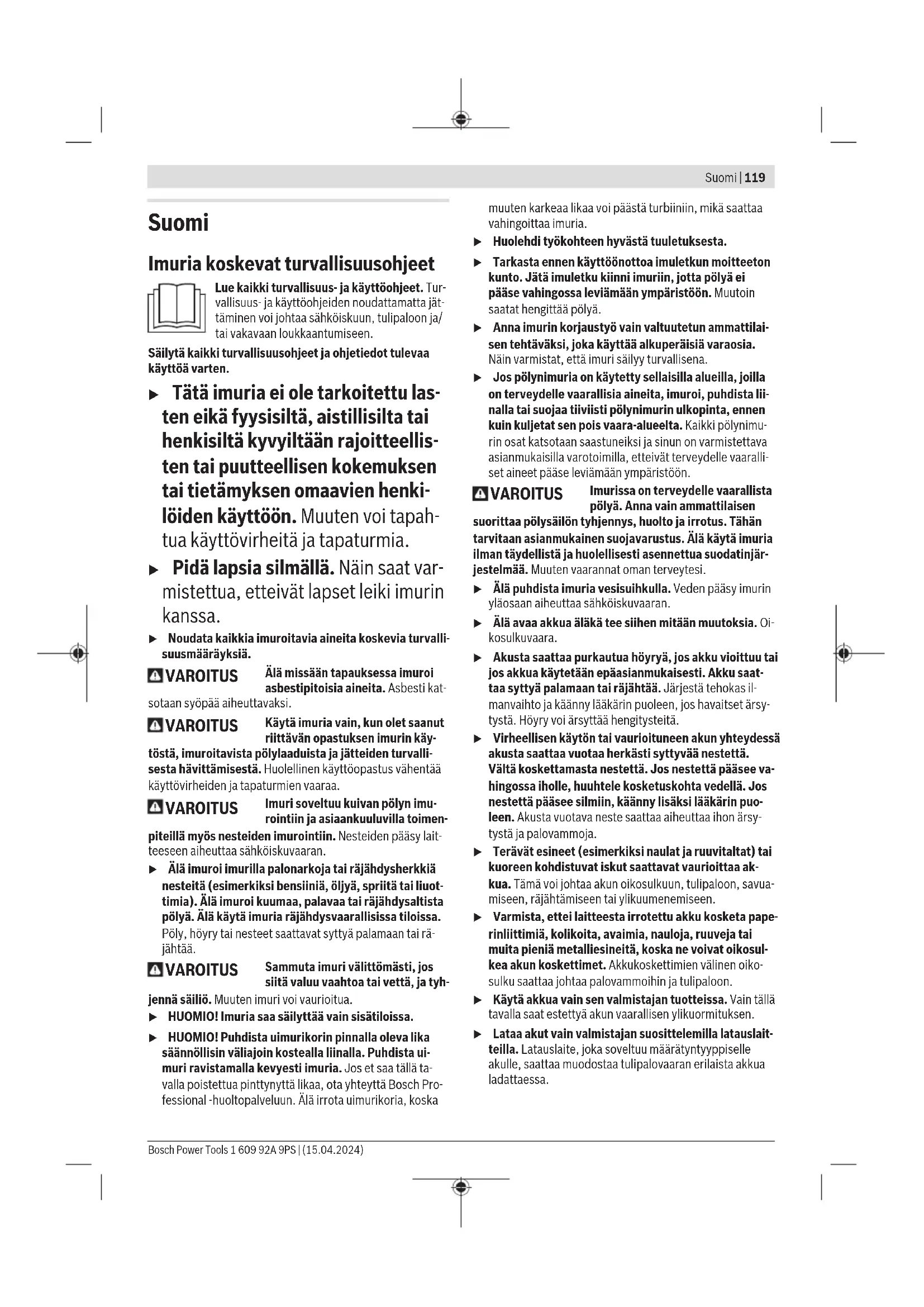 Akku Bosch myy akkuimureita myös ilman akkua. Pakkauksesta näet, sisältyykö akku imurisi toimitukseen. Bosch Power Tools 1 609 92A 9PS | (15.04.2024)122 | Suomi Akun lataminen u Käytä vain teknisissä tiedoissa ilmoitettuja latauslait- teita. Vain nämä latauslaitteet soveltuvat imurissa käytet- tävälle litiumioniakulle. Huomautus: kansainvälisten kuljetusmääräysten mukaisesti Li-ion-akut toimitetaan osittain ladattuina. Akun täyden suo- rituskyvyn varmistamiseksi akku tulee ladata täyteen ennen ensikäyttöä. Akun asennus ja irrotus (katsokuvaA) u Älä asenna akkua väkisin paikalleen. Akku on muotoiltu niin, että se sopii imuriin vain oikeassa asennossa. u Pidä akkukotelo ja akkuaukko aina puhtaina ja kuivina, jotta voit työskennellä kunnolla ja turvallisesti. – Paina vapautuspainiketta (19), kun haluat avata akkuko- telon kannen (18). – Asenna akku (31) akkuaukkoon (30) niin, että se lukittuu kuuluvasti paikalleen. – Kun haluat irrottaa akun (31), paina vapautuspainiketta ja vedä akku ulos akkuaukosta (30). – Sulje akkukotelon kansi (18). Huomautus: akkukotelon kannen sulkeminen vaatii enem- män voimaa suodattimen puhdistusjärjestelmän johdosta. Akun lataustilan näyttö Kun akku on paikallaan, akun lataustilan voi katsoa käyttöliit- tymästä (6). Kun akku on irrotettu, lataustilan voi katsoa suoraan akusta. Imurissa oleva akun lataustilan näyttö Imurin käynnistyksen jälkeen akun lataustilan näytön(3) 5vihreää LED-valoa syttyvät käyttöliittymässä yksitellen edestakaisin. Tämän jälkeen LED-valot näyttävät akun(31) lataustilan. Akun lataustilan näyttö akussa Jos akku irrotetaan imurista, lataustilan voi tarkistaa akun la- taustilan näytön vihreiden LED-valojen avulla. Kun haluat nähdä lataustilan, paina lataustilan näytön paini- ketta tai . Jos lataustilan näytön painikkeen painaminen ei sytytä yh- tään LED-valoa, akku on viallinen, ja se täytyy vaihtaa. Huomautus: lataustilan näyttöä ei ole kaikissa akkutyypeissä. Akkutyyppi GBA 18V... LED-valot Kapasiteetti 3vihreää valoa palaa jatkuvasti 60−100% 2vihreää valoa palaa jatkuvasti 30−60% 1vihreä valo palaa jatkuvasti 5−30% 1vihreä valo vilkkuu 0−5% Akkutyyppi ProCORE18V... LED-valot Kapasiteetti 5vihreä valoa palaa jatkuvasti 80−100 % 4vihreä valoa palaa jatkuvasti 60−80 % 3vihreää valoa palaa jatkuvasti 40−60 % 2vihreää valoa palaa jatkuvasti 20−40 % 1vihreä valo palaa jatkuvasti 5−20 % 1vihreä valo vilkkuu 0−5 % Ohjeita akun optimaaliseen käsittelyyn Suojaa akku kosteudelta ja vedeltä. Säilytä akkua vain –20...50°C lämpötilassa. Älä jätä akkua esimerkiksi kuumana kesäpäivänä pitkäksi ajaksi autoon. Puhdista akun tuuletusaukot säännöllisin väliajoin peh- meällä, puhtaalla ja kuivalla siveltimellä. Huomattavasti lyhentynyt käyntiaika latauksen jälkeen osoit- taa, että akku on elinikänsä lopussa ja täytyy vaihtaa uuteen. Huomioi hävitysohjeet. Asennus u Irrota akku, ennen kuin alat tehdä imurin huolto- tai puhdistustöitä, suoritat laitesäätöjä, vaihdat tarvikeo- sia tai viet imurin säilytykseen. Tämä varotoimenpide estää imurin tahattoman käynnistymisen. Pääsuodattimen asentaminen (katsokuvaB) Pääsuodatin on (32) HEPA-laskossuodatin, jolla on erityisen suuri suodatusteho puhallusilman puhdistamiseen. – Avaa salvat (13) ja ota imurin yläosa (15) pois. Huomautus: kun irrotat imurin yläosan(15) ja lasket sen kä- sistäsi, varo etteivät kalvopakkauksen pitimen(33) tapit väänny tai katkea. – Aseta pääsuodatin(32) uimurikorin(34) päälle ja käännä sitä kiertosuunnassa vasteeseen asti suodattimen pidikkeeseen(35). – Asenna imurin yläosa (15) ja sulje salvat (13). Huomautus: varmista, että suodatin on aina asennettu oi- kein. Tämä on tärkeää erityisesti silloin, kun imuroit haital- lista pölyä. Muovipussin asettaminen paikalleen/ poistaminen (kuivaimurointi) (katsokuvaC) Huomautus: kun irrotat imurin yläosan(15) ja lasket sen kä- sistäsi, varo etteivät kalvopakkauksen pitimen(33) tapit väänny tai katkea. Avaa molemmat salvat(13) ja ota imurin yläosa(15) pois. Aseta kuivaimurointia varten muovipussi(36) säiliöön(12). Asenna muovipussi(36) täyttöaukko ylöspäin säiliöön(12)➊. 1 609 92A 9PS | (15.04.2024) Bosch Power ToolsSuomi | 123 Varmista, että muovipussi(36) on täydellisesti säiliön(12)➋ sisäseiniä vasten. Käännä muovipussin(36) ylituleva osa säiliön(12) reunan yli. Aseta imurin yläosa(15) takaisin paikalleen➌ ja sulje imuri salvoilla(13). u Varmista, että imuri on aina kunnolla kiinni. Huomautus: kun asetat imurin yläosan(15) paikalleen, var- mista, että kalvopakkauksen pitimen(33) tapit eivät riko muovipussia (36). Sulje muovipussi ennen kuin poistat sen. Vedä tätä varten muovipussin valkoinen nauha irti, pidä pussia ylhäältä siten, että se pysyy kiinni ja solmi pussi narulla. Imutarvikkeiden pidikkeen asentaminen Aseta imutarvikkeiden pidike(7) tätä varten tarkoitettuun kiinnikkeeseen. Lukitse imutarvikkeiden pidike(7) kiertämällä imutarvikkei- den pidikkeen lukitusta(8) myötäpäivään. Imuletkun asennus/kiinnitys Imuletkun asentaminen (katsokuvaD) Vedä sulkutulppa(11) ulos letkun kiinnityskohdasta(10). Työnnä imuletku(20) letkun kiinnityskohtaan(10) ja käännä sitä myötäpäivään rajoittimeen asti. u Sulje imuliitäntä aina sulkutulpalla, kun irrotat imulet- kun. Näin estät pölyn ulospääsemisen. Imuletkun kiinnitys imuriin (katsokuvaE) Kiedo asennettu imuletku(20) imurin ympärille. Vedä hihna(9) alas ja kiinnitä se yhteen kolmesta saavutettavissa käytettävissä olevasta urasta, joita on yhteensä15. Imutarvikkeiden asentaminen Imuletku (20) on varustettu kiinnitysjärjestelmällä, johon voi liittää imutarvikkeita (imuadapteri (21), käyräsuutin (22)). Imuadapterin tai käyräsuuttimen asentaminen (katsokuvaF) Asenna imuadapteri(21) tai käyräsuutin(22) imuletkuun(20) niin, että i
