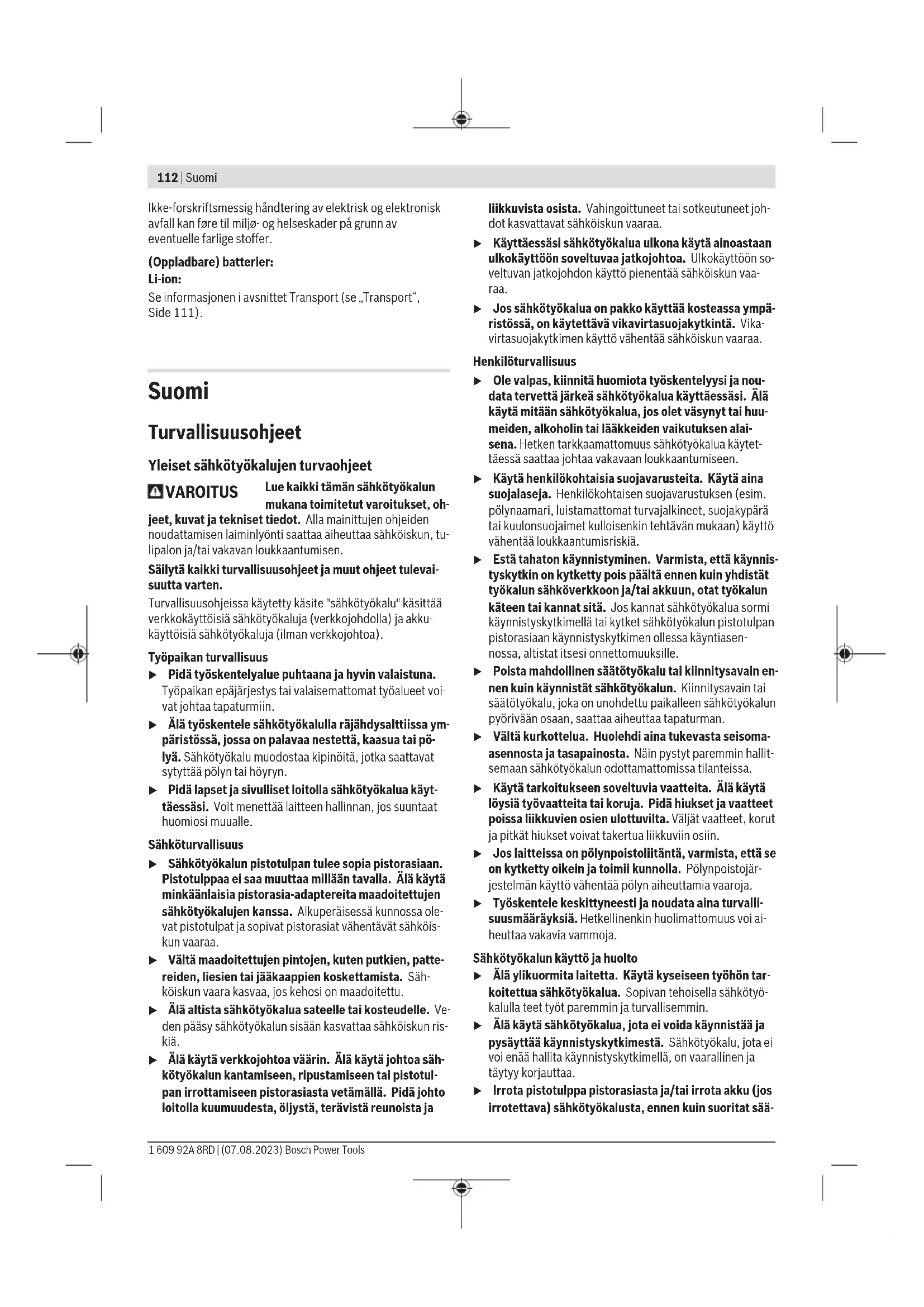 Hiomapaperin vaihto ja kiinnitys hiomalevyyn Hiomalevyssä(15) on tarrakangas, joka mahdollistaa tarra- kiinnitteisten hiomapaperien nopean ja helpon asennuksen. Optimaalisen kiinnityksen varmistamiseksi koputtele hiomalevyn(15) tarrakangas puhtaaksi, ennen kuin asennat hiomapaperin(16). Aseta hiomapaperi(16) yhdeltä sivultaan hiomalevyn(15) reunan kohdalle ja paina sen jälkeen koko hiomapaperi kun- nolla kiinni hiomalevyyn. Varmista optimaalista pölynpoistoa varten, että hiomapape- rin reiät ovat kohdakkain hiomalevyn reikien kanssa. Kun haluat irrottaa hiomapaperin(16), ota kiinni sen yh- destä kärjestä ja vedä hiomapaperi irti hiomalevystä(15). Voit käyttää kaikkiaBosch-tarvikevalikoiman Delta 93mm - sarjan hiomapapereita, kiillotuskarhunkieliä ja puhdistuskar- hunkieliä. Muut hiomatarvikkeet (esimerkiksi karhunkielet ja kiillotus- huovat) kiinnitetään hiomalevyyn samalla tavalla. Kun käytät hiomatarvikkeita, kuten hiomapapereita tai hio- malevyjä, valitse värähtelytaajuuden portaaksi enintään "4". Liian suuri värähtelytaajuus lisää merkittävästi käyttötarvik- keiden kulumista tai voi johtaa niiden ennenaikaiseen rikkou- tumiseen. Huomioi käyttötarvikkeissa tai käyttötarvikkeiden pakkauksissa annetut tiedot. Pölyn-/purunpoisto Työstettävistä materiaaleista syntyvä pöly (esimerkiksi lyijy- pitoinen pinnoite, tietyt puulaadut, kivi ja metalli) voi olla ter- veydelle vaarallista. Pölyn koskettaminen tai hengittäminen saattaa aiheuttaa käyttäjälle tai lähellä oleville henkilöille al- lergisia reaktioita ja/tai hengitystiesairauksia. Tiettyjen pölylaatujen (esimerkiksi tammi- tai pyökkipöly) katsotaan aiheuttavan syöpää, varsikin puunsuojaukseen Bosch Power Tools 1 609 92A 8RD | (07.08.2023)120 | Suomi käytettävien lisäaineiden yhteydessä (kromaatti, puunsuoja- aine). Asbestipitoisia materiaaleja saavat käsitellä vain asiantuntevat ammattilaiset. – Käytä mahdollisuuksien mukaan materiaalille soveltuvaa pölynpoistoa. – Huolehdi työkohteen hyvästä tuuletuksesta. – Suosittelemme käyttämään suodatusluokan P2 hengitys- suojanaamaria. Noudata käsiteltäviä materiaaleja koskevia maakohtaisia määräyksiä. u Estä pölyn kertyminen työpisteeseen. Pöly saattaa olla herkästi syttyvää. Pölynpoistovarusteen liitäntä (katsokuvaA) Pölynpoistovaruste on tarkoitettu vain hiomalevyllä (15) tehtäviin töihin, sitä ei käytetä muiden käyttötarvikkeiden yhteydessä. Käytä hionnassa aina pölynpoistoa. Kun aiot asentaa pölynpoistovarusteen, ota käyttötarvike ja syvyydenrajoitin(10) pois. Työnnä lukituksella varustamaton pölynpoistovaruste(13) tai lukituksella varustettu pölynpoistovaruste(14) käyttötar- vikkeen pitimen(8) yli sähkötyökalun kiinnityskaulan rajoitti- meen asti. Käännä pölynpoistovaruste haluamaasi asentoon (ei suoraan sähkötyökalun alapuolelle). Paina pölynpoistova- rusteen lukitseva kiinnitysvipu (17) kiinni. Liitä pölynpoistovaruste imuletkuun: – Lukituksella varustamaton pölynpoistovaruste(13): työnnä pölynimurin imuletku(20) imuadapteriin(19) niin, että se napsahtaa paikalleen. Työnnä imuadapteri(19) pölynpoistoputken(18) päälle pölynpoistovarusteeseen(13). – Lukituksella varustettu pölynpoistovaruste(14): työnnä pölynimurin imuletku(20) pölynpoistoputken(18) si- sään pölynpoistovarusteeseen(14) niin, että se napsah- taa paikalleen. Vaihtoehtoisesti voi kytkeä imuadapterin(19) pölynpoistovarusteen(14) pölynpoistoputkeen ja imuletkun(20) imuadapteriin(19). Liitä imuletku(20) pölynimuriin. Tämän käyttöoppaan lopussa olevassa yleiskatsaus neuvoo, miten työkalun voi kytkeä erilaisiin pölynimureihin. Pölynimurin tulee soveltua työstettävälle materiaalille. Käytä erikoisimuria terveydelle erittäin vaarallisten, syöpää aiheuttavien tai kuivien pölylaatujen imurointiin. Käyttö Käyttöönotto Käynnistys ja pysäytys u Varmista, että voit painaa käynnistyskytkintä irrotta- matta otetta kädensijasta. Käynnistä työvalo työntämällä käynnistyskytkintä(2) eteenpäin -asentoon. Työvalo parantaa näkyvyyttä työs- tettävällä alueella. u Älä katso suoraan työvaloon, koska se voi aiheuttaa häikäistymisen. Käynnistä sähkötyökalu työntämällä käynnistyskytkintä(2) edelleen eteenpäin "I"-asentoon. Sammuta sähkötyökalu ja työvalo siirtämällä käynnistyskytkintä(2) taaksepäin "0"-asentoon. Huomautus: jos sähkötyökalun toiminta katkeaa tyhjenty- neen tai ylikuumentuneen akun takia automaattisesti, kytke siinä tapauksessa sähkötyökalun käynnistyskytkin (2) pois päältä. Lataa akku tai anna sen jäähtyä, ennen kuin kytket sähkötyö- kalun uudelleen päälle. Muuten akku saattaa vaurioitua. Värähtelytaajuuden asetus Voit säätää tarvittavan värähtelytaajuuden myös käytön ai- kana värähtelytaajuuden säätöpyörällä (6). Tarvittava värähtelytaajuus riippuu materiaalista ja työolo- suhteista ja sen voi määrittää käytännön testeillä. Värähtelytaajuuden porrasta "6" suositellaan puun sahaus- töihin. Värähtelytaajuuden porras "4" soveltuu hiomatöihin sekä muovin ja metallin sahaustöihin. Huomio: huomioi käyttötarvikkeissa tai käyttötarvikkeiden pakkauksissa annetut suurinta sallittua värähtelytaajuutta koskevat tiedot. Kun käytät tehtävässä esim. hioma- ja RIFF- käyttötarvikkeita, valitse värähtelytaajuuden portaaksi enin- tään "4". Liian suuri värähtelytaajuus lisää merkittävästi käyt- tötarvikkeiden kulumista tai voi johtaa niiden ennenaikai- seen rikkoutumiseen. Työskentelyohjeita u Irrota akku, ennen kuin alat tehdä sähkötyökaluun liit- tyviä töitä (esim. huolto, käyttötarvikkeen vaihto, jne.). Irrota akku myös sähkötyökalun kuljetuksen ja säilytyksen ajaksi. Käynnistyskytkimen tahaton painal- lus aiheuttaa loukkaantumisvaaran. u Odota, kunnes sähkötyökalu on pysähtynyt, ennen kuin asetat sen säilytysalustalle. Huoma