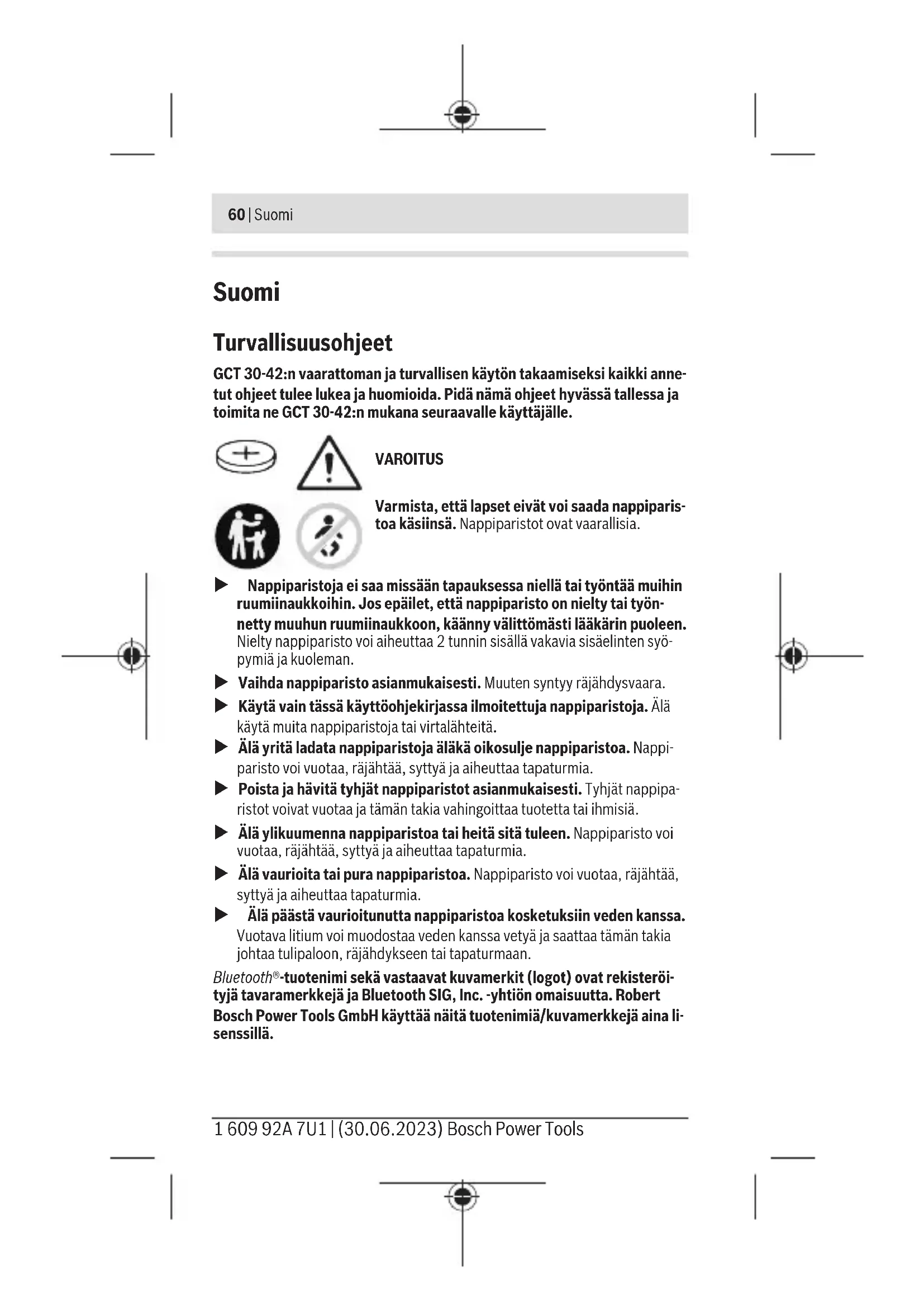 Gul – Knappcellebatteri nesten tomt Skift knappcellebatteri snart Rød – Forbindelse ikke opprettet eller – Knappcellebatteri tomt – Start forsøk på å opprette forbindelse på nytt eller – Skifte knappcellebatteri Service og vedlikehold Vedlikehold og rengjøring Fjern smuss med en pensel eller en fuktig klut. Bruk ikke rengjørings- eller løsemidler. Skifte knappcellebatteri u Obs! Et knappcellebatteri må alltid skiftes ut med et knappcellebatteri av samme type. Det er fare for eksplosjon. u Utladede knappcellebatterier må tas ut og kastes forskriftsmessig. Utladede knappcellebatterier kan bli utette og dermed skade produktet eller personer. 1 609 92A 7U1 | (30.06.2023) Bosch Power ToolsNorsk | 59 – Åpne dekselet til batterirommet på baksiden av sendermodulen med en mynt. – Ta knappcellebatteriet forsiktig ut, og sett inn et nytt. Se merkingen for riktig plassering av knappcellebatteriet. – Lukk dekselet til batterirommet med en mynt. Drei på dekselet til det stopper, slik at du er sikker på at det er riktig lukket. Kundeservice og kundeveiledning Kundeservice hjelper deg ved spørsmål om reparasjon og vedlikehold av produktet ditt og reservedelene. Du finner også sprengskisser og informasjon om reservedeler på www.bosch-pt.com Boschs kundeveilederteam hjelper deg gjerne hvis du har spørsmål om våre produkter og tilbehør. Ved alle forespørsler og reservedelsbestillinger må du oppgi det 10‑sifrede produktnummeret som er angitt på produktets typeskilt. Norsk Robert Bosch AS Postboks 350 1402 Ski Tel.: 64 87 89 50 Faks: 64 87 89 55 Du finner adresser til andre verksteder på: www.bosch-pt.com/serviceaddresses Kassering Sendermodul, tilbehør og emballasje skal leveres til miljøvennlig gjenvinning. Elektroniske komponenter og batterier må ikke kastes sammen med vanlig husholdningsavfall! Bosch Power Tools 1 609 92A 7U1 | (30.06.2023)60 | Suomi Suomi Turvallisuusohjeet GCT 30-42:n vaarattoman ja turvallisen käytön takaamiseksi kaikki anne- tut ohjeet tulee lukea ja huomioida. Pidä nämä ohjeet hyvässä tallessa ja toimita neGCT 30-42:n mukana seuraavalle käyttäjälle. VAROITUS Varmista, että lapset eivät voi saada nappiparis- toa käsiinsä. Nappiparistot ovat vaarallisia. u Nappiparistoja ei saa missään tapauksessa niellä tai työntää muihin ruumiinaukkoihin. Jos epäilet, että nappiparisto on nielty tai työn- netty muuhun ruumiinaukkoon, käänny välittömästi lääkärin puoleen. Nielty nappiparisto voi aiheuttaa 2 tunnin sisällä vakavia sisäelinten syö- pymiä ja kuoleman. u Vaihda nappiparisto asianmukaisesti. Muuten syntyy räjähdysvaara. u Käytä vain tässä käyttöohjekirjassa ilmoitettuja nappiparistoja. Älä käytä muita nappiparistoja tai virtalähteitä. u Älä yritä ladata nappiparistoja äläkä oikosulje nappiparistoa. Nappi- paristo voi vuotaa, räjähtää, syttyä ja aiheuttaa tapaturmia. u Poista ja hävitä tyhjät nappiparistot asianmukaisesti. Tyhjät nappipa- ristot voivat vuotaa ja tämän takia vahingoittaa tuotetta tai ihmisiä. u Älä ylikuumenna nappiparistoa tai heitä sitä tuleen. Nappiparisto voi vuotaa, räjähtää, syttyä ja aiheuttaa tapaturmia. u Älä vaurioita tai pura nappiparistoa. Nappiparisto voi vuotaa, räjähtää, syttyä ja aiheuttaa tapaturmia. u Älä päästä vaurioitunutta nappiparistoa kosketuksiin veden kanssa. Vuotava litium voi muodostaa veden kanssa vetyä ja saattaa tämän takia johtaa tulipaloon, räjähdykseen tai tapaturmaan. Bluetooth®-tuotenimi sekä vastaavat kuvamerkit (logot) ovat rekisteröi- tyjä tavaramerkkejä ja Bluetooth SIG, Inc. -yhtiön omaisuutta. Robert Bosch Power Tools GmbH käyttää näitä tuotenimiä/kuvamerkkejä aina li- senssillä. 1 609 92A 7U1 | (30.06.2023) Bosch Power ToolsSuomi | 61 Älä missään tapauksessa kiinnitä lähetinmoduulia sellaisiin kohtiin (esim. kahvapintoihin, kytkimiin, näyttöihin), joita tarvitaan akkutyökalun oh- jaamiseen. Tuotteen ja ominaisuuksien kuvaus Määräyksenmukainen käyttö GCT30-42 -lähetinmoduuli tuottaa käynnistys-/sammutussignaalin pölynimu- rille. Tämä signaali voidaan lähettää joko Bosch Professional -imuriin, jossa on automaattinen käynnistystoiminto, tai GCA30-42 -vastaanotinmoduuliin. Lisätietoja saat Boschin automaattisen käynnistysjärjestelmän GCA 30-42 + GCT 30-42 ja käytettävän pölynimurin käyttöohjeista. Kuvatut osat Kuvassa olevien osien numerointi viittaa piirrossivuissa oleviin kuviin. (1) Lähetinmoduuli (2) LED-tilanäyttö (käyttöliittymä) (3) Käynnistyspainike (käyttöliittymä) (4) Kuminauhan kiinnityskoukku (5) Kuminauha Tekniset tiedot Lähetinmoduuli GCT 30-42 Tuotenumero 1 600 A02 GH. Käyttölämpötila –20...+50°C Säilytyslämpötila –20....+65°C Mitat