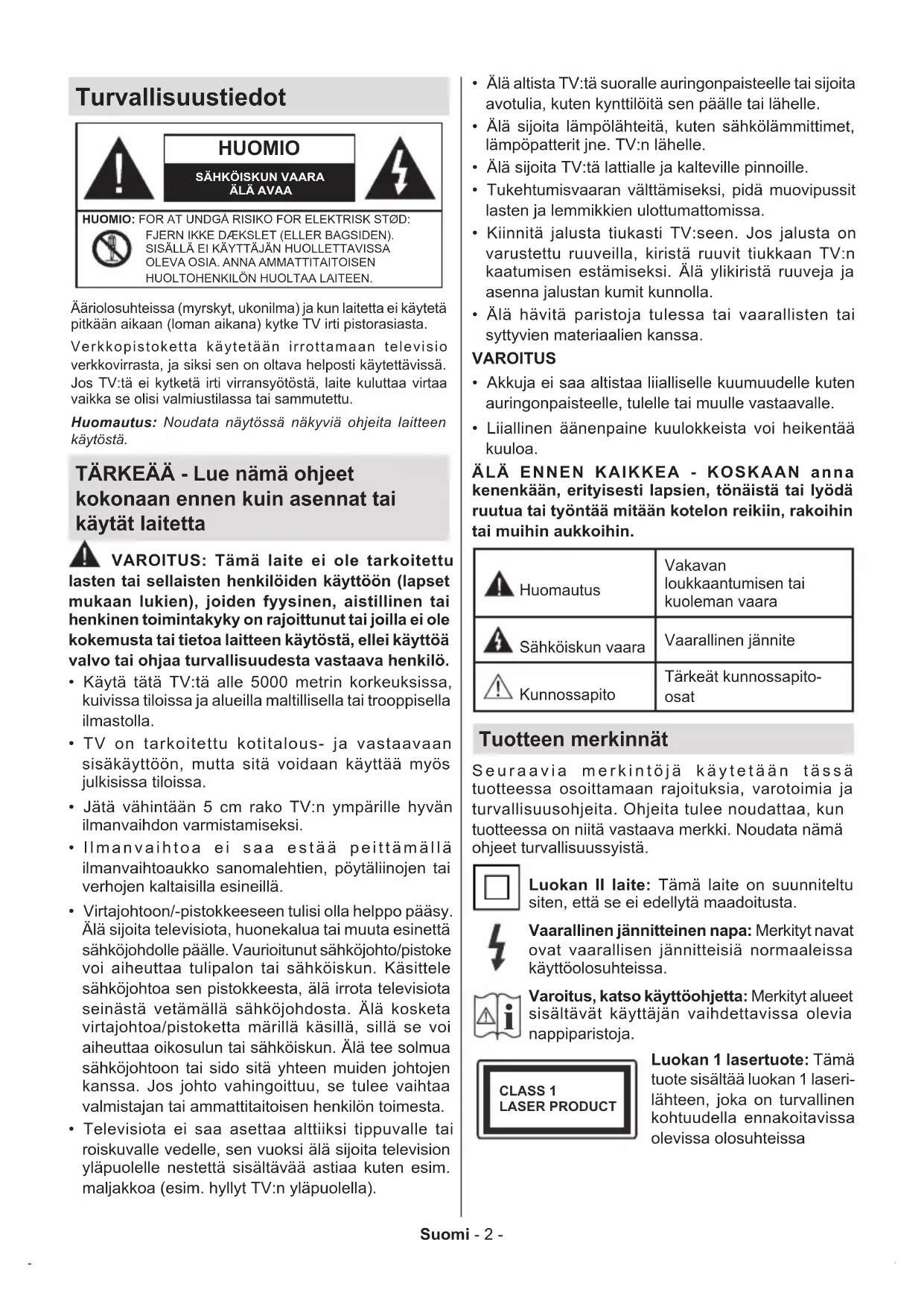 Huolto Irrota virtapistoke ensi pistorasiasta. Näyttöpaneeli, Kotelo, Jalusta Säännöllinen hoito: Pyyhi näyttöpaneeli, kotelo ja jalusta varovasti pehmeällä liinalla poistaaksesi lian ja sormenjäljet. Pinttynyt lika: 1. Puhdista pinta ensin pölystä.2. Kostuta pehmeä liina puhtaanna vedellä tai miedolla puhdistusaineella (1 osa puhdistusainetta 100 osaa vettä).3. Purista vesi liinasta. (Huomaa, että television sisälle ei saa päästä nestettä, sillä se voi aiheuttaa tuotteen vahingoittumisen.)4. Pyyhi pinta varovasti kostutetulla liinalla ja poista pinttynyt lika.5. Kuivaa sitten pinta kosteudesta. Huomio Älä käytä kovaa liinaa tai hankaa pintaa liian voimakkaasti, sillä pinta saattaa naarmuttua.• Älä altista pintoja hyönteiskarkotteille, liuottimille, ohennusaineille tai muille haituville aineille. Nämä saattavat vahingoittaa pintaa ja aiheuttaa maalin kuoriutumisen.• Näyttöpaneelin pinta on erityiskäsitelty ja se vahingoittuu helposti. Älä naputa tai raavi pintaa kynnellä tai kovilla esineillä.• Älä päästä koteloa tai jalustaa kosketuksiin kumi- tai PVC-aineiden kanssa pitkäksi aikaa. Nämä saattavat vahingoittaa pintaa. Virtapistoke Pyyhi virtapistoke kuivalla liinalla säännöllisin väliajoin.Kosteus tai pöly voivat aiheuttaa tulipalon tai sähköiskun vaaran.Suomi - 5 - Johdanto Kiitos, että olet valinnut tuotteemme. Voit kohta nauttia uudesta televisiostasi. Lue nämä ohjeet huolellisesti. Ne sisältävät tärkeitä ohjeita, jotka auttavat TV:n käyttämisessä turvallisesti ja varmistavat oikean asennuksen ja käytön. Mukana tulevat varusteet