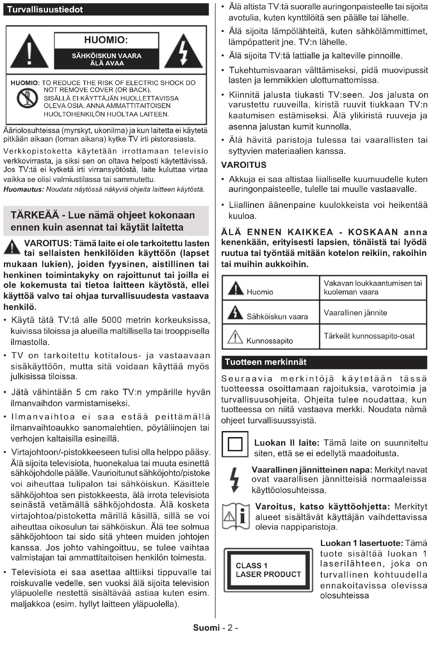 Varoitus, katso käyttöohjetta: Merkityt alueet sisältävät käyttäjän vaihdettavissa olevia nappiparistoja. CLASS 1 LASER PRODUCT Luokan 1 lasertuote: Tämä tuote sisältää luokan 1 laserilähteen, joka on turvallinen kohtuudella ennakoitavissa olevissa olosuhteissaSuomi - 3 - VAROITUS
