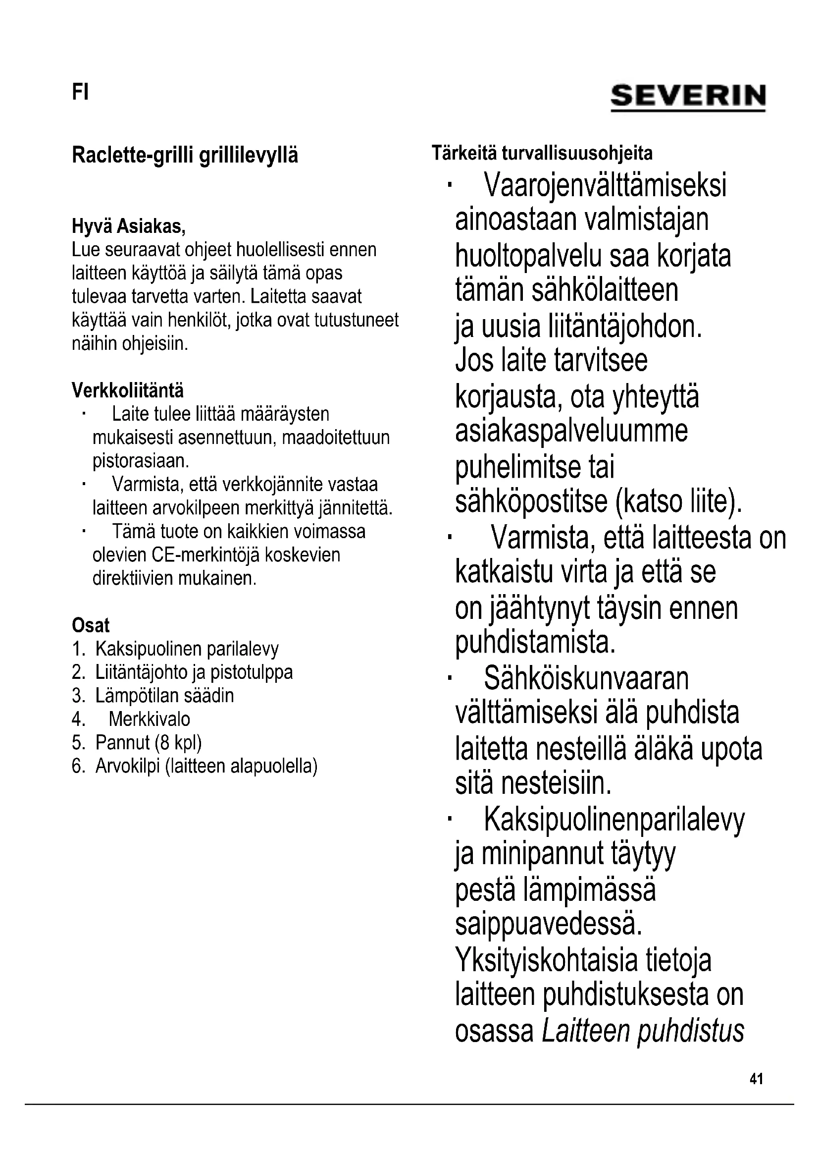 Tärkeitä turvallisuusohjeita ∙ Vaarojen välttämiseksi ainoastaan valmistajan huoltopalvelu saa korjata tämän sähkölaitteen ja uusia liitäntäjohdon. Jos laite tarvitsee korjausta, ota yhteyttä asiakaspalveluumme puhelimitse tai sähköpostitse (katso liite). ∙ Varmista, että laitteesta on katkaistu virta ja että se on jäähtynyt täysin ennen puhdistamista. ∙ Sähköiskun vaaran välttämiseksi älä puhdista laitetta nesteillä äläkä upota sitä nesteisiin. ∙ Kaksipuolinen parilalevy ja minipannut täytyy pestä lämpimässä saippuavedessä. Yksityiskohtaisia tietoja laitteen puhdistuksesta on osassa Laitteen puhdistus FI42 104 x 142 mm ja hoito. ∙ Tätä laitetta ei ole tarkoitettu käytettäväksi erillisen ajastimen tai kaukosäätimen kanssa. ∙ Tämä laite on tarkoitettu kotitalouskäyttöön tai vastaavaan, kuten - ruokalat, toimistot ja muut kaupalliset ympäristöt, - maatalousyritykset, - hotellien, motellien jne. ja vastaavien yritysten asiakkaat, - aamiaisen ja majoituksen tarjoavat majatalot. ∙ Tätä laitetta saavat käyttää lapset (vähintään 8-vuotiaat) sekä henkilöt, joilla on fyysisesti, aistillisesti tai henkisesti rajoittunut toimintakyky tai joilla on puuttuvat tai vajavaiset tiedot laitteen toiminnasta, mikäli heitä valvotaan tai ohjataan laitteen käytössä ja he ymmärtävät täysin kaikki käyttöön liittyvät vaarat ja turvatoimenpiteet. ∙ Lasten ei saa antaa leikkiä laitteella. ∙ Lasten ei saa antaa tehdä laitteen puhdistus- tai huoltotoimenpiteitä, elleivät he ole aikuisen valvonnassa sekä vähintään 8 vuotta vanhoja. ∙ Laite ja sen liitäntäjohto täytyy aina pitää alle 8-vuotiaiden ulottumattomissa. ∙ Varoitus: Pidä lapset poissa pakkausmateriaalien luota potentiaalisen vaaratilanteen esim. tukehtumisvaaran vuoksi. ∙ Ennen käyttöönottoa tarkista laite ja mahdolliset lisäosat vaurioiden varalta. Jos laite on esimerkiksi pudonnut kovalle pinnalle tai liitäntäjohdon vetämiseen on käytetty liikaa voimaa, laitetta ei saa enää käyttää: näkymättömätkin vauriot voivat aiheuttaa laitetta käytettäessä vaaratilanteita. ∙ Kotelon pinnat, käännettävä grillilevy ja pannut ovat kuumia käytön aikana ja104 x 142 mm