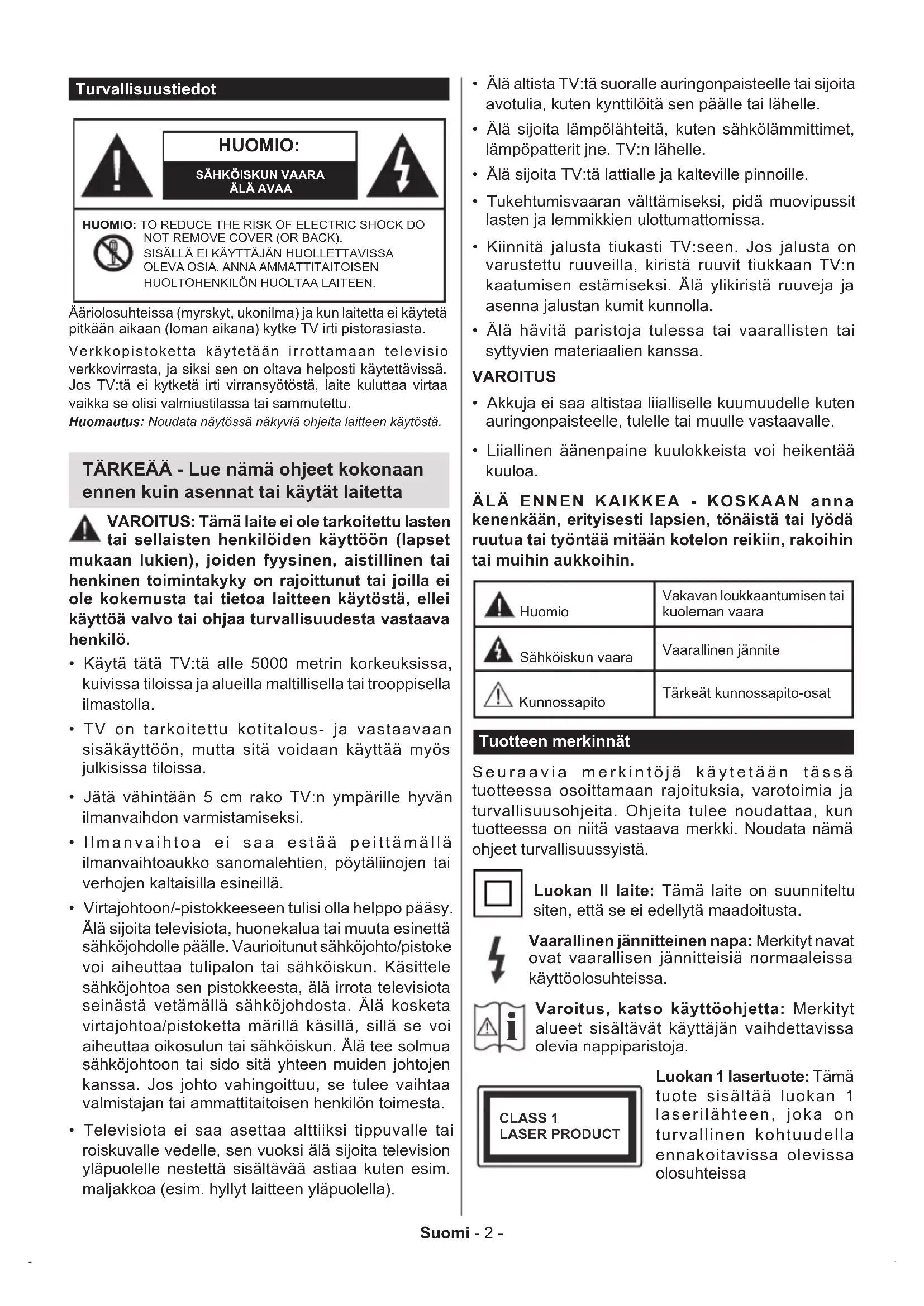 Varoitus, katso käyttöohjetta: Merkityt alueet sisältävät käyttäjän vaihdettavissa olevia nappiparistoja. CLASS 1 LASER PRODUCT Luokan 1 lasertuote: Tämä tuote sisältää luokan 1 laserilähteen, joka on turvallinen kohtuudella ennakoitavissa olevissa olosuhteissaSuomi - 3 - VAROITUS