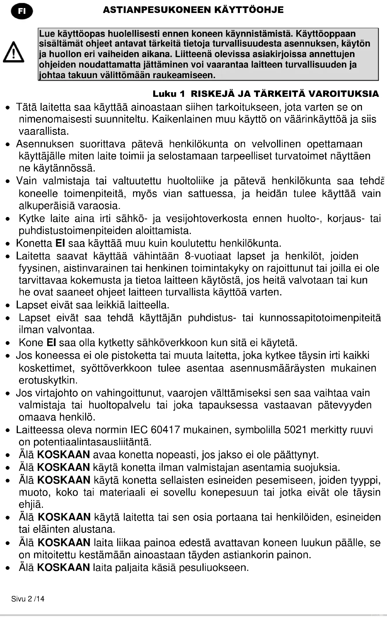 Lue käyttöopas huolellisesti ennen koneen käynnistämistä. Käyttöoppaan sisältämät ohjeet antavat tärkeitä tietoja turvallisuudesta asennuksen, käytön ja huollon eri vaiheiden aikana. Liitteenä olevissa asiakirjoissa annettujen ohjeiden noudattamatta jättäminen voi vaarantaa laitteen turvallisuuden ja johtaa takuun välittömään raukeamiseen. Luku 1 RISKEJÄ JA TÄRKEITÄ VAROITUKSIA Tätä laitetta saa käyttää ainoastaan siihen tarkoitukseen, jota varten se on nimenomaisesti suunniteltu. Kaikenlainen muu käyttö on väärinkäyttöä ja siis vaarallista. Asennuksen suorittava pätevä henkilökunta on velvollinen opettamaan käyttäjälle miten laite toimii ja selostamaan tarpeelliset turvatoimet näyttäen ne käytännössä. Vain valmistaja tai valtuutettu huoltoliike ja pätevä henkilökunta saa tehdä koneelle toimenpiteitä, myös vian sattuessa, ja heidän tulee käyttää vain alkuperäisiä varaosia. Kytke laite aina irti sähkö- ja vesijohtoverkosta ennen huolto-, korjaus- tai puhdistustoimenpiteiden aloittamista. Konetta EI saa käyttää muu kuin koulutettu henkilökunta. Laitetta saavat käyttää vähintään 8-vuotiaat lapset ja henkilöt, joiden fyysinen, aistinvarainen tai henkinen toimintakyky on rajoittunut tai joilla ei ole tarvittavaa kokemusta ja tietoa laitteen käytöstä, jos heitä valvotaan tai kun he ovat saaneet ohjeet laitteen turvallista käyttöä varten. Lapset eivät saa leikkiä laitteella. Lapset eivät saa tehdä käyttäjän puhdistus- tai kunnossapitotoimenpiteitä ilman valvontaa. Kone EI saa olla kytketty sähköverkkoon kun sitä ei käytetä. Jos koneessa ei ole pistoketta tai muuta laitetta, joka kytkee täysin irti kaikki koskettimet, syöttöverkkoon tulee asentaa asennusmääräysten mukainen erotuskytkin. Jos virtajohto on vahingoittunut, vaarojen välttämiseksi sen saa vaihtaa vain valmistaja tai huoltopalvelu tai joka tapauksessa vastaavan pätevyyden omaava henkilö. Laitteessa oleva normin IEC 60417 mukainen, symbolilla 5021 merkitty ruuvi on potentiaalintasausliitäntä. Älä KOSKAAN avaa konetta nopeasti, jos jakso ei ole päättynyt. Älä KOSKAAN käytä konetta ilman valmistajan asentamia suojuksia. Älä KOSKAAN käytä konetta sellaisten esineiden pesemiseen, joiden tyyppi, muoto, koko tai materiaali ei sovellu konepesuun tai jotka eivät ole täysin ehjiä. Älä KOSKAAN käytä laitetta tai sen osia portaana tai henkilöiden, esineiden tai eläinten alustana. Älä KOSKAAN laita liikaa painoa edestä avattavan koneen luukun päälle, se on mitoitettu kestämään ainoastaan täyden astiankorin painon. Älä KOSKAAN laita paljaita käsiä pesuliuokseen.ASTIANPESUKONEEN KÄYTTÖOHJE Sivu 3 /14