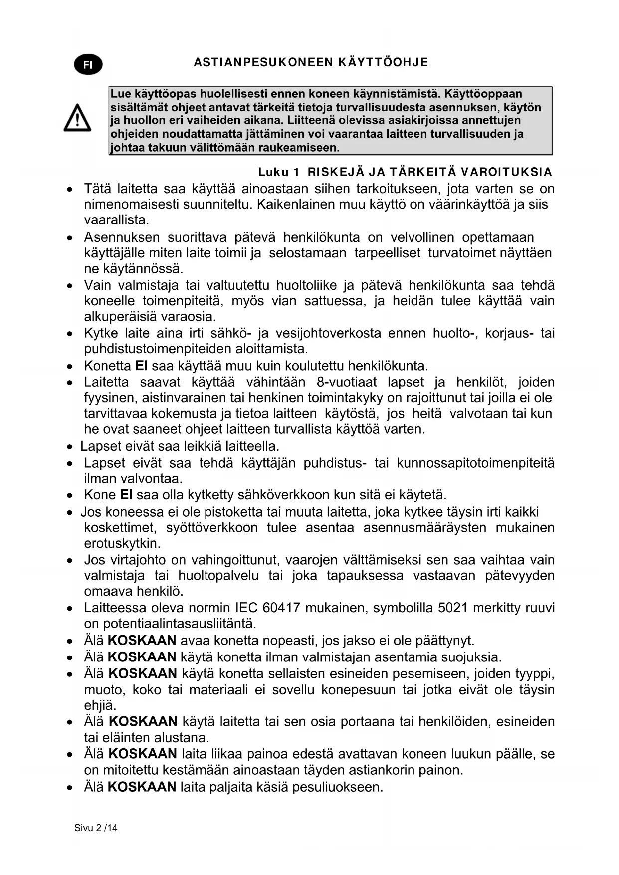 sennuksen suorittava pätevä henkilökunta on velvollinen opettamaan käyttäjälle miten laite toimii ja selostamaan tarpeelliset turvatoimet näyttäen ne käytännössä. Vain valmistaja tai valtuutettu huoltoliike ja pätevä henkilökunta saa tehdä koneelle toimenpiteitä, myös vian sattuessa, ja heidän tulee käyttää vain alkuperäisiä varaosia. Kytke laite aina irti sähkö- ja vesijohtoverkosta ennen huolto-, korjaus- tai puhdistustoimenpiteiden aloittamista. Konetta EI saa käyttää muu kuin koulutettu henkilökunta. Laitetta saavat käyttää vähintään 8-vuotiaat lapset ja henkilöt, joiden fyysinen, aistinvarainen tai henkinen toimintakyky on rajoittunut tai joilla ei ole tarvittavaa kokemusta ja tietoa laitteen käytöstä, jos heitä valvotaan tai kun he ovat saaneet ohjeet laitteen turvallista käyttöä varten. Lapset eivät saa leikkiä laitteella. Lapset eivät saa tehdä käyttäjän puhdistus- tai kunnossapitotoimenpiteitä ilman valvontaa. Kone EI saa olla kytketty sähköverkkoon kun sitä ei käytetä. Jos koneessa ei ole pistoketta tai muuta laitetta, joka kytkee täysin irti kaikki koskettimet, syöttöverkkoon tulee asentaa asennusmääräysten mukainen erotuskytkin. Jos virtajohto on vahingoittunut, vaarojen välttämiseksi sen saa vaihtaa vain valmistaja tai huoltopalvelu tai joka tapauksessa vastaavan pätevyyden omaava henkilö. Laitteessa oleva normin IEC 60417 mukainen, symbolilla 5021 merkitty ruuvi on potentiaalintasausliitäntä. Älä KOSKAAN avaa konetta nopeasti, jos jakso ei ole päättynyt. Älä KOSKAAN käytä konetta ilman valmistajan asentamia suojuksia. Älä KOSKAAN käytä konetta sellaisten esineiden pesemiseen, joiden tyyppi, muoto, koko tai materiaali ei sovellu konepesuun tai jotka eivät ole täysin ehjiä. Älä KOSKAAN käytä laitetta tai sen osia portaana tai henkilöiden, esineiden tai eläinten alustana. Älä KOSKAAN laita liikaa painoa edestä avattavan koneen luukun päälle, se on mitoitettu kestämään ainoastaan täyden astiankorin painon. Älä KOSKAAN laita paljaita käsiä pesuliuokseen.ASTIANPESUKONEEN KÄYTTÖOHJE Sivu 3 /14