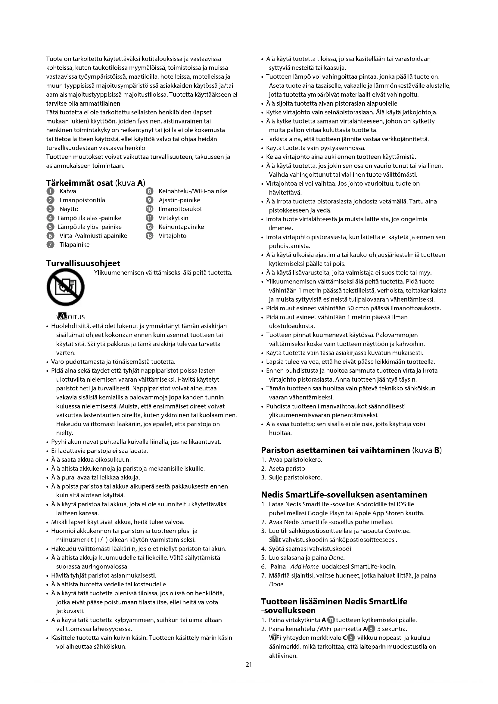 Pika-aloitusopas WiFi-yhteydellä toimiva älykäs keraaminen lämpöpuhallin HTFA22WTWKatso tarkemmat tiedot käyttöoppaan laajemmasta verkkoversiosta: ned.is/htfa22wtw Käyttötarkoitus Tämä tuote on lämpöpuhallin, jolla käyttäjä voi säätää ympäristön lämpötilaa.Tätä tuotetta voidaan ohjata Nedis SmartLife -sovelluksella, tuotteen painikkeilla tai mukana toimitetulla kaukosäätimellä.Tämä tuote soveltuu ainoastaan hyvin eristettyihin tiloihin tai satunnaiseen käyttöön.Tuote on tarkoitettu vain sisäkäyttöön. Sätta i eller byta batteri (bild B)