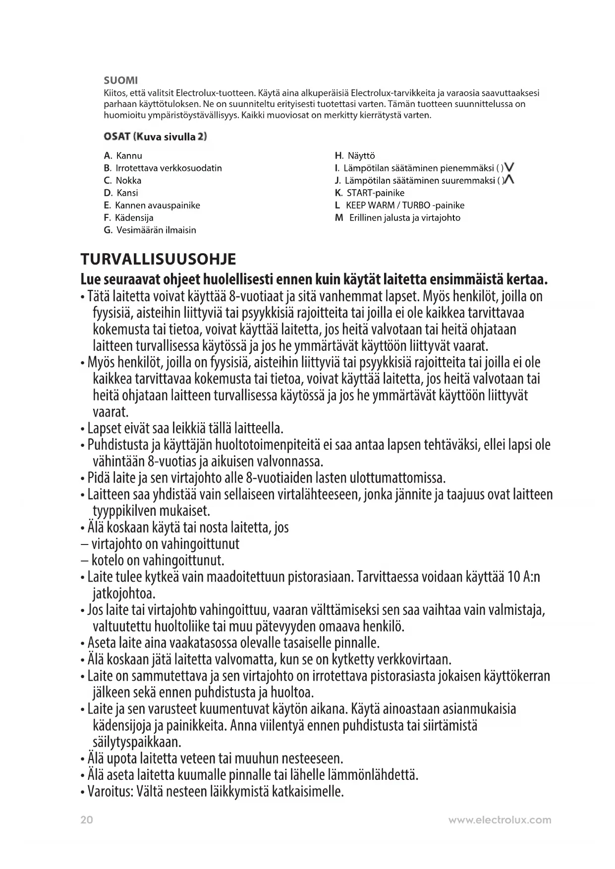 J. Lämpötilan säätäminen suuremmaksi ( ) K. START-painike L KEEP WARM / TURBO -painike M Erillinen jalusta ja virtajohto TURVALLISUUSOHJE Lue seuraavat ohjeet huolellisesti ennen kuin käytät laitetta ensimmäistä kertaa.