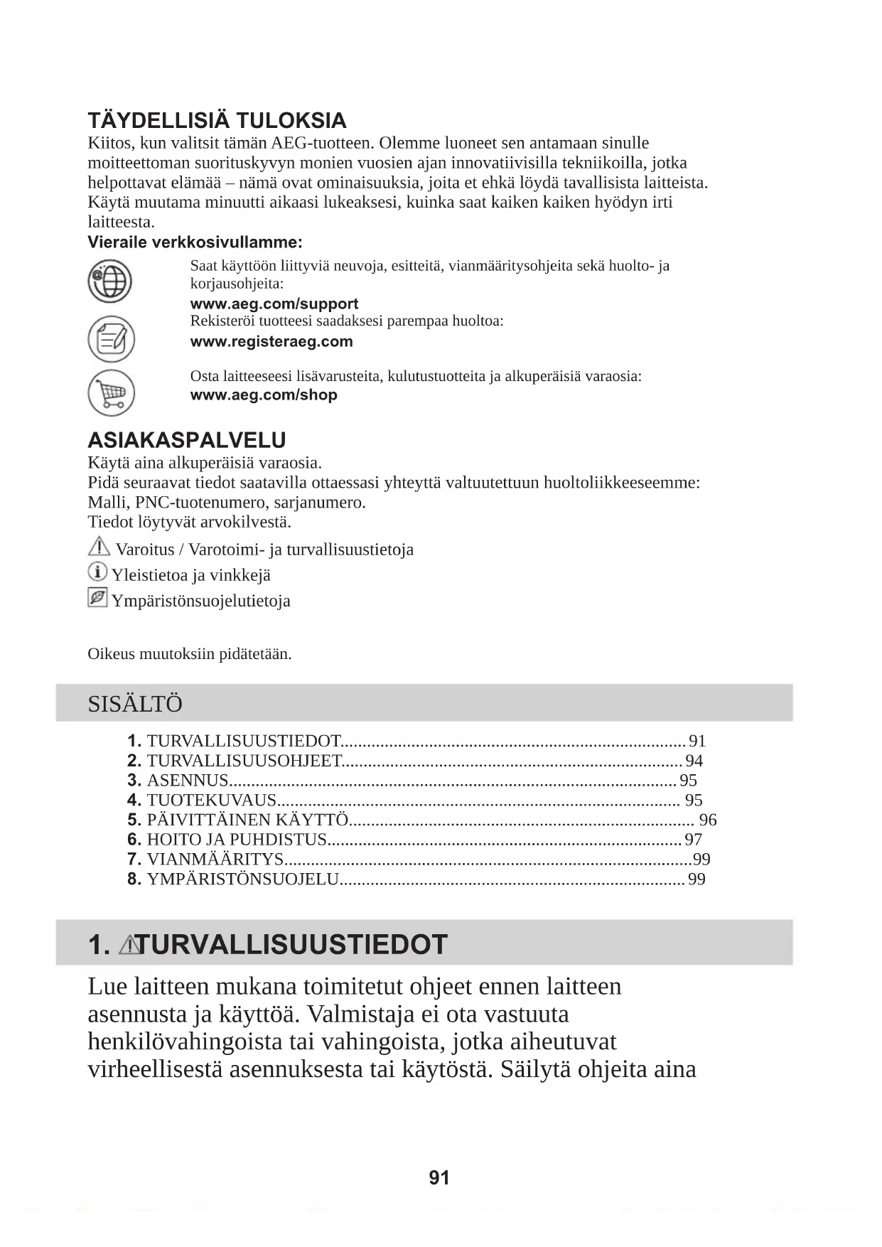 Kiitos, kun valitsit tämän AEG-tuotteen. Olemme luoneet sen antamaan sinullemoitteettoman suorituskyvyn monien vuosien ajan innovatiivisilla tekniikoilla, jotkahelpottavat elämää – nämä ovat ominaisuuksia, joita et ehkä löydä tavallisista laitteista.Käytä muutama minuutti aikaasi lukeaksesi, kuinka saat kaiken kaiken hyödyn irtilaitteesta.Vieraile verkkosivullamme:Saat käyttöön liittyviä neuvoja, esitteitä, vianmääritysohjeita sekä huolto- jakorjausohjeita:www.aeg.com/supportRekisteröi tuotteesi saadaksesi parempaa huoltoa:www.registeraeg.comOsta laitteeseesi lisävarusteita, kulutustuotteita ja alkuperäisiä varaosia:www.aeg.com/shop ASIAKASPALVELU Käytä aina alkuperäisiä varaosia.Pidä seuraavat tiedot saatavilla ottaessasi yhteyttä valtuutettuun huoltoliikkeeseemme:Malli, PNC-tuotenumero, sarjanumero.Tiedot löytyvät arvokilvestä. Varoitus / Varotoimi- ja turvallisuustietoja Yleistietoa ja vinkkejä YmpäristönsuojelutietojaOikeus muutoksiin pidätetään. SISÄLTÖ
