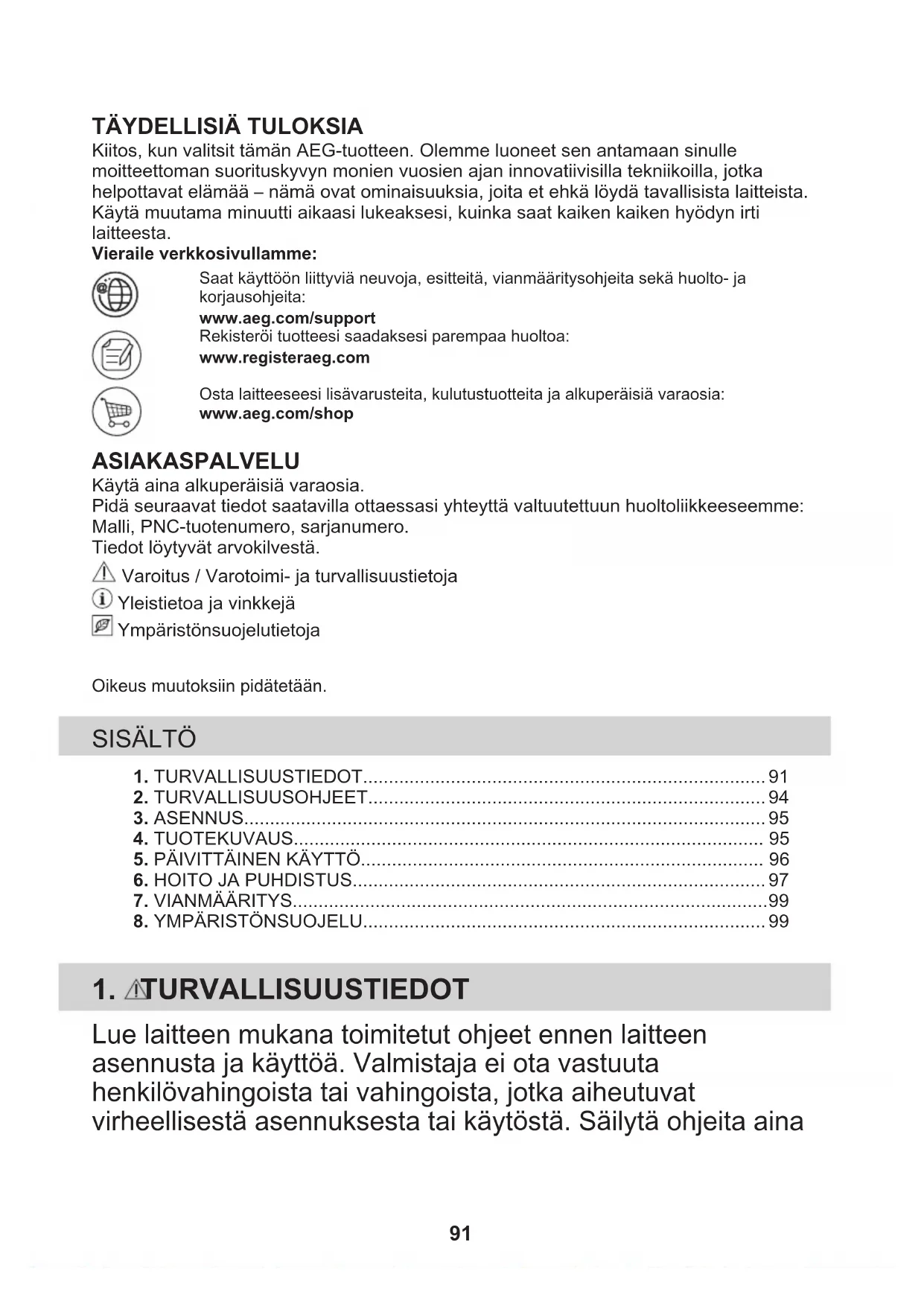 Kiitos, kun valitsit tämän AEG-tuotteen. Olemme luoneet sen antamaan sinullemoitteettoman suorituskyvyn monien vuosien ajan innovatiivisilla tekniikoilla, jotkahelpottavat elämää – nämä ovat ominaisuuksia, joita et ehkä löydä tavallisista laitteista.Käytä muutama minuutti aikaasi lukeaksesi, kuinka saat kaiken kaiken hyödyn irtilaitteesta.Vieraile verkkosivullamme:Saat käyttöön liittyviä neuvoja, esitteitä, vianmääritysohjeita sekä huolto- jakorjausohjeita:www.aeg.com/supportRekisteröi tuotteesi saadaksesi parempaa huoltoa:www.registeraeg.comOsta laitteeseesi lisävarusteita, kulutustuotteita ja alkuperäisiä varaosia:www.aeg.com/shop ASIAKASPALVELU Käytä aina alkuperäisiä varaosia.Pidä seuraavat tiedot saatavilla ottaessasi yhteyttä valtuutettuun huoltoliikkeeseemme:Malli, PNC-tuotenumero, sarjanumero.Tiedot löytyvät arvokilvestä. Varoitus / Varotoimi- ja turvallisuustietoja Yleistietoa ja vinkkejä YmpäristönsuojelutietojaOikeus muutoksiin pidätetään. SISÄLTÖ