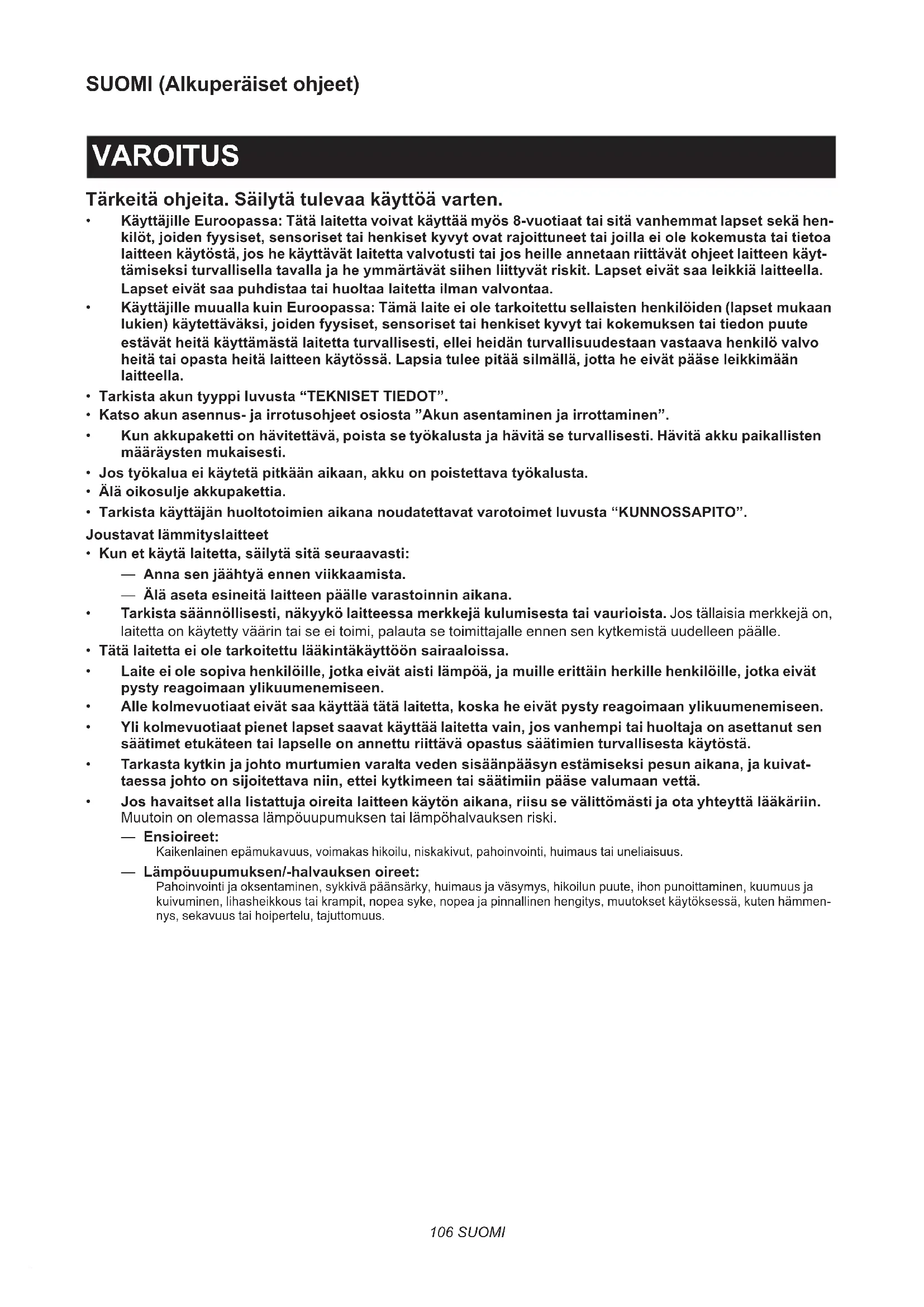 SUOMI (Alkuperäiset ohjeet) VAROITUS Tärkeitä ohjeita. Säilytä tulevaa käyttöä varten.