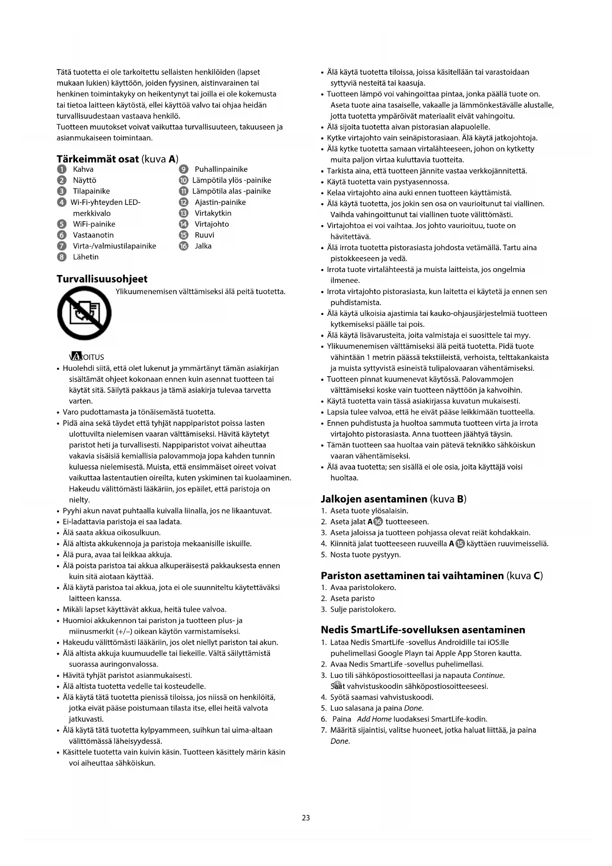 Done. Tätä tuotetta ei ole tarkoitettu sellaisten henkilöiden (lapset mukaan lukien) käyttöön, joiden fyysinen, aistinvarainen tai henkinen toimintakyky on heikentynyt tai joilla ei ole kokemusta tai tietoa laitteen käytöstä, ellei käyttöä valvo tai ohjaa heidän turvallisuudestaan vastaava henkilö. Tuotteen muutokset voivat vaikuttaa turvallisuuteen, takuuseen ja asianmukaiseen toimintaan. Tärkeimmät osat (kuva A) 1 Kahva 2 Näyttö 3 Tilapainike 4 Wi-Fi-yhteyden LED- merkkivalo 5 WiFi-painike 6 Vastaanotin 7 Virta-/valmiustilapainike 8 Lähetin 9 Puhallinpainike q Lämpötila ylös -painike w Lämpötila alas -painike e Ajastin-painike r Virtakytkin t Virtajohto y Ruuvi u Jalka Turvallisuusohjeet Ylikuumenemisen välttämiseksi älä peitä tuotetta.