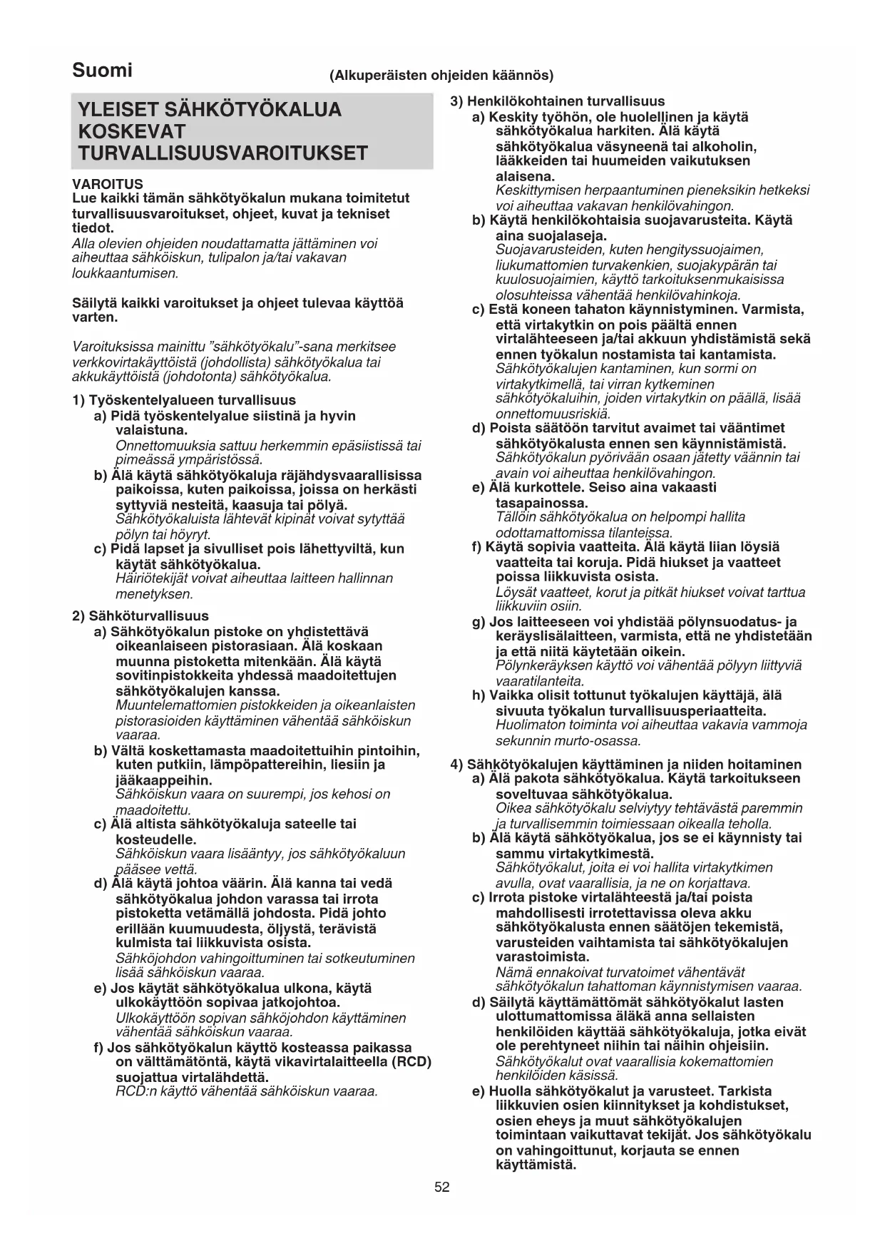 KOSKEVAT TURVALLISUUSVAROITUKSET VAROITUS Lue kaikki tämän sähkötyökalun mukana toimitetut turvallisuusvaroitukset, ohjeet, kuvat ja tekniset tiedot. Alla olevien ohjeiden noudattamatta jättäminen voi aiheuttaa sähköiskun, tulipalon ja/tai vakavan loukkaantumisen. Säilytä kaikki varoitukset ja ohjeet tulevaa käyttöä varten. Varoituksissa mainittu ”sähkötyökalu”-sana merkitsee verkkovirtakäyttöistä (johdollista) sähkötyökalua tai akkukäyttöistä (johdotonta) sähkötyökalua.