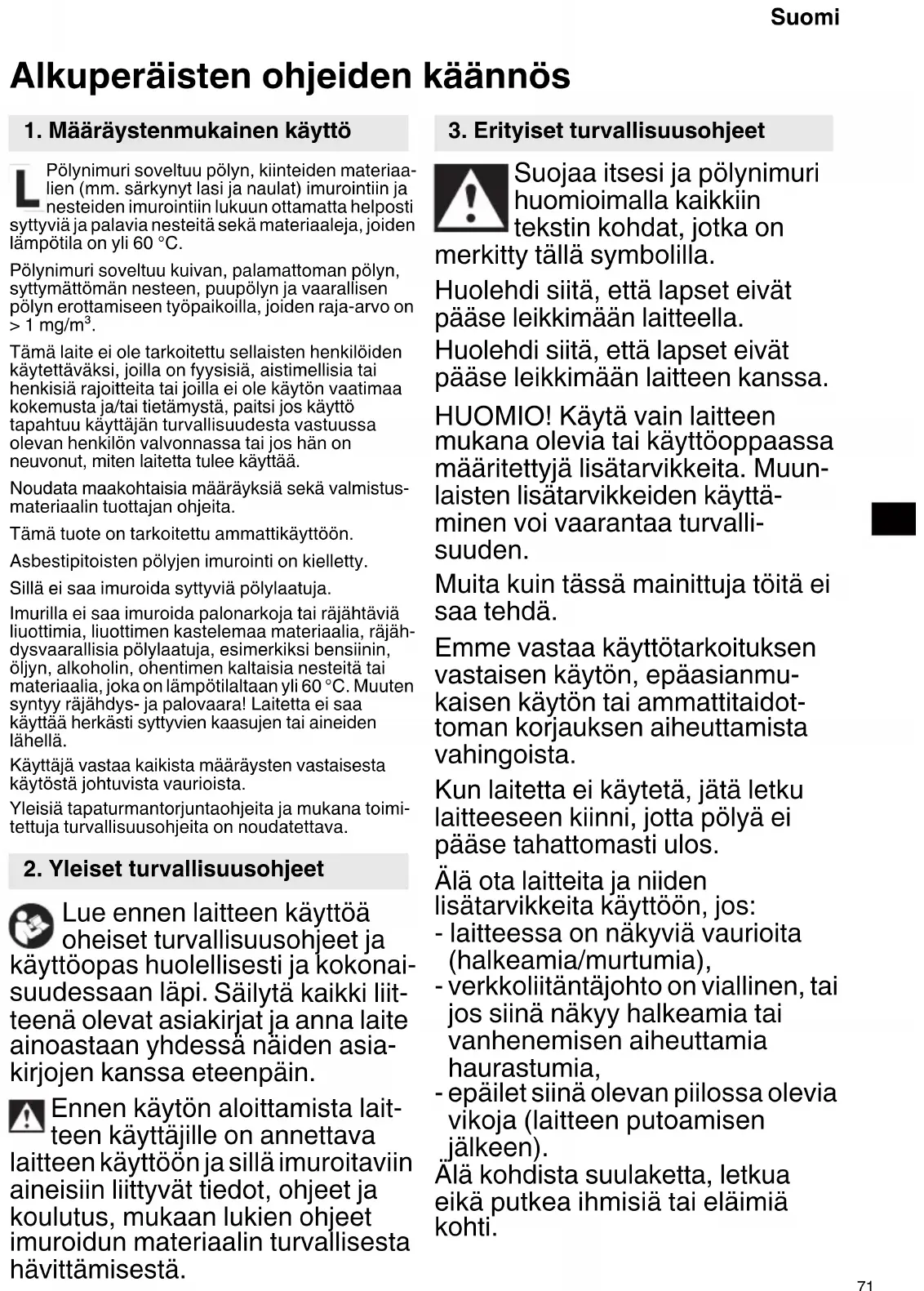 RP250YBL_C99749871_305.book 71 ページ 2023年4月6日 木曜日 午後12時6分72 Suomi VAROITUS - Kytke välittömästi pois toiminnasta, jos laitteesta tulee ulos vaahtoa tai vettä. Tyhjennä säiliö ja tarvittaessa laskossuodatin. Älä missään tapauksessa kiipeä laitteen päälle tai istu sen päällä. Pidä liitäntäjohtoa ja letkua aina niin, että ne eivät aiheuta kompas- tumisvaaraa. Älä vedä liitäntäjohtoa terävien reunojen yli, älä taita sitä äläkä jätä sitä puristuksiin. Jos laitteen liitäntäjohto vaurioituu, se täytyy korvata erityisellä liitäntä- johdolla. Katso luku Korjaus. Kytke vain sellaiseen pistorasiaan, joka on varustettu suojakosketti- mella. Älä käytä vaurioitunutta jatko- johtoa. Älä missään tapauksessa kiinnitä tai irrota verkkopistoketta märin käsin. Kun irrotat pistokkeen pisto- rasiasta, vedä aina vain verkkopis- tokkeesta, ei missään tapauk- sessa johdosta. VAROITUS - Laitteen pistorasiaa saa käyttää vain käyttöohjeissa määritettyihin tarkoituksiin. Älä jätä laitetta ilman valvontaa. Jos työt keskeytetään pitemmäksi ajaksi, vedä verkkopistoke irti pistorasiasta. Pölynimuria ei saa käyttää eikä säilyttää kosteissa ulko-olosuh- teissa. TÄRKEÄÄ – laitetta saa säilyttää vain sisätiloissa. Hapot, asetoni ja liuottimet voivat syövyttää laitteen osia. Kytke laite pois päältä ja vedä verkkopistoke irti pistorasiasta jokaisen käyttökerran jälkeen ja aina ennen huolto- ja puhdistus- töiden aloittamista. Pölynimurin puhdistamiseen ei saa käyttää höyry- tai painepesuria. Kannen sisäpuoli tulee pitää aina kuivana. Laitteeseen muodostuu mikro- organismeja, jos puhdistusta ei tehdä pitkään aikaan, varsinkin elintarvikkeita käsittelevissä yrityk- sissä: Pölynimuri on puhdistettava ja desinfioitava heti käytön jälkeen. Älä missään tapauksessa avaa laitetta ulkona sateella tai myrskyi- sellä ilmalla. Älä käytä ulkona matalissa lämpö- tiloissa. Laitetta ei saa käyttää räjähdys- vaarallisissa tiloissa. Varmista, että pölynimuri on vakaa. Huoneessa täytyy olla riittävän tehokas ilmanvaihto, jos poistoilma puhalletaan takaisin huoneeseen. Noudata maakohtaisia määräyksiä Pidä laitteen pistorasia kuivana äläkä altista sitä kosteudelle. Pölynimurin ja sähkötyökalun väliin ei saa kytkeä jatkojohtoja. Työkalun pistorasiaa saa käyttää vain, kun pölynimuri on kuivassa ympäristössä. RP250YBL_C99749871_305.book 72 ページ 2023年4月6日 木曜日 午後12時6分73 Suomi VAROITUS! Tämä laite sisältää terveydelle haitallista pölyä. Tyhjennyksen ja huollon, mukaan lukien pölynkeruusäiliön poistamisen, saavat suorittaa vain ammattihenkilöt, joilla on yllään vastaavat suojavarusteet. VAROITUS yleisestä vaarasta! HUOMIO! Älä aloita laitteen käyttöä ennen kuin olet lukenut käyttöoppaan! VAROITUS - Käyttöhenkilöstön on saatava riittävät ohjeet pölynimurin käytöstä ja materiaaleista, joihin sitä käytetään. Erityiset turvallisuusohjeet Varoitusmerkki koskien laitteita, joiden pölyluokka on L: Laite soveltuu lievästi terveydelle haitallisten aineiden imurointiin. Laite ei sovellu sellaiseen imurointiin, jolla vähennetään puupölyä hengitysilmasta. Tietyistä materiaaleista (esim. lyijypitoinen maalipinta, jotkut puulajit, mineraalit ja metallit) syntyvä pöly voi olla terveydelle haitallista. Pölyn koskettaminen tai hengittäminen voi aiheuttaa allergisia reaktioita ja/tai hengitysteiden sairauksia käyttäjässä tai lähellä olevissa ihmisissä. Tiettyjen pölytyyppien (esim. tammi- tai pyökkipöly) katsotaan aiheuttavan syöpää, erityisesti puunkäsittelyssä käytettävien lisäaineiden yhteydessä (kromaatti, puunsuojausaine).