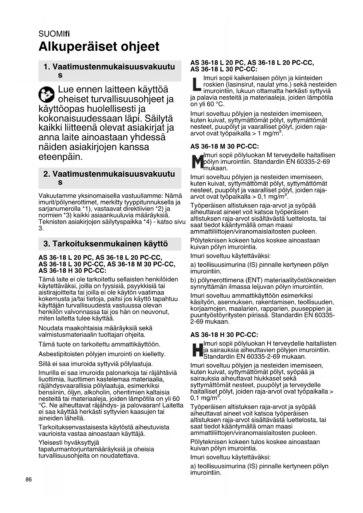 AS 36-18 L 20 PC, AS 36-18 L 20 PC-CC, AS 36-18 L 30 PC-CC, AS 36-18 M 30 PC-CC, AS 36-18 H 30 PC-CC: Tämä laite ei ole tarkoitettu sellaisten henkilöiden käytettäväksi, joilla on fyysisiä, psyykkisiä tai aistirajoitteita tai joilla ei ole käytön vaatimaa kokemusta ja/tai tietoja, paitsi jos käyttö tapahtuu käyttäjän turvallisuudesta vastuussa olevan henkilön valvonnassa tai jos hän on neuvonut, miten laitetta tulee käyttää. Noudata maakohtaisia määräyksiä sekä valmistusmateriaalin tuottajan ohjeita. Tämä tuote on tarkoitettu ammattikäyttöön. Asbestipitoisten pölyjen imurointi on kielletty. Sillä ei saa imuroida syttyviä pölylaatuja. Imurilla ei saa imuroida palonarkoja tai räjähtäviä liuottimia, liuottimen kastelemaa materiaalia, räjähdysvaarallisia pölylaatuja, esimerkiksi bensiinin, öljyn, alkoholin, ohentimien kaltaisia nesteitä tai materiaaleja, joiden lämpötila on yli 60 °C. Ne aiheuttavat räjähdys- ja palovaaran! Laitetta ei saa käyttää herkästi syttyvien kaasujen tai aineiden lähellä. Tarkoituksenvastaisesta käytöstä aiheutuvista vaurioista vastaa ainoastaan käyttäjä. Yleisesti hyväksyttyjä tapaturmantorjuntamääräyksiä ja oheisia turvallisuusohjeita on noudatettava. AS 36-18 L 20 PC, AS 36-18 L 20 PC-CC, AS 36-18 L 30 PC-CC: Imuri sopii kaikenlaisen pölyn ja kiinteiden roskien (lasinsirut, naulat yms.) sekä nesteiden imurointiin, lukuun ottamatta herkästi syttyviä ja palavia nesteitä ja materiaaleja, joiden lämpötila on yli 60 °C. Imuri soveltuu pölyjen ja nesteiden imemiseen, kuten kuivat, syttymättömät pölyt, syttymättömät nesteet, puupölyt ja vaaralliset pölyt, joiden raja- arvot ovat työpaikalla > 1 mg/m³. AS 36-18 M 30 PC-CC: Imuri sopii pölyluokan M terveydelle haitallisen pölyn imurointiin. Standardin EN 60335-2-69 mukaan. Imuri soveltuu pölyjen ja nesteiden imemiseen, kuten kuivat, syttymättömät pölyt, syttymättömät nesteet, puupölyt ja vaaralliset pölyt, joiden raja- arvot ovat työpaikalla > 0,1 mg/m³. Työperäisen altistuksen raja-arvot ja syöpää aiheuttavat aineet voit katsoa työperäisen altistuksen raja-arvot sisältävästä luettelosta, tai saat tiedot kääntymällä oman maasi ammattiliittojen/viranomaislaitosten puoleen. Pölyteknisen kokeen tulos koskee ainoastaan kuivan pölyn imurointia. Imuri soveltuu käytettäväksi: a) teollisuusimurina (IS) pinnalle kertyneen pölyn imurointiin. b) pölynerottimena (ENT) materiaalityöstökoneiden synnyttämän ilmassa leijuvan pölyn imurointiin. Imuri soveltuu ammattikäyttöön esimerkiksi käsityön, asennuksen, rakentamisen, teollisuuden, korjaamojen, maalarien, rapparien, puuseppien ja puuntyöstöyritysten piirissä. Standardin EN 60335- 2-69 mukaan. AS 36-18 H 30 PC-CC: Imuri sopii pölyluokan H terveydelle haitallisten ja sairauksia aiheuttavien pölyjen imurointiin. Standardin EN 60335-2-69 mukaan. Imuri soveltuu pölyjen ja nesteiden imemiseen, kuten kuivat, syttymättömät pölyt, syöpää ja sairauksia aiheuttavat hiukkaset sekä syttymättömät nesteet, puupölyt ja terveydelle haitalliset pölyt, joiden raja-arvot ovat työpaikalla > 0,1 mg/m³. Työperäisen altistuksen raja-arvot ja syöpää aiheuttavat aineet voit katsoa työperäisen altistuksen raja-arvot sisältävästä luettelosta, tai saat tiedot kääntymällä oman maasi ammattiliittojen/viranomaislaitosten puoleen. Pölyteknisen kokeen tulos koskee ainoastaan kuivan pölyn imurointia. Imuri soveltuu käytettäväksi: a) teollisuusimurina (IS) pinnalle kertyneen pölyn imurointiin.