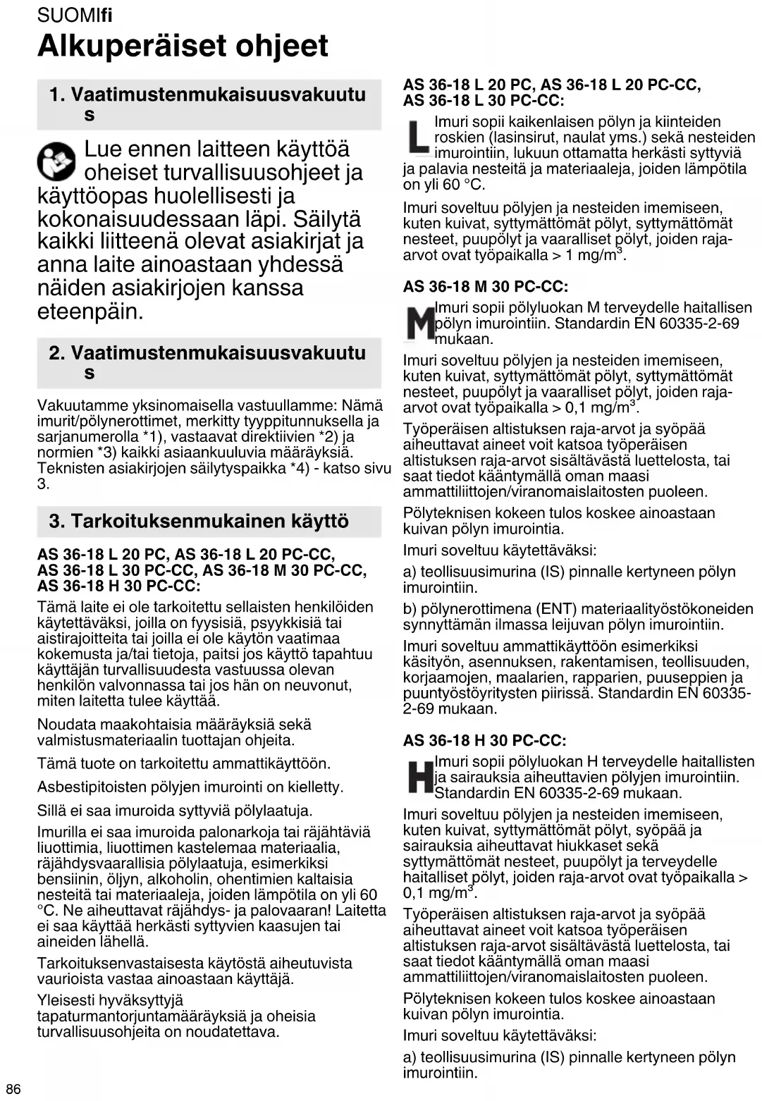 AS 36-18 L 20 PC, AS 36-18 L 20 PC-CC, AS 36-18 L 30 PC-CC, AS 36-18 M 30 PC-CC, AS 36-18 H 30 PC-CC: Tämä laite ei ole tarkoitettu sellaisten henkilöiden käytettäväksi, joilla on fyysisiä, psyykkisiä tai aistirajoitteita tai joilla ei ole käytön vaatimaa kokemusta ja/tai tietoja, paitsi jos käyttö tapahtuu käyttäjän turvallisuudesta vastuussa olevan henkilön valvonnassa tai jos hän on neuvonut, miten laitetta tulee käyttää. Noudata maakohtaisia määräyksiä sekä valmistusmateriaalin tuottajan ohjeita. Tämä tuote on tarkoitettu ammattikäyttöön. Asbestipitoisten pölyjen imurointi on kielletty. Sillä ei saa imuroida syttyviä pölylaatuja. Imurilla ei saa imuroida palonarkoja tai räjähtäviä liuottimia, liuottimen kastelemaa materiaalia, räjähdysvaarallisia pölylaatuja, esimerkiksi bensiinin, öljyn, alkoholin, ohentimien kaltaisia nesteitä tai materiaaleja, joiden lämpötila on yli 60 °C. Ne aiheuttavat räjähdys- ja palovaaran! Laitetta ei saa käyttää herkästi syttyvien kaasujen tai aineiden lähellä. Tarkoituksenvastaisesta käytöstä aiheutuvista vaurioista vastaa ainoastaan käyttäjä. Yleisesti hyväksyttyjä tapaturmantorjuntamääräyksiä ja oheisia turvallisuusohjeita on noudatettava. AS 36-18 L 20 PC, AS 36-18 L 20 PC-CC, AS 36-18 L 30 PC-CC: Imuri sopii kaikenlaisen pölyn ja kiinteiden roskien (lasinsirut, naulat yms.) sekä nesteiden imurointiin, lukuun ottamatta herkästi syttyviä ja palavia nesteitä ja materiaaleja, joiden lämpötila on yli 60 °C. Imuri soveltuu pölyjen ja nesteiden imemiseen, kuten kuivat, syttymättömät pölyt, syttymättömät nesteet, puupölyt ja vaaralliset pölyt, joiden raja- arvot ovat työpaikalla > 1 mg/m³. AS 36-18 M 30 PC-CC: Imuri sopii pölyluokan M terveydelle haitallisen pölyn imurointiin. Standardin EN 60335-2-69 mukaan. Imuri soveltuu pölyjen ja nesteiden imemiseen, kuten kuivat, syttymättömät pölyt, syttymättömät nesteet, puupölyt ja vaaralliset pölyt, joiden raja- arvot ovat työpaikalla > 0,1 mg/m³. Työperäisen altistuksen raja-arvot ja syöpää aiheuttavat aineet voit katsoa työperäisen altistuksen raja-arvot sisältävästä luettelosta, tai saat tiedot kääntymällä oman maasi ammattiliittojen/viranomaislaitosten puoleen. Pölyteknisen kokeen tulos koskee ainoastaan kuivan pölyn imurointia. Imuri soveltuu käytettäväksi: a) teollisuusimurina (IS) pinnalle kertyneen pölyn imurointiin. b) pölynerottimena (ENT) materiaalityöstökoneiden synnyttämän ilmassa leijuvan pölyn imurointiin. Imuri soveltuu ammattikäyttöön esimerkiksi käsityön, asennuksen, rakentamisen, teollisuuden, korjaamojen, maalarien, rapparien, puuseppien ja puuntyöstöyritysten piirissä. Standardin EN 60335- 2-69 mukaan. AS 36-18 H 30 PC-CC: Imuri sopii pölyluokan H terveydelle haitallisten ja sairauksia aiheuttavien pölyjen imurointiin. Standardin EN 60335-2-69 mukaan. Imuri soveltuu pölyjen ja nesteiden imemiseen, kuten kuivat, syttymättömät pölyt, syöpää ja sairauksia aiheuttavat hiukkaset sekä syttymättömät nesteet, puupölyt ja terveydelle haitalliset pölyt, joiden raja-arvot ovat työpaikalla > 0,1 mg/m³. Työperäisen altistuksen raja-arvot ja syöpää aiheuttavat aineet voit katsoa työperäisen altistuksen raja-arvot sisältävästä luettelosta, tai saat tiedot kääntymällä oman maasi ammattiliittojen/viranomaislaitosten puoleen. Pölyteknisen kokeen tulos koskee ainoastaan kuivan pölyn imurointia. Imuri soveltuu käytettäväksi: a) teollisuusimurina (IS) pinnalle kertyneen pölyn imurointiin.