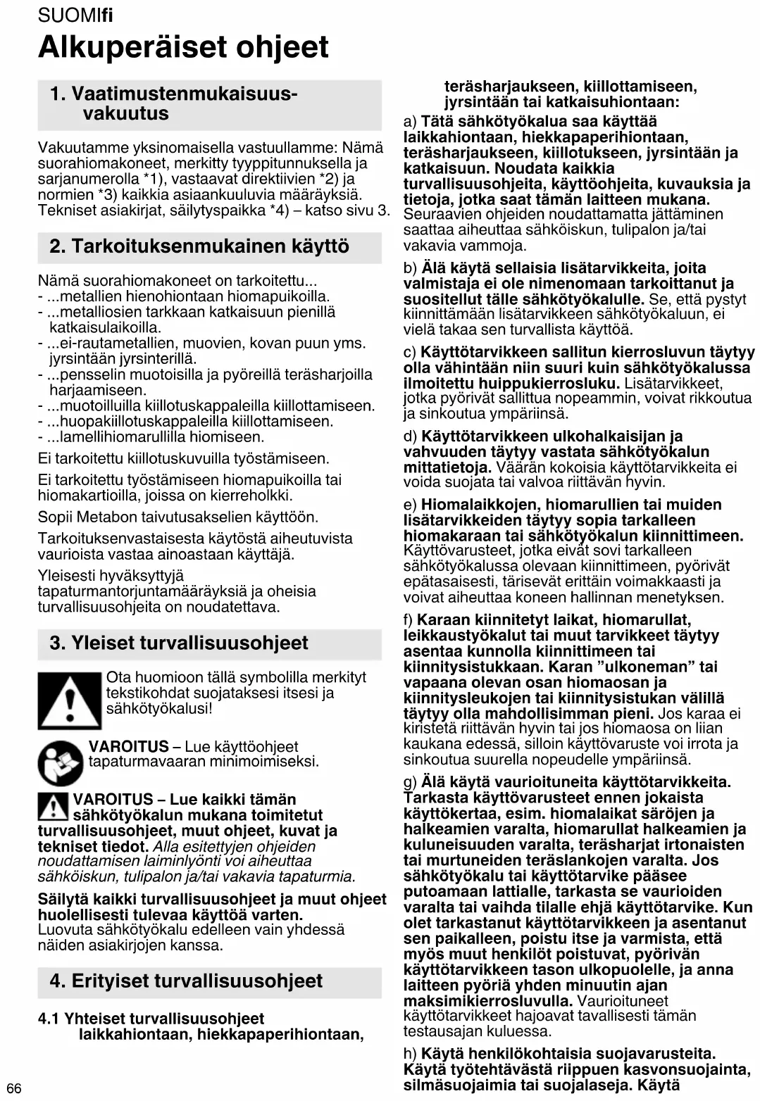 Alkuperäiset ohjeet Vakuutamme yksinomaisella vastuullamme: Nämä suorahiomakoneet, merkitty tyyppitunnuksella ja sarjanumerolla *1), vastaavat direktiivien *2) ja normien *3) kaikkia asiaankuuluvia määräyksiä. Tekniset asiakirjat, säilytyspaikka *4) – katso sivu 3. Nämä suorahiomakoneet on tarkoitettu... - ...metallien hienohiontaan hiomapuikoilla. - ...metalliosien tarkkaan katkaisuun pienillä katkaisulaikoilla. - ...ei-rautametallien, muovien, kovan puun yms. jyrsintään jyrsinterillä. - ...pensselin muotoisilla ja pyöreillä teräsharjoilla harjaamiseen. - ...muotoilluilla kiillotuskappaleilla kiillottamiseen. - ...huopakiillotuskappaleilla kiillottamiseen. - ...lamellihiomarullilla hiomiseen. Ei tarkoitettu kiillotuskuvuilla työstämiseen. Ei tarkoitettu työstämiseen hiomapuikoilla tai hiomakartioilla, joissa on kierreholkki. Sopii Metabon taivutusakselien käyttöön. Tarkoituksenvastaisesta käytöstä aiheutuvista vaurioista vastaa ainoastaan käyttäjä. Yleisesti hyväksyttyjä tapaturmantorjuntamääräyksiä ja oheisia turvallisuusohjeita on noudatettava. Ota huomioon tällä symbolilla merkityt tekstikohdat suojataksesi itsesi ja sähkötyökalusi! VAROITUS – Lue käyttöohjeet tapaturmavaaran minimoimiseksi. VAROITUS – Lue kaikki tämän sähkötyökalun mukana toimitetut turvallisuusohjeet, muut ohjeet, kuvat ja tekniset tiedot. Alla esitettyjen ohjeiden noudattamisen laiminlyönti voi aiheuttaa sähköiskun, tulipalon ja/tai vakavia tapaturmia. Säilytä kaikki turvallisuusohjeet ja muut ohjeet huolellisesti tulevaa käyttöä varten. Luovuta sähkötyökalu edelleen vain yhdessä näiden asiakirjojen kanssa.