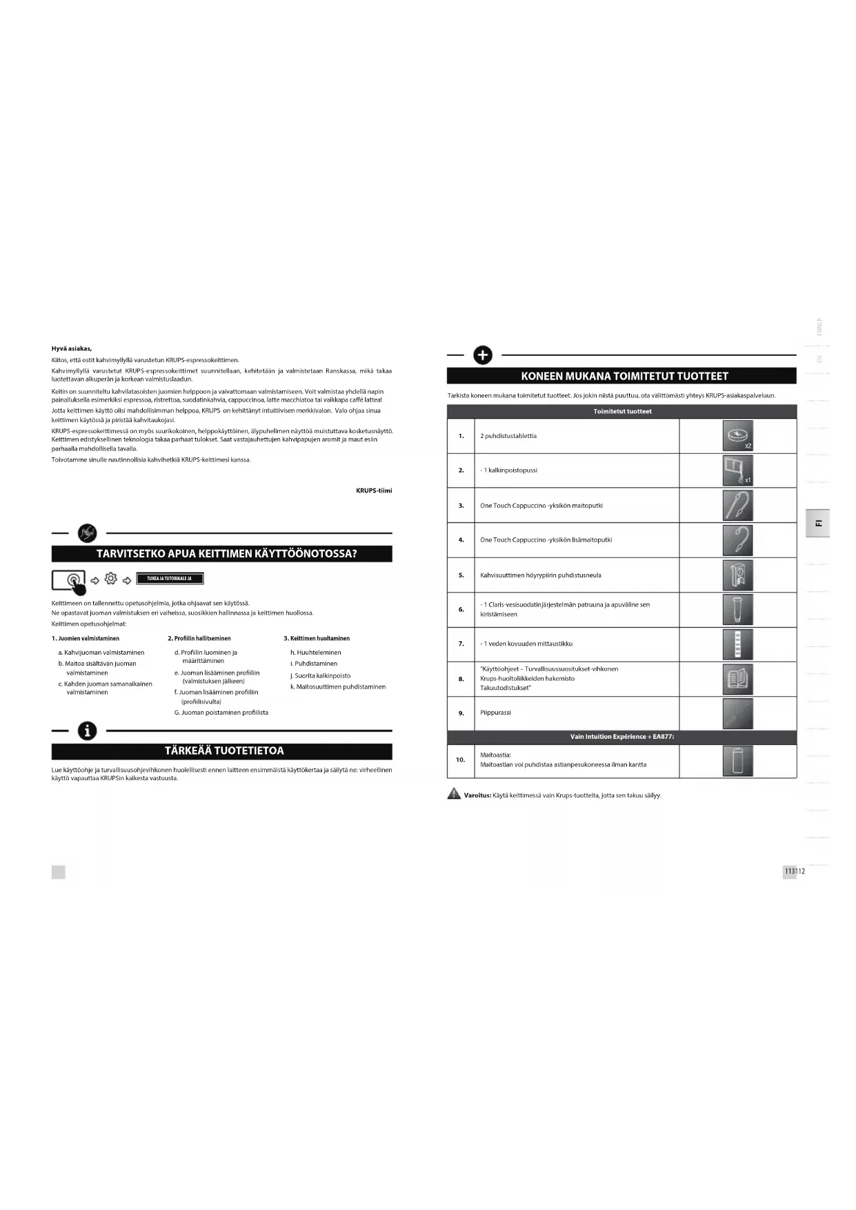 Lue käyttöohje ja turvallisuusohjevihkonen huolellisesti ennen laitteen ensimmäistä käyttökertaa ja säilytä ne: virheellinen käyttö vapauttaa KRUPSin kaikesta vastuusta.
