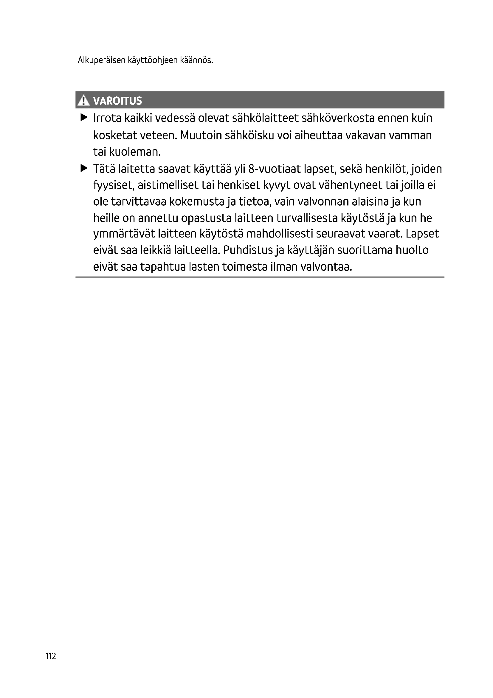 VAROITUS Irrota kaikki vedessä olevat sähkölaitteet sähköverkosta ennen kuin kosketat veteen. Muutoin sähköisku voi aiheuttaa vakavan vamman tai kuoleman. Tätä laitetta saavat käyttää yli 8-vuotiaat lapset, sekä henkilöt, joiden fyysiset, aistimelliset tai henkiset kyvyt ovat vähentyneet tai joilla ei ole tarvittavaa kokemusta ja tietoa, vain valvonnan alaisina ja kun heille on annettu opastusta laitteen turvallisesta käytöstä ja kun he ymmärtävät laitteen käytöstä mahdollisesti seuraavat vaarat. Lapset eivät saa leikkiä laitteella. Puhdistus ja käyttäjän suorittama huolto eivät saa tapahtua lasten toimesta ilman valvontaa.FI
