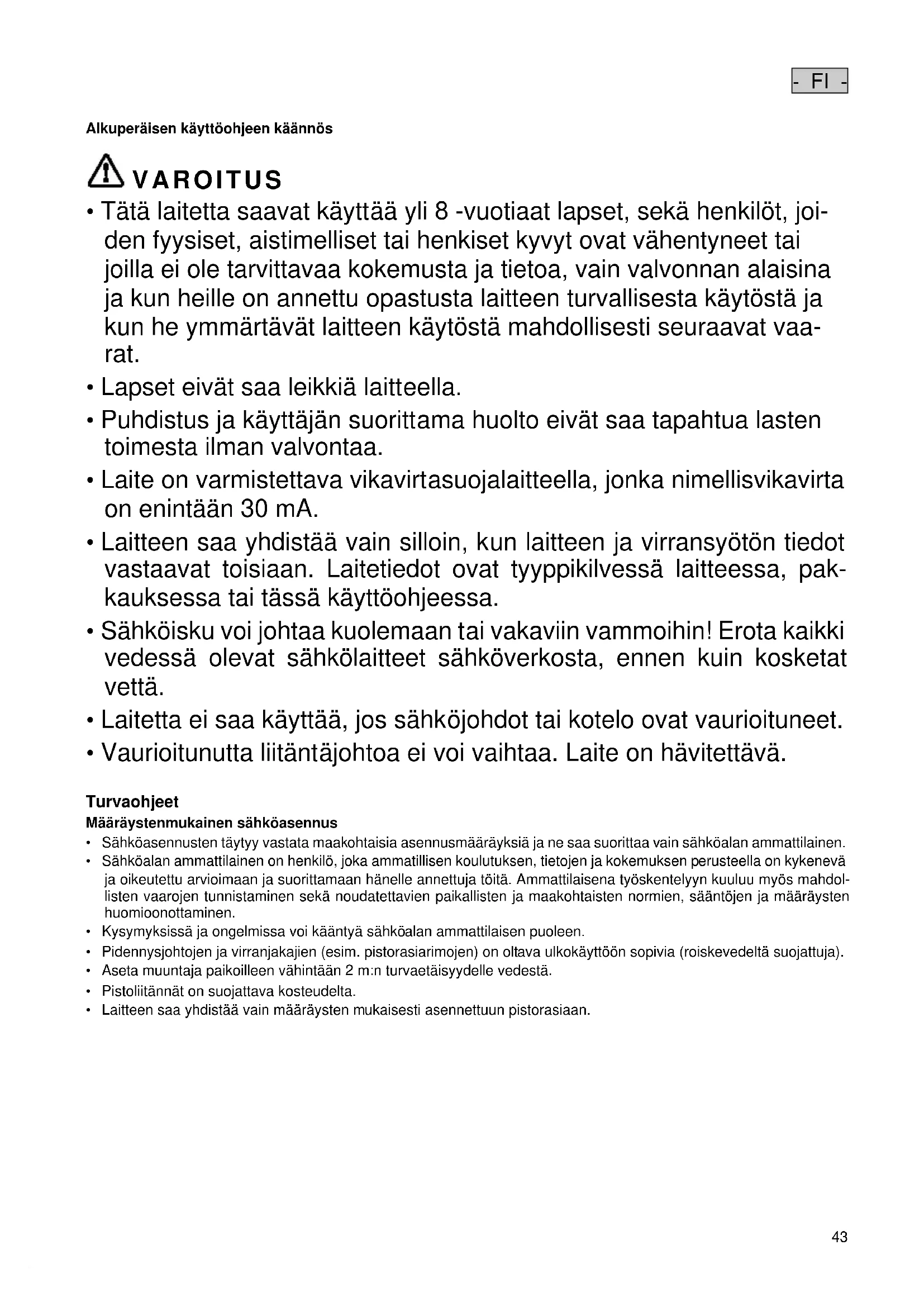 - Laite on varmistettava vikavirtasuojalaitteella, jonka nimellisvikavirta on enintään 30 mA.