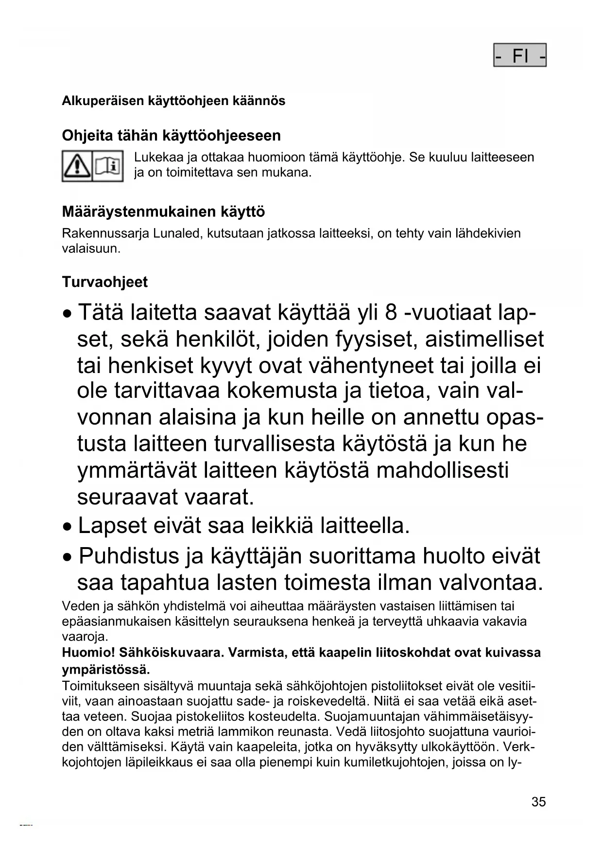 - Puhdistus ja käyttäjän suorittama huolto eivät saa tapahtua lasten toimesta ilman valvontaa. Veden ja sähkön yhdistelmä voi aiheuttaa määräysten vastaisen liittämisen tai epäasianmukaisen käsittelyn seurauksena henkeä ja terveyttä uhkaavia vakavia vaaroja. Huomio! Sähköiskuvaara. Varmista, että kaapelin liitoskohdat ovat kuivassa ympäristössä. Toimitukseen sisältyvä muuntaja sekä sähköjohtojen pistoliitokset eivät ole vesitii- viit, vaan ainoastaan suojattu sade- ja roiskevedeltä. Niitä ei saa vetää eikä aset- taa veteen. Suojaa pistokeliitos kosteudelta. Suojamuuntajan vähimmäisetäisyy- den on oltava kaksi metriä lammikon reunasta. Vedä liitosjohto suojattuna vaurioi- den välttämiseksi. Käytä vain kaapeleita, jotka on hyväksytty ulkokäyttöön. Verk- kojohtojen läpileikkaus ei saa olla pienempi kuin kumiletkujohtojen, joissa on ly-- FI -