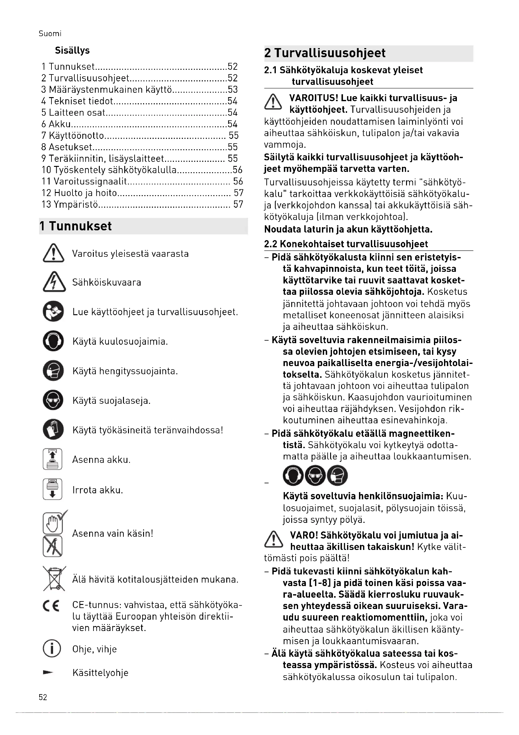 Käytä soveltuvia henkilönsuojaimia: Kuu losuojaimet, suojalasit, pölysuojain töissä, joissa syntyy pölyä. VARO! Sähkötyökalu voi jumiutua ja ai heuttaa äkillisen takaiskun! Kytke välit tömästi pois päältä! – Pidä tukevasti kiinni sähkötyökalun kah vasta [1-8] ja pidä toinen käsi poissa vaa ra-alueelta. Säädä kierrosluku ruuvauk sen yhteydessä oikean suuruiseksi. Vara udu suureen reaktiomomenttiin, joka voi aiheuttaa sähkötyökalun äkillisen käänty misen ja loukkaantumisvaaran. – Älä käytä sähkötyökalua sateessa tai kos teassa ympäristössä. Kosteus voi aiheuttaa sähkötyökalussa oikosulun tai tulipalon. Suomi 52– Odota, kunnes sähkötyökalu on pysähtynyt kokonaan, ennen kuin laitat koneen syr jään. Muuten käyttötarvike voi pureutua alustan pintaan ja aiheuttaa sähkötyökalun hallinnan menettämisen. – Vältä tahatonta päällekytkeytymistä. On nettomuusvaara, jos kannat sähkötyökalua sormi käynnistyskytkimellä. Kun et käytä sähkötyökalua, aseta kuljetuslukituksen kytkin [1-7] keskiasentoon. – Älä muuta tai lukitse käyttösäätimiä, esim. käynnistyskytkintä. – Käytä akkukäyttöistä sähkötyökalua vain asiaankuuluvien akkujen kanssa, ei verk kolaitteiden kanssa. Älä käytä muiden val mistajien latureita akkujen lataukseen. Jos käytät muita kuin valmistajan suositte lemia lisätarvikkeita, tämä voi johtaa säh köiskuun ja/tai vakaviin tapaturmiin. – Varoitus haitallisen valosäteilyn vaa rasta. Älä katso pitkäaikaisesti valonsä teeseen. Älä kohdista valonsädettä ihmis iin tai eläimiin. Optinen säteily voi vahin goittaa silmiä - [4]. – Käytä pölynpoistoa töissä, joissa syntyy pö lyä. – Älä käytä sellaisia käyttötarvikkeita tai li sävarusteita, joita valmistaja ei ole tar koittanut tai suositellut tälle sähkötyöka lulle. Yksistään se, että voit kiinnittää lisä varusteen tai käyttötarvikkeen sähkötyöka luun, ei takaa turvallista käyttöä. Louk kaantumisvaara sekä sähkötyökalun kulu minen voivat kasvaa ja työtulosten laatu saattaa heikentyä. – Tarvikkeen tyypistä ja käyttötavasta riip puen työkalusta saattaa irrota siruja, käyttötarvike tai käyttötarvikkeen paloja. Työkalun käytössä voi syntyä runsaasti pölyä ja odottamattomia liikkeitä. Käytä soveltuvia henkilönsuojaimia. Varaudu suu reen reaktiomomenttiin, joka voi aiheuttaa sähkötyökalun äkillisen kääntymisen ja loukkaantumisvaaran.