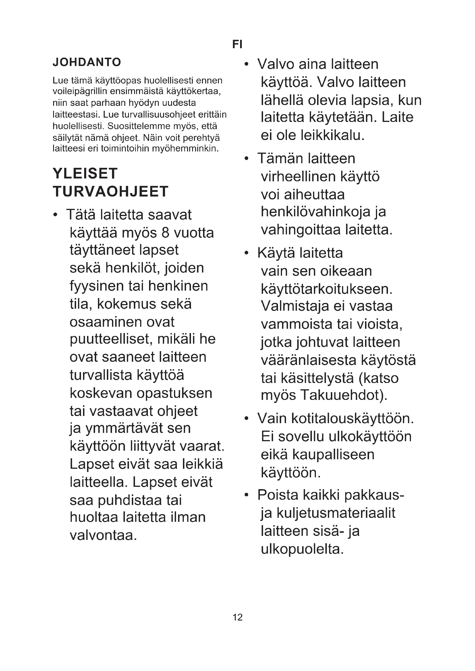JOHDANTO Lue tämä käyttöopas huolellisesti ennen voileipägrillin ensimmäistä käyttökertaa, niin saat parhaan hyödyn uudesta laitteestasi. Lue turvallisuusohjeet erittäin huolellisesti. Suosittelemme myös, että säilytät nämä ohjeet. Näin voit perehtyä laitteesi eri toimintoihin myöhemminkin. YLEISET TURVAOHJEET