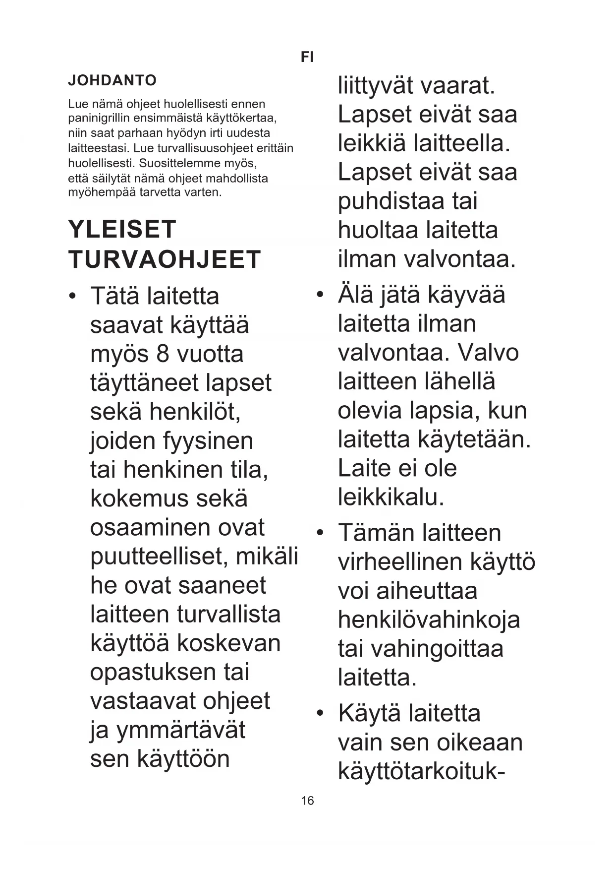 JOHDANTO Lue nämä ohjeet huolellisesti ennen paninigrillin ensimmäistä käyttökertaa, niin saat parhaan hyödyn irti uudesta laitteestasi. Lue turvallisuusohjeet erittäin huolellisesti. Suosittelemme myös, että säilytät nämä ohjeet mahdollista myöhempää tarvetta varten. YLEISET TURVAOHJEET