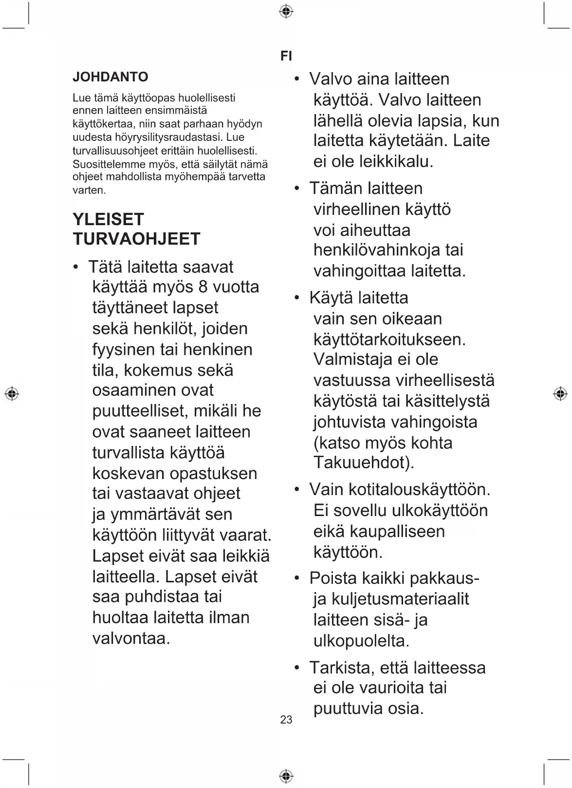 - Tätä laitetta saavat käyttää myös 8 vuotta täyttäneet lapset sekä henkilöt, joiden fyysinen tai henkinen tila, kokemus sekä osaaminen ovat puutteelliset, mikäli he ovat saaneet laitteen turvallista käyttöä koskevan opastuksen tai vastaavat ohjeet ja ymmärtävät sen käyttöön liittyvät vaarat. Lapset eivät saa leikkiä laitteella. Lapset eivät saa puhdistaa tai huoltaa laitetta ilman valvontaa.