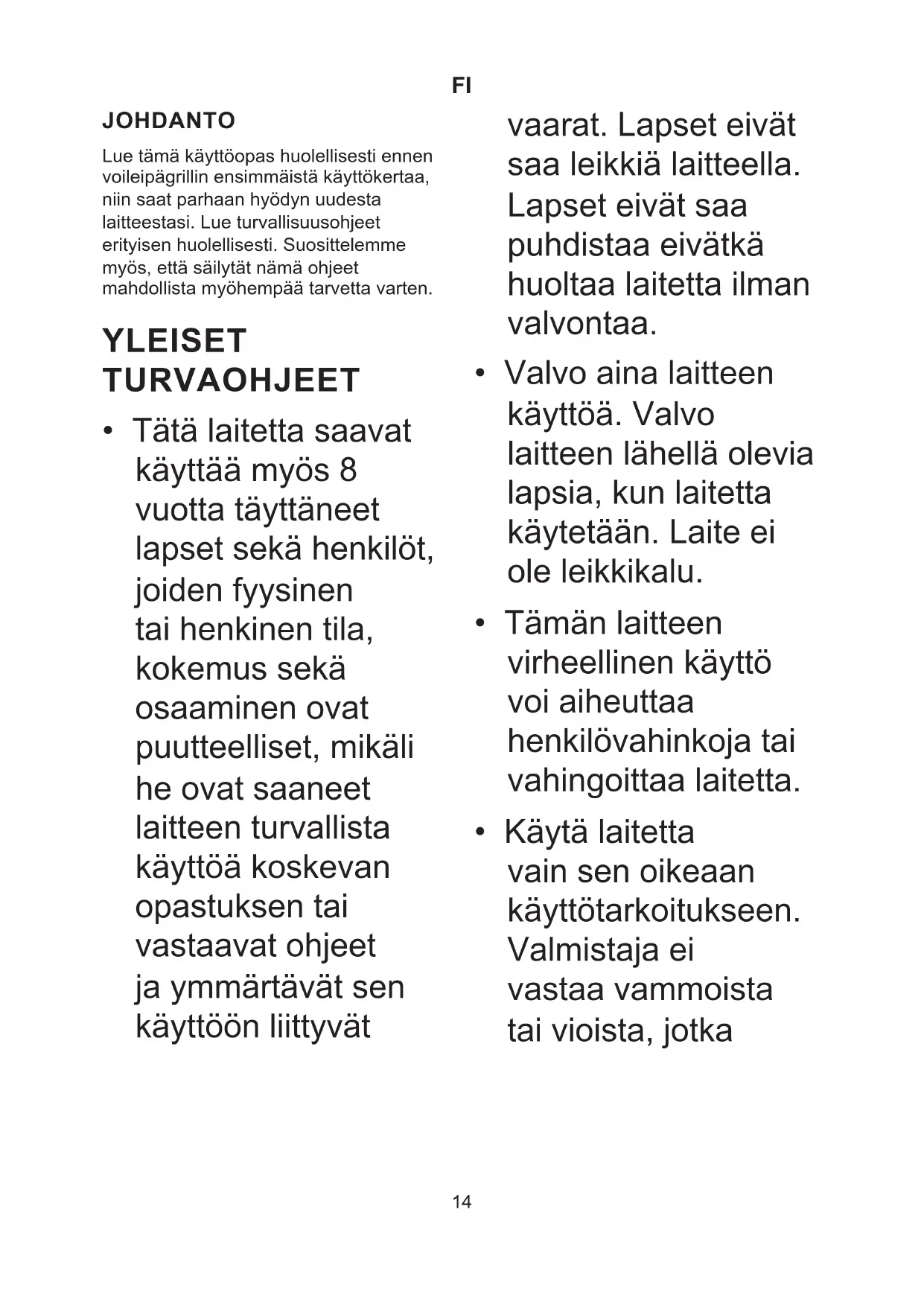JOHDANTO Lue tämä käyttöopas huolellisesti ennen voileipägrillin ensimmäistä käyttökertaa, niin saat parhaan hyödyn uudesta laitteestasi. Lue turvallisuusohjeet erityisen huolellisesti. Suosittelemme myös, että säilytät nämä ohjeet mahdollista myöhempää tarvetta varten. YLEISET TURVAOHJEET