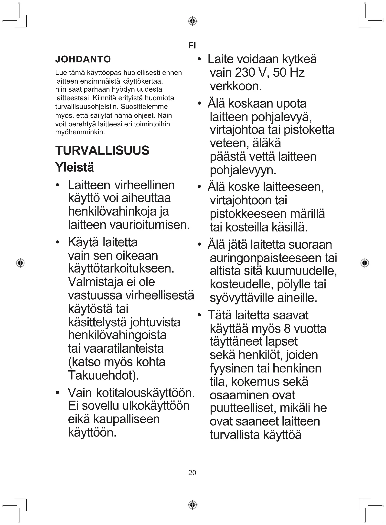 - Tätä laitetta saavat käyttää myös 8 vuotta täyttäneet lapset sekä henkilöt, joiden fyysinen tai henkinen tila, kokemus sekä osaaminen ovat puutteelliset, mikäli he ovat saaneet laitteen turvallista käyttöä23