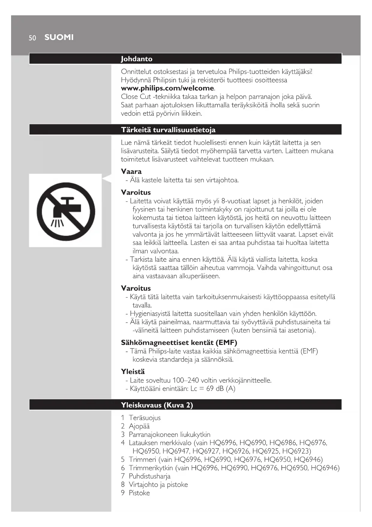 ESPAÑOL 47Reciclaje - Este símbolo en un producto signica que el producto cumple con la directiva europea 2012/19/UE. - Este símbolo signica que el producto contiene una batería recargable integrada cubierta por la directiva europea 2006/66/CE, que no se debe tirar con la basura normal del hogar. Le recomendamos encarecidamente que lleve el producto a un punto de recogida ocial o a un centro de servicio Philips para que un profesional extraiga la batería recargable. - Infórmese sobre el sistema local de recogida selectiva de baterías recargables y productos eléctricos y electrónicos. Siga la normativa local y no deseche el producto ni la batería recargable con la basura normal del hogar. El correcto desecho de los productos antiguos y las baterías recargables ayuda a evitar consecuencias negativas para el medio ambiente y la salud humana. Cómo extraer la batería recargable Quite la batería únicamente cuando deseche la afeitadora. Asegúrese de que la batería esté completamente descargada cuando la quite del aparato. 1 Apague la afeitadora. Desenchufe la clavija de red de la toma de corriente y quite la clavija del aparato de la afeitadora. 2 Deje que la afeitadora funcione hasta que se pare. 3 Desatornille los dos tornillos de la parte posterior de la afeitadora y ábrala. 4 Corte las tiras de la batería con un cúter y separe la batería de la tira pegada. Lastirasmetálicasdelabateríaestánmuyaladas. No conecte la afeitadora a la red una vez quitada la batería. Garantía y asistencia Si necesita ayuda o más información, visite www.philips.com/support o lea el folleto de garantía mundial independiente. Restricciones de la garantía Los cabezales de afeitado (cuchillas y protectores) no están cubiertos por las condiciones de la garantía internacional debido a que están sujetos a desgaste. ESPAÑOL48Guía de resolución de problemas En este capítulo se resumen los problemas más frecuentes que pueden surgir con el aparato. Si no puede resolver el problema con la siguiente información, visite www.philips.com/support para consultar una lista de preguntas más frecuentes o póngase en contacto con el Servicio de Atención al Cliente en su país. Problema Posible causa Solución Menor rendimiento en el afeitado. Los cabezales de afeitado están sucios. La afeitadora no se ha limpiado lo suciente o hace mucho tiempo que no se limpia. Limpie bien el aparato antes de seguir afeitándose. Consulte el capítulo “Limpieza y mantenimiento”. Hay pelos largos obstruyendo los cabezales de afeitado. Limpie las cuchillas y los protectores con el cepillo de limpieza suministrado. Consulte la sección “Cada mes: cabezales de afeitado” del capítulo “Limpieza y mantenimiento”. Los cabezales de afeitado están gastados o deteriorados. Cambie cada 2 años los cabezales de afeitado para conseguir óptimos resultados. Consulte el capítulo “Sustitución”. La afeitadora no funciona cuando deslizo el botón de encendido/ apagado hacia arriba. La batería recargable está descargada. Cargue la batería. Consulte el capítulo “Carga”. La afeitadora no está conectada a la red. Enchufe la clavija de red a la toma de corriente. La piel se irrita. Su piel necesita tiempo para acostumbrarse al sistema de afeitado Philips. Es normal que la piel se irrite durante las primeras 2-3 semanas de uso. Después de este periodo, suele desaparecer la irritación de la piel. ESPAÑOL 4950 Johdanto Onnittelut ostoksestasi ja tervetuloa Philips-tuotteiden käyttäjäksi! Hyödynnä Philipsin tuki ja rekisteröi tuotteesi osoitteessa www.philips.com/welcome. Close Cut -tekniikka takaa tarkan ja helpon parranajon joka päivä. Saat parhaan ajotuloksen liikuttamalla teräyksiköitä iholla sekä suorin vedoin että pyörivin liikkein. Tärkeitä turvallisuustietoja Lue nämä tärkeät tiedot huolellisesti ennen kuin käytät laitetta ja sen lisävarusteita. Säilytä tiedot myöhempää tarvetta varten. Laitteen mukana toimitetut lisävarusteet vaihtelevat tuotteen mukaan. Vaara - Älä kastele laitetta tai sen virtajohtoa. Varoitus - Laitetta voivat käyttää myös yli 8-vuotiaat lapset ja henkilöt, joiden fyysinen tai henkinen toimintakyky on rajoittunut tai joilla ei ole kokemusta tai tietoa laitteen käytöstä, jos heitä on neuvottu laitteen turvallisesta käytöstä tai tarjolla on turvallisen käytön edellyttämä valvonta ja jos he ymmärtävät laitteeseen liittyvät vaarat. Lapset eivät saa leikkiä laitteella. Lasten ei saa antaa puhdistaa tai huoltaa laitetta ilman valvontaa. - Tarkista laite aina ennen käyttöä. Älä käytä viallista laitetta, koska käytöstä saattaa tällöin aiheutua vammoja. Vaihda vahingoittunut osa aina vastaavaan alkuperäiseen. Varoitus - Käytä tätä laitetta vain tarkoituksenmukaisesti käyttöoppaassa esitetyllä tavalla. - Hygieniasyistä laitetta suositellaan vain yhden henkilön käyttöön. - Älä käytä paineilmaa, naarmuttavia tai syövyttäviä puhdistusaineita tai -välineitä laitteen puhdistamiseen (kuten bensiiniä tai asetonia). Sähkömagneettiset kentät (EMF) - Tämä Philips-laite vastaa kaikkia sähkömagneettisia kenttiä (EMF) koskevia standardeja ja säännöksiä. Yleistä - Laite soveltuu 100–240 voltin verkkojännitteelle. - Käyttöääni enintään: Lc = 69 dB (A) Yleiskuvaus (Kuva 2) 1 Teräsuojus 2 Ajopää 3 Parranajokoneen liukukytkin 4 Latauksen merkkivalo (vain HQ6996, HQ6990, HQ6986, HQ6976, HQ6950, HQ6947, HQ6927, HQ6926, HQ6925, HQ6923) 5 Trimmeri (vain HQ6996, HQ6990, HQ6976, HQ6950, HQ6946) 6 Trimmerikytkin (vain HQ6996, HQ6990, HQ6976, HQ6950, HQ6946) 7 Puhdistusharja 8 Virtajohto ja pistoke 9 Pistoke SUOMILataaminen Lataa laite - ennen ensimmäistä käyttökertaa ja aina, kun laitetta ei ole käytetty pitkään aikaan - kun moottori pysähtyy tai alkaa käydä hitaammin. Kun lataat parranajokoneen ensimmäisen kerran tai pitkän käyttötauon jälkeen, voit optimoida akun tehon seuraavasti: 1 