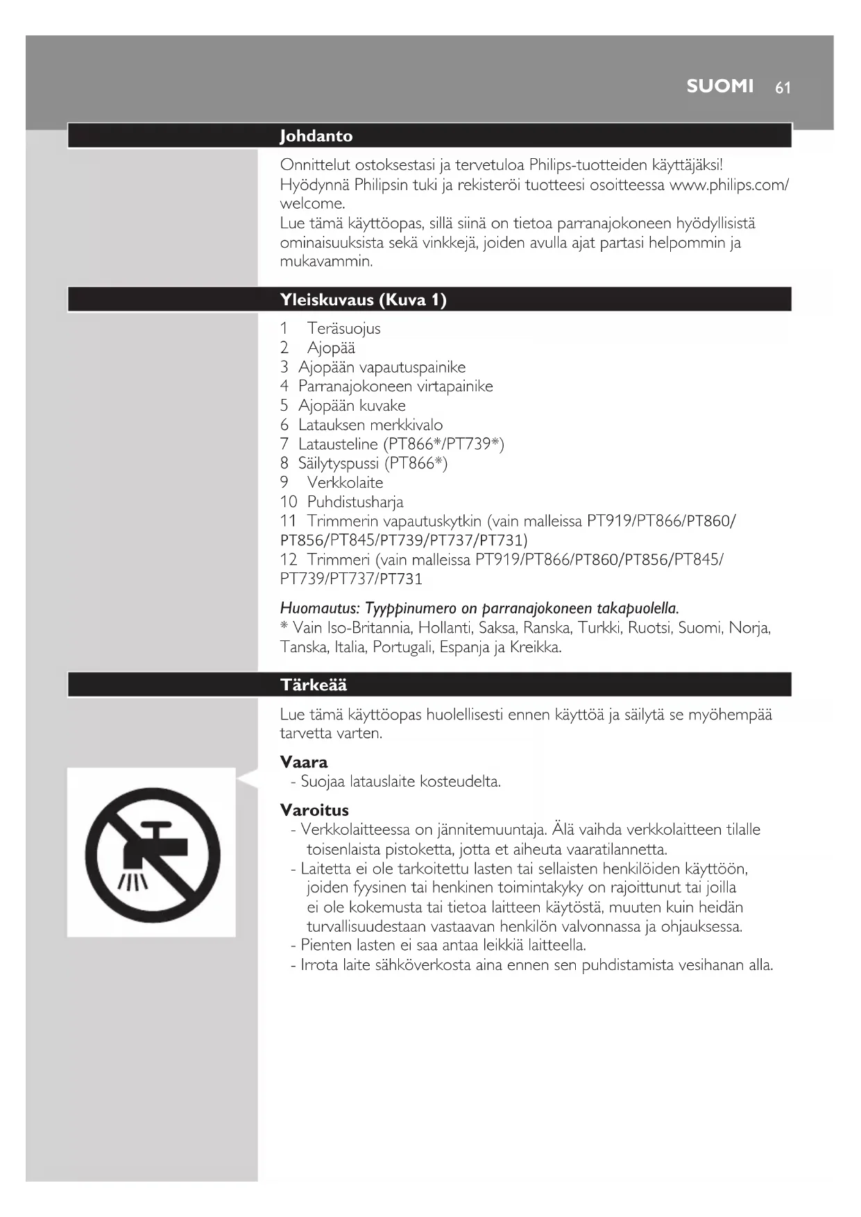 - Vain Iso-Britannia, Hollanti, Saksa, Ranska, Turkki, Ruotsi, Suomi, Norja, Tanska, Italia, Portugali, Espanja ja Kreikka. Tärkeää Lue tämä käyttöopas huolellisesti ennen käyttöä ja säilytä se myöhempää tarvetta varten. Vaara - Suojaa latauslaite kosteudelta. Varoitus - Verkkolaitteessa on jännitemuuntaja. Älä vaihda verkkolaitteen tilalle toisenlaista pistoketta, jotta et aiheuta vaaratilannetta. - Laitetta ei ole tarkoitettu lasten tai sellaisten henkilöiden käyttöön, joiden fyysinen tai henkinen toimintakyky on rajoittunut tai joilla ei ole kokemusta tai tietoa laitteen käytöstä, muuten kuin heidän turvallisuudestaan vastaavan henkilön valvonnassa ja ohjauksessa. - Pienten lasten ei saa antaa leikkiä laitteella. - Irrota laite sähköverkosta aina ennen sen puhdistamista vesihanan alla. SUOMIVaroitus - Älä upota parranajokonetta veteen. - Älä käytä parranajokonetta kylvyssä tai suihkussa. - Huuhtele parranajokone korkeintaan 80-asteisella vedellä. - Ole varovainen kuuman veden kanssa. Varmista aina, ettei vesi ole liian kuumaa, ettet polta käsiäsi. - Parranajokone ei ole konepesunkestävä. - Parranajokoneen alaosassa olevasta liittimestä saattaa vuotaa vettä huuhtelun yhteydessä. Tämä on normaalia eikä siitä aiheudu vaaraa, koska kaikki elektroniset osat ovat tiiviissä virtayksikössä parranajokoneen sisällä. - Älä käytä parranajokonetta, verkkolaitetta tai muuta osaa, jos se on vahingoittunut, koska se saattaa aiheuttaa vammoja. Vaihda vahingoittuneen verkkolaitteen, laturin tai osan tilalle aina alkuperäisen tyyppinen osa. - Käytä, lataa ja säilytä laitetta 10–35 °C:n lämpötilassa. - Pidä ja käytä parranajokonetta aina nesteenkestävällä alustalla. - Käytä vain mukana toimitettua sovitinta, laturia ja lisätarvikkeita. - Laita teräsuojus parranajokoneeseen aina käytön jälkeen, jotta teräyksiköt eivät vahingoittuisi ja ne pysyisivät puhtaana. Vastaavuus standardien kanssa - Tämä Philips-laite vastaa kaikkia sähkömagneettisia kenttiä (EMF) koskevia standardeja ja säännöksiä, ja se voidaan puhdistaa turvallisesti juoksevalla vedellä. Yleistä - Laitteessa on automaattinen jännitteenvalinta, joten laite soveltuu